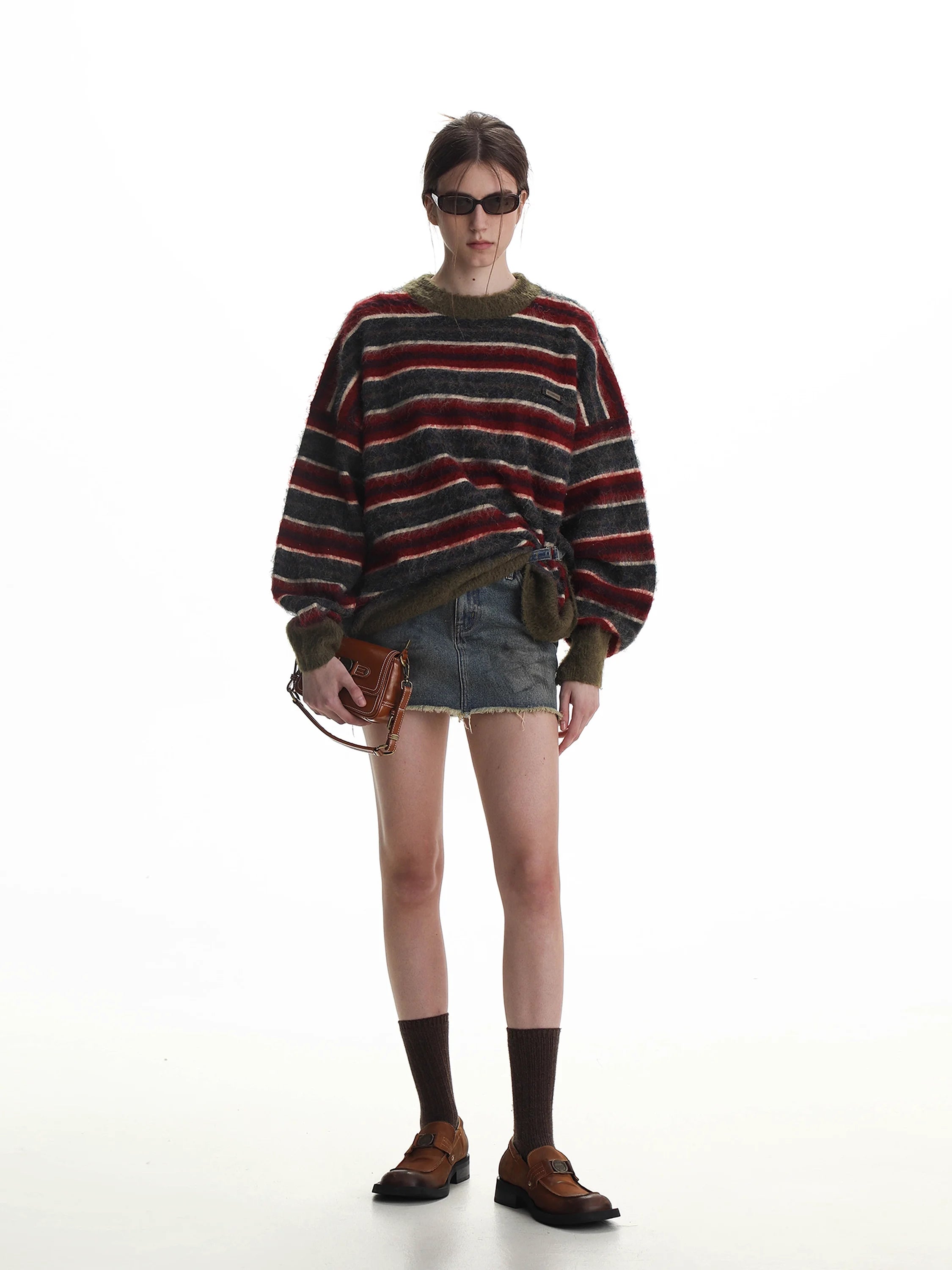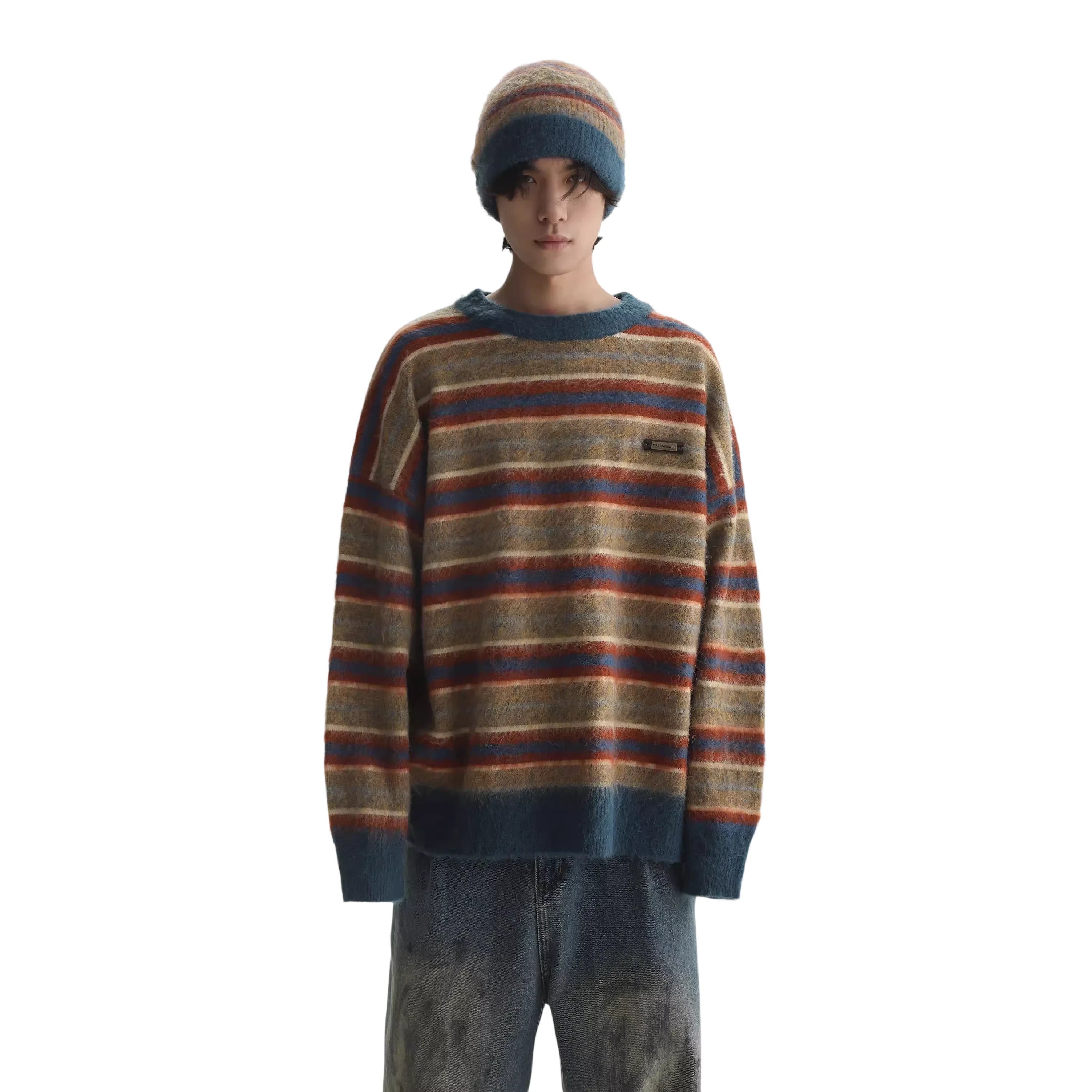Stay warm and stylish in this relaxed-fit pullover sweater for men, featuring bold horizontal stripes in autumn-inspired shades of brown, orange, beige, and dark teal. Crafted from cozy knit fabric, this oversized sweater includes distressed frayed details at the neckline and cuffs for a vintage-inspired look. Solid dark teal trim at the hem and wrists adds contrast and structure. A small stitched logo patch on the chest adds subtle flair, making it ideal for casual, laid-back outfits.