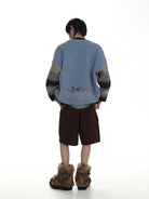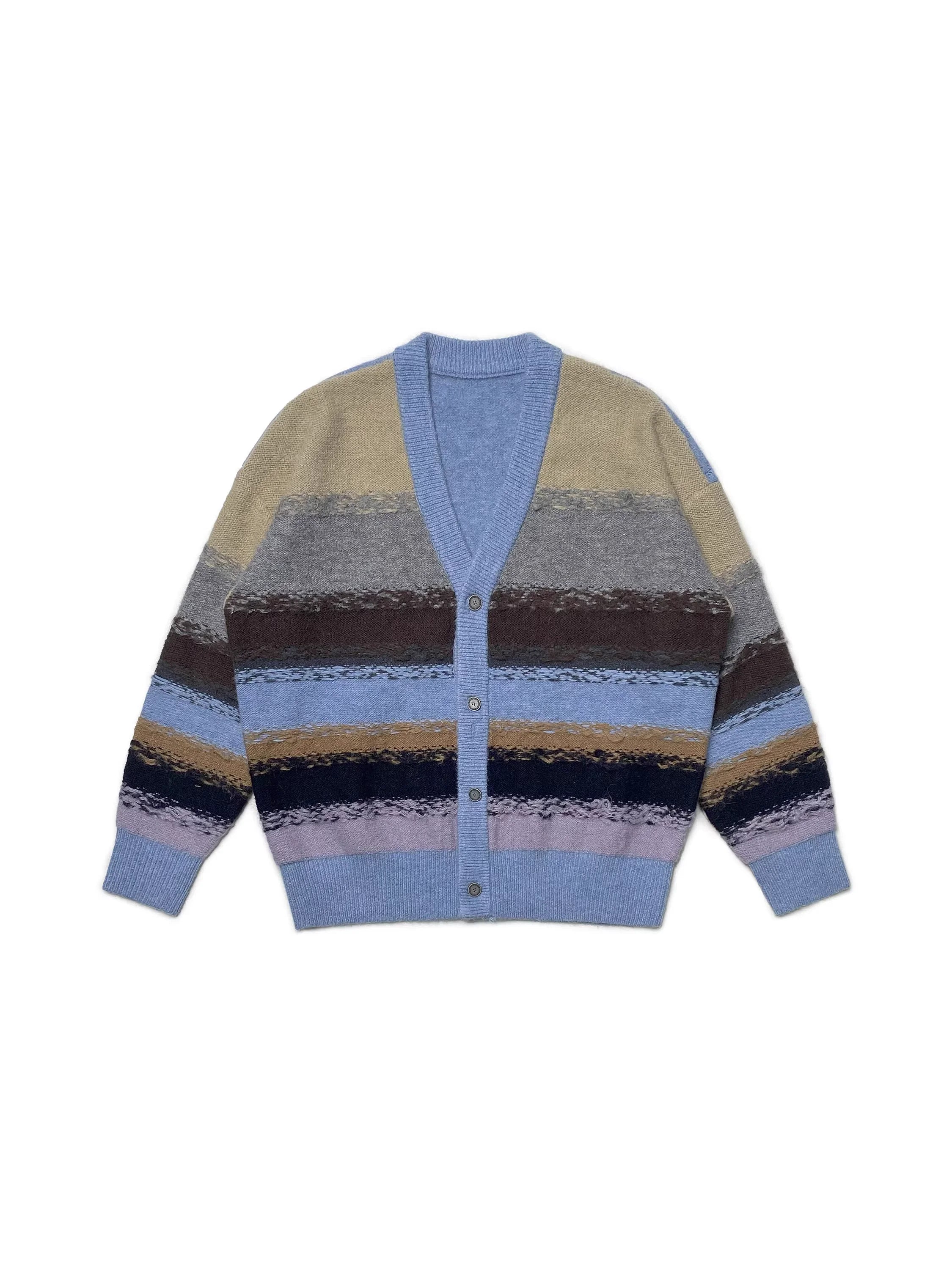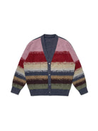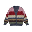 This unisex cardigan features a vibrant jacquard knit design with horizontal stripes in muted tones of pink, red, cream, navy blue, olive green, and brown. Designed with a deep V-neckline, the cardigan includes a grey button placket and coordinating ribbed cuffs and hem. Its textured knit offers a cozy look perfect for casual layering.