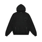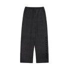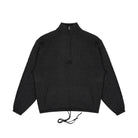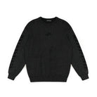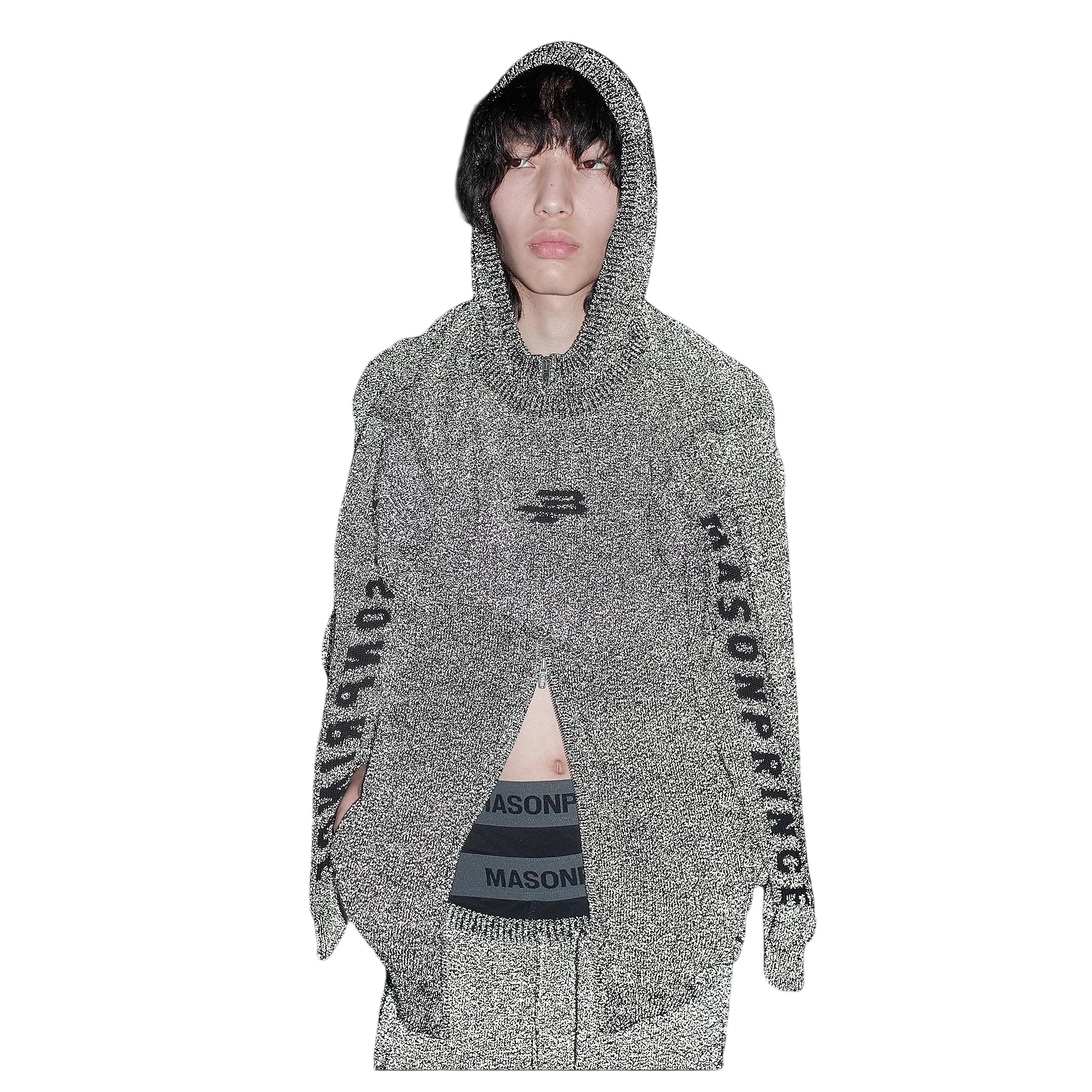This coordinated knitwear set includes a speckled grey and black hooded sweater paired with matching pants, designed for both comfort and high-street style. The oversized hoodie features bold text detailing along the sleeves and an asymmetrical front slit that adds an avant-garde edge. Also included is a windproof face mask, completing the modern, urban aesthetic. Worn here by a male model, the ensemble delivers functionality and distinct fashion flair.
