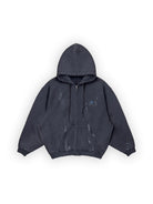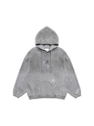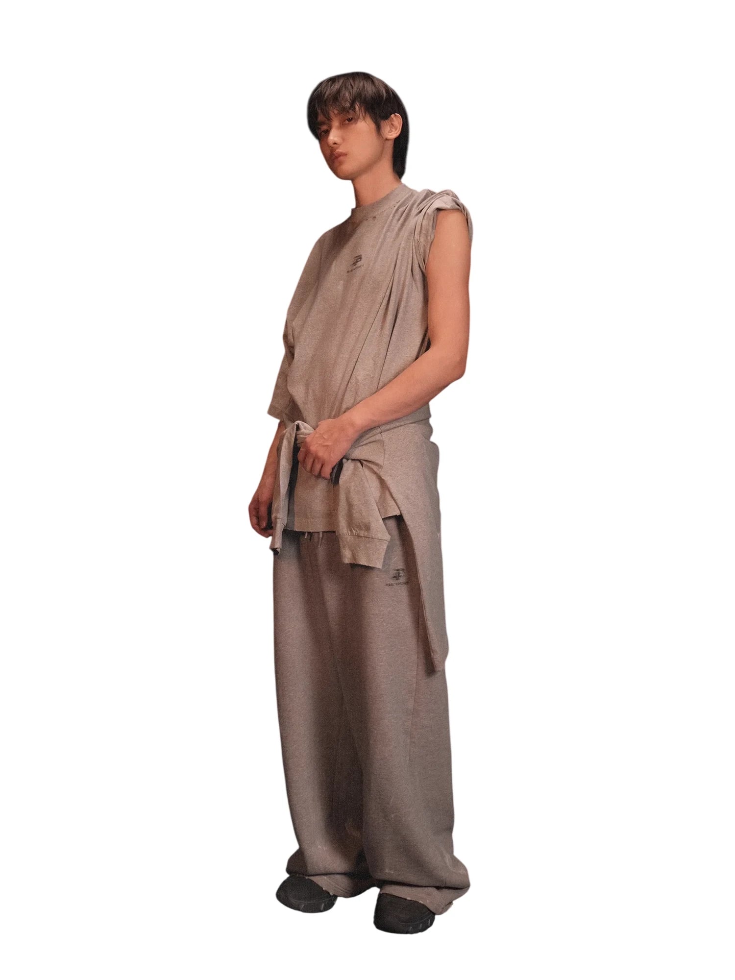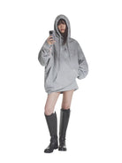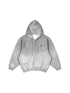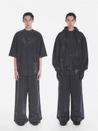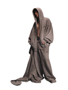 This men's loungewear set includes an oversized zip-up hoodie and matching wide-leg sweatpants designed in a transitional, high-fashion silhouette. The gray hoodie features a large hood, open front, and side pockets, while the floor-grazing sweatpants offer a high waist with thick drawstring closure. Both pieces are crafted from a soft, heavyweight fleece material with a minimalist tone-on-tone design, perfect for achieving a dramatic yet relaxed look.