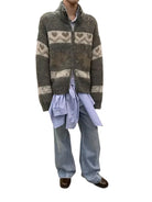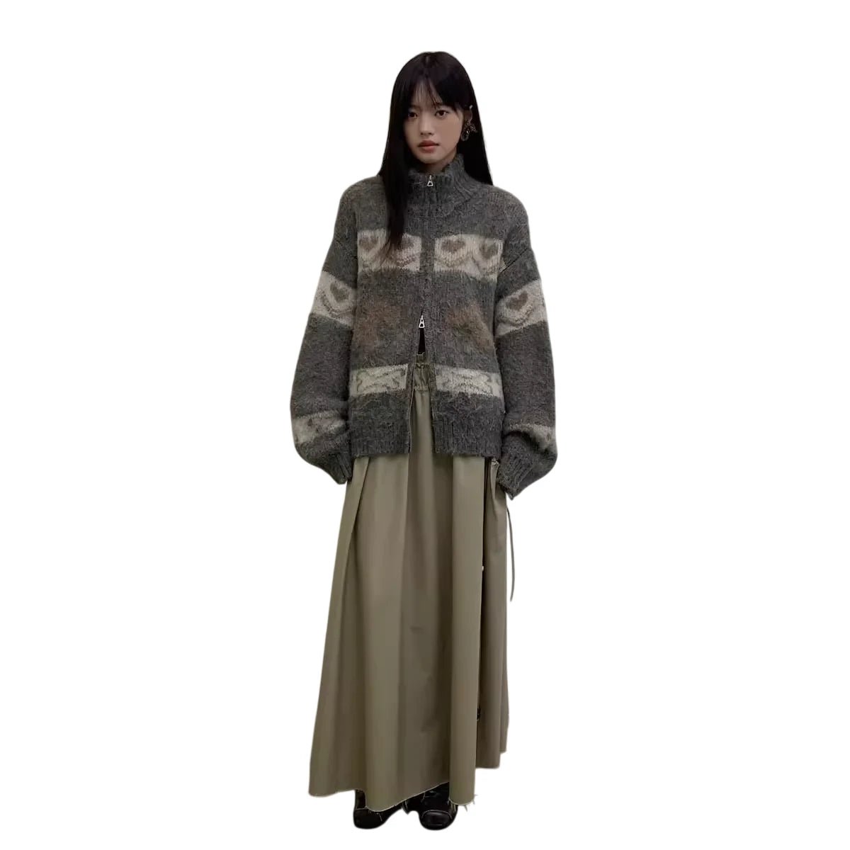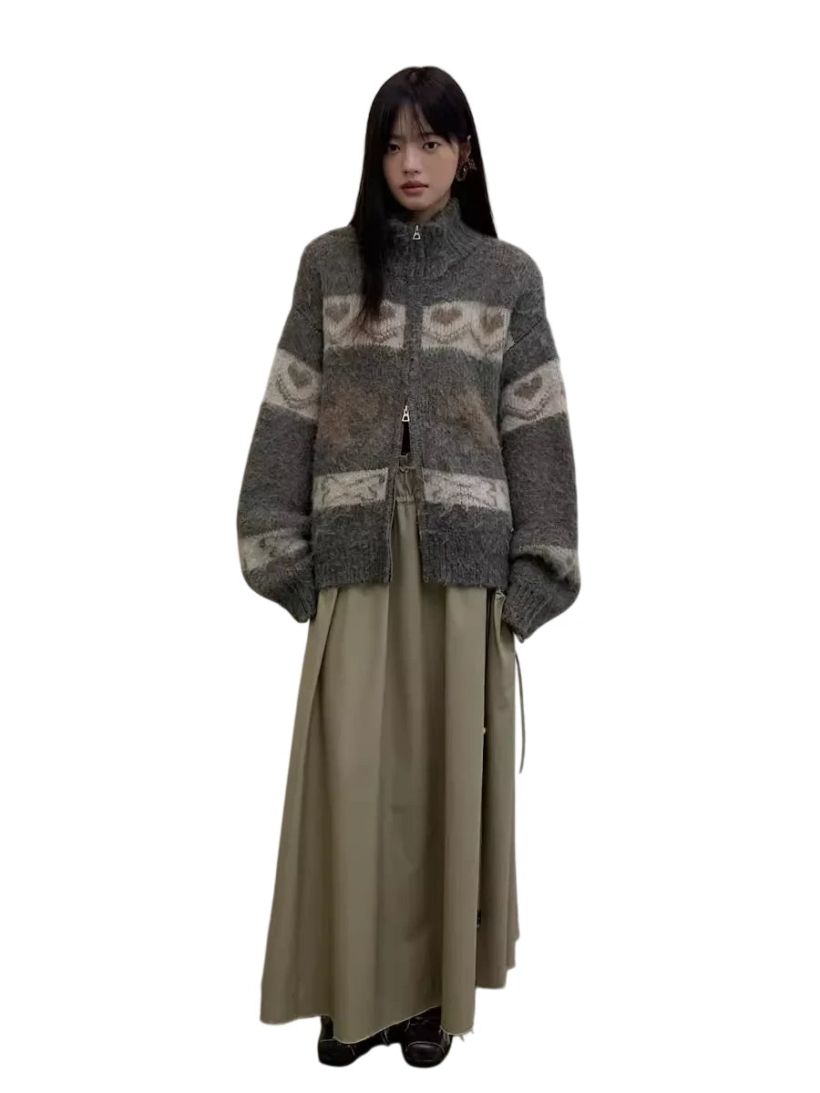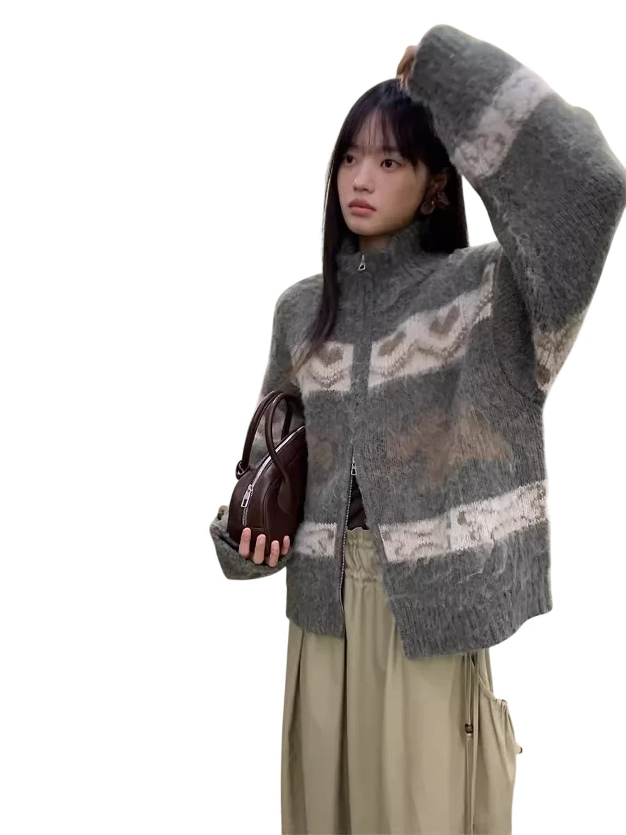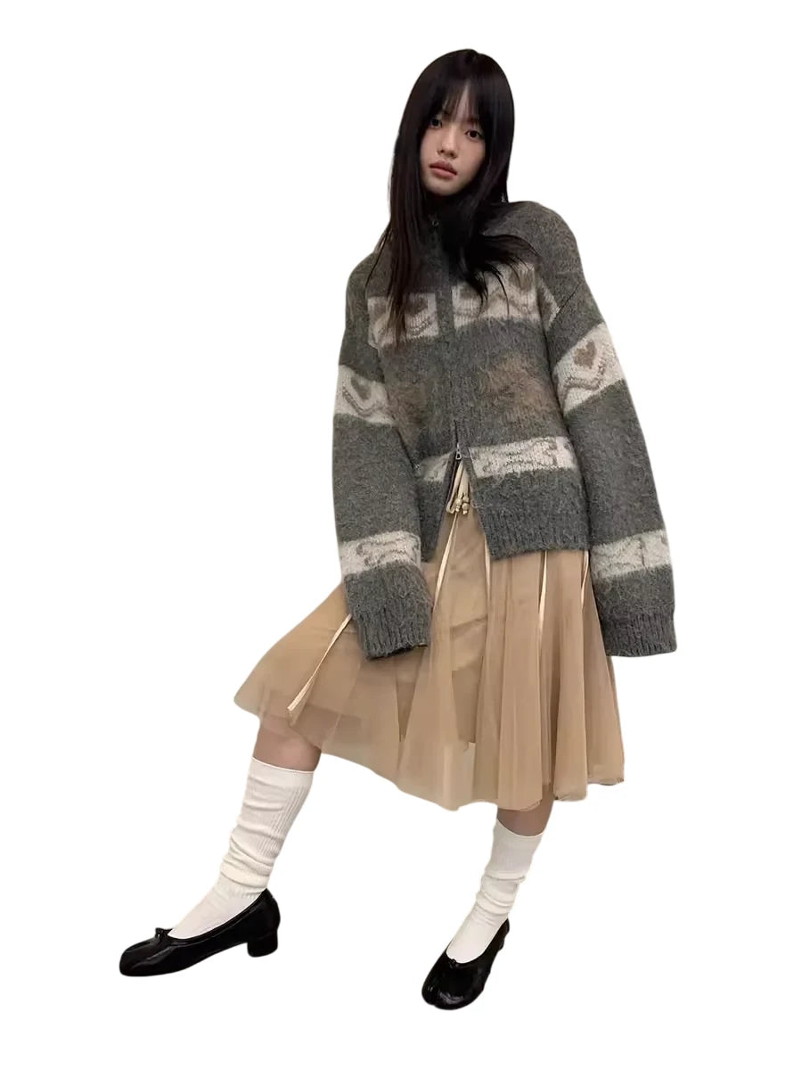 Stay cozy and stylish with this women's oversized fleece cardigan sweater. Designed with a classic Fair Isle jacquard pattern in soft tones of grey, white, and beige, it features a zip-up front, high neckline, and dropped shoulders for a relaxed, comfortable fit. Ideal for layering during colder seasons, this cardigan brings timeless charm and warming comfort to any outfit.