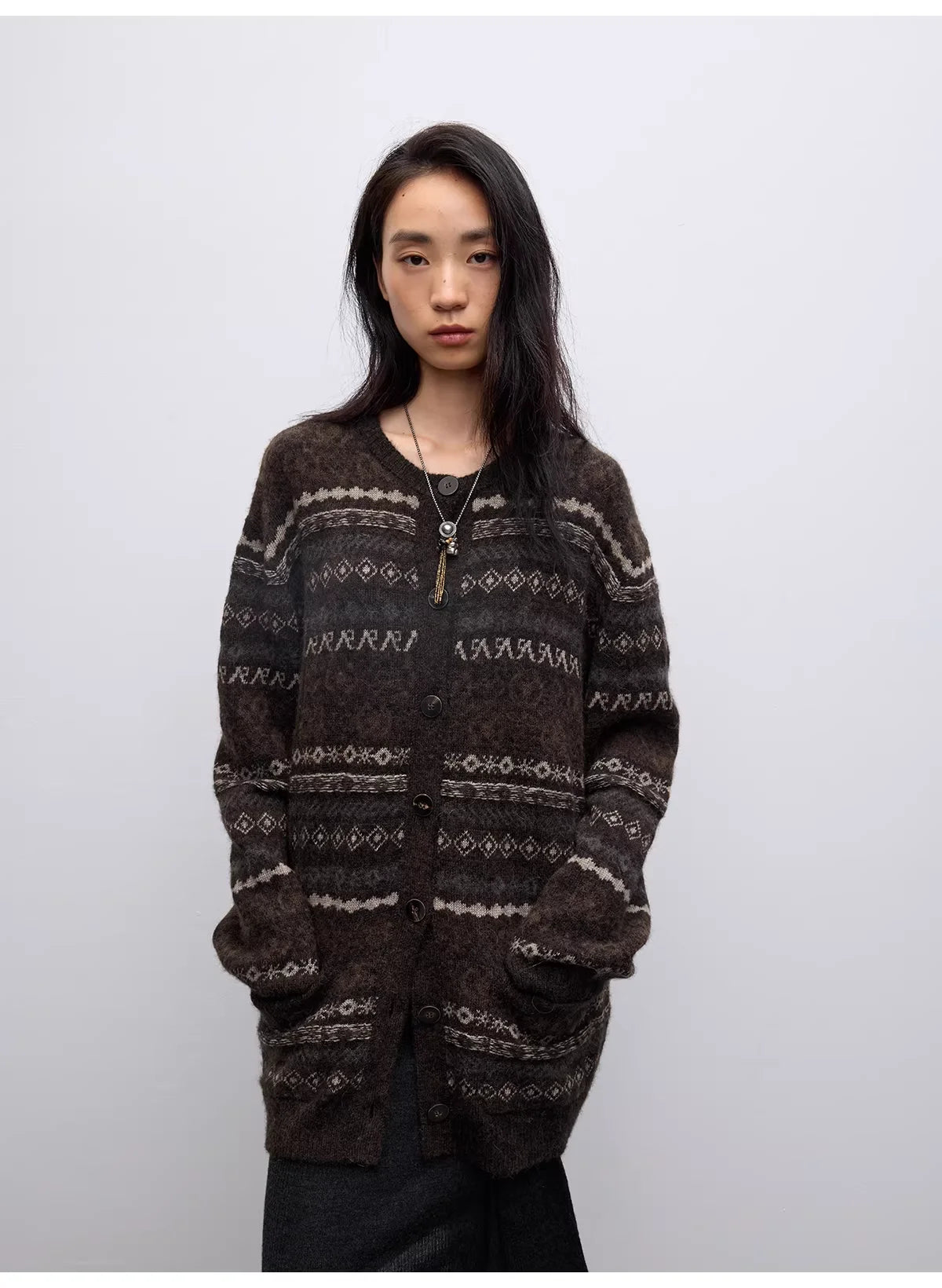 This women's thick knit cardigan features a classic Fair Isle pattern in warm earth tones of beige, off-white, and light brown set against a rich dark brown background. Crafted from a cozy blend of lamb wool and camel hair, it offers a soft, warm feel perfect for cooler seasons. With long sleeves, a round neckline, and a relaxed fit, this traditional-style sweater combines artisanal detail with everyday comfort.