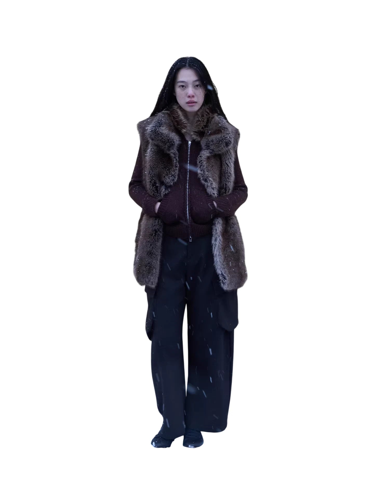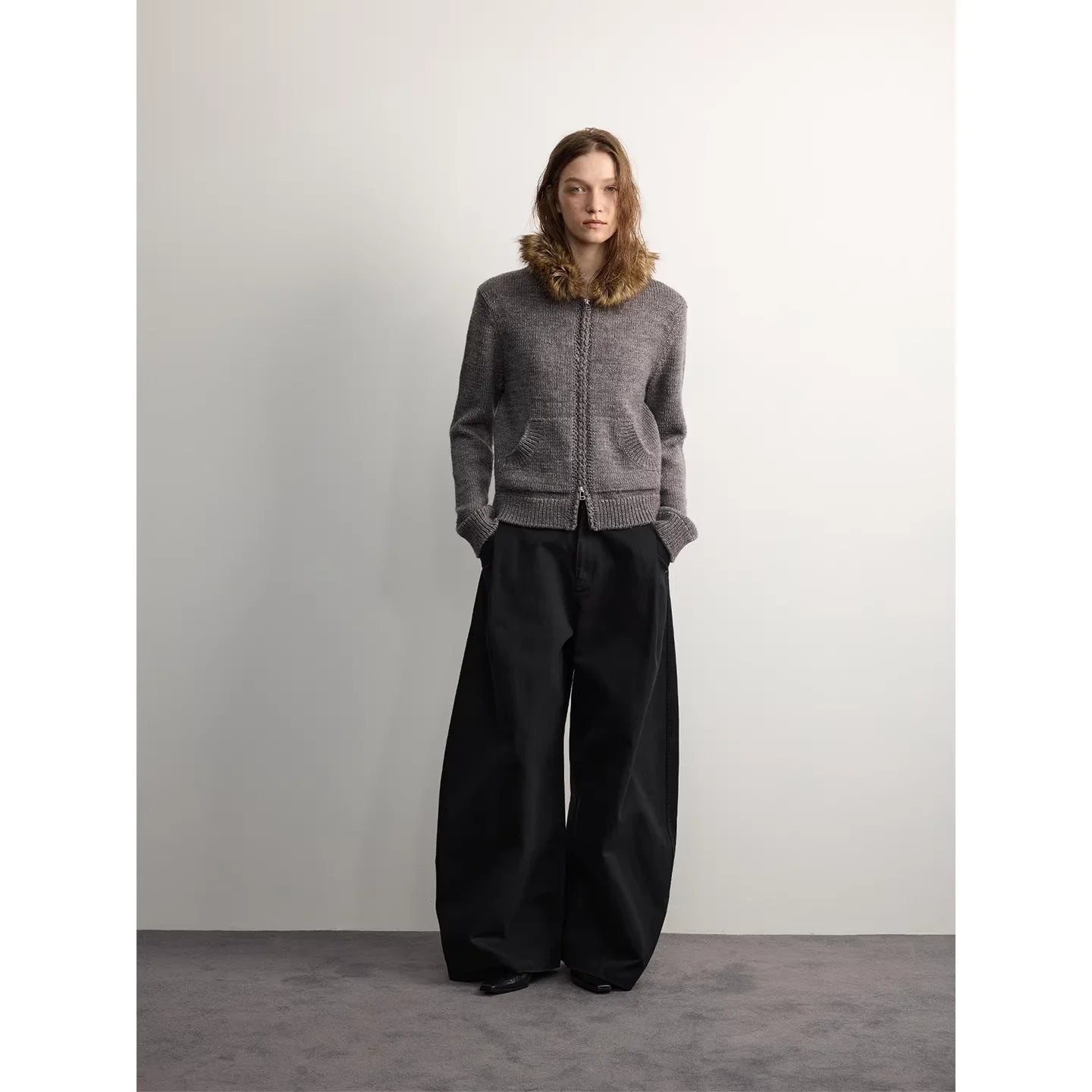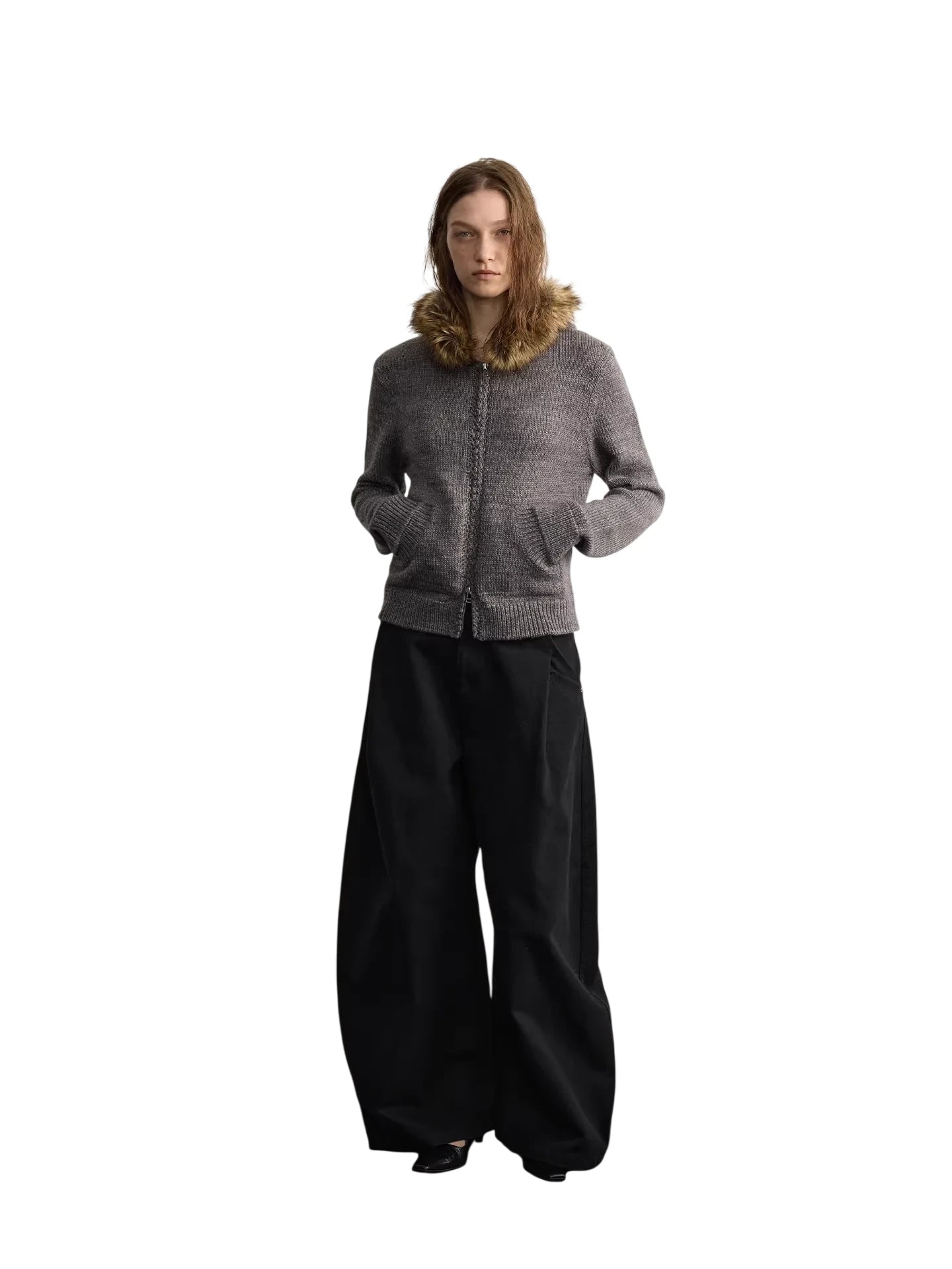 Stay warm and stylish with this women's wool blend hooded cardigan, featuring a luxurious detachable faux-fur collar for added comfort and flair. Designed with a cozy knit texture, it includes a functional double zipper and a relaxed fit for effortless layering. This versatile zip-up cardigan is perfect for colder days, blending comfort and contemporary fashion in a streetwear-inspired silhouette.