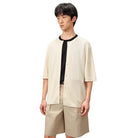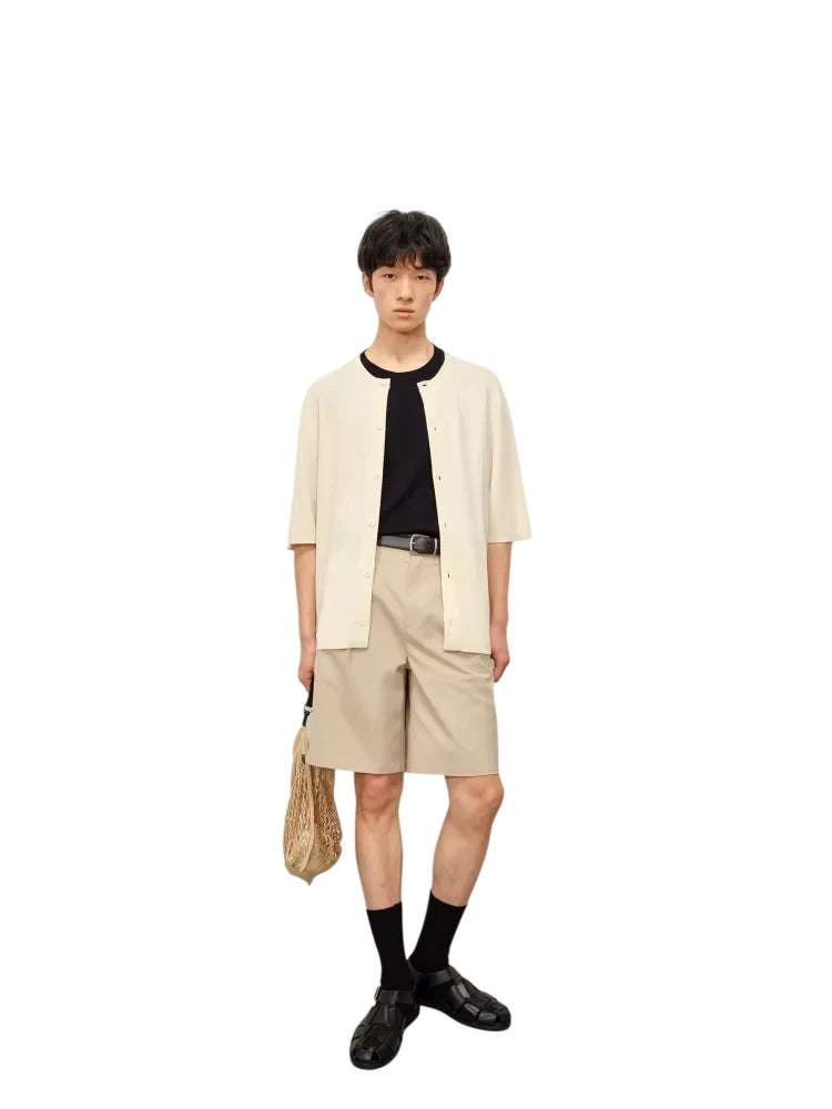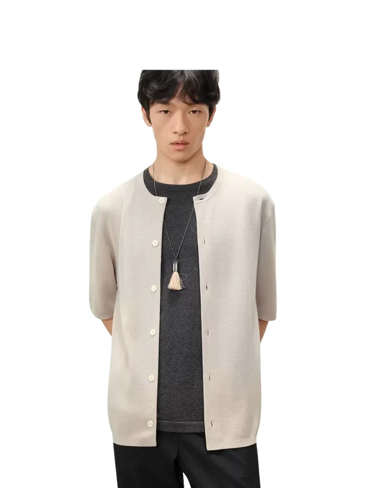 This men's short sleeve open cardigan is crafted from soft Lyocell Tencel fabric, offering a breathable and lightweight feel that's perfect for warmer weather. Designed with a round neck and button-up front, it layers effortlessly over a t-shirt for a smart casual look. The relaxed drape and minimalist style deliver timeless comfort with understated elegance, ideal for everyday wear or laid-back outings.