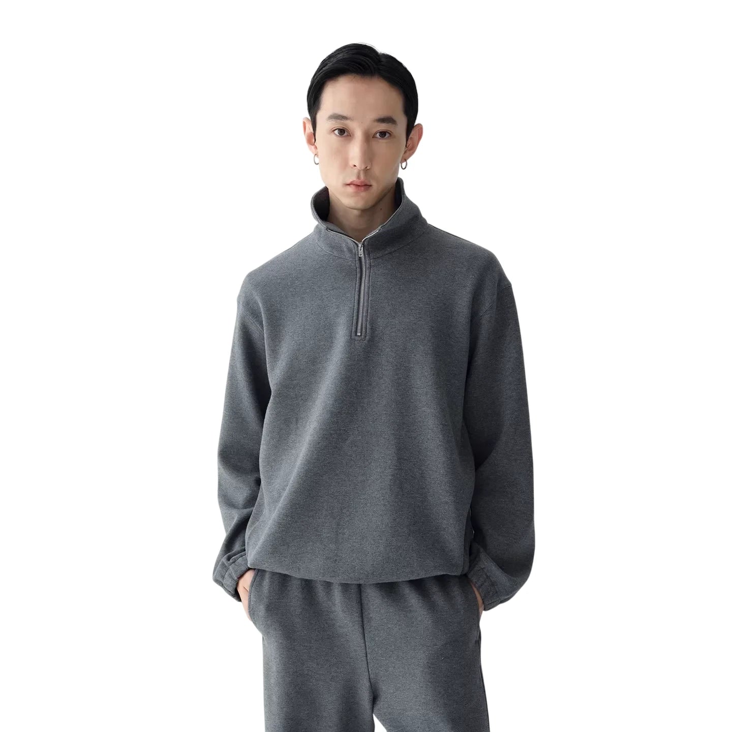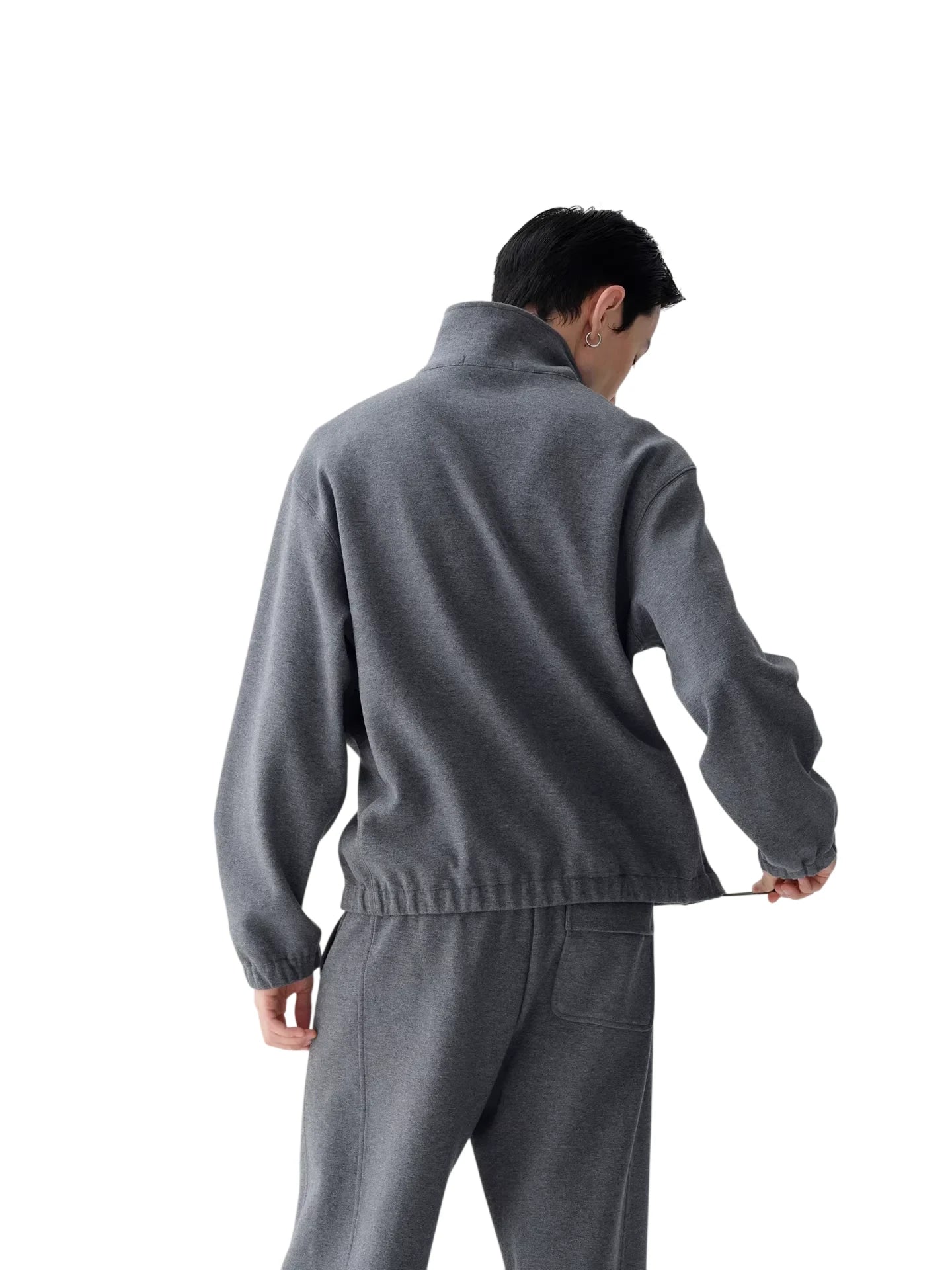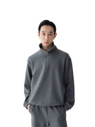 This men's athleisure hoodie is crafted from double-layer Japanese organic cotton, offering a soft, textured feel ideal for casual or lounge wear. Featuring a relaxed drop-shoulder silhouette, it includes a stand-up collar, short front zipper, side panels, and a drawstring hem for an adjustable fit. Perfect for everyday comfort with a modern, minimal design.