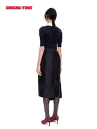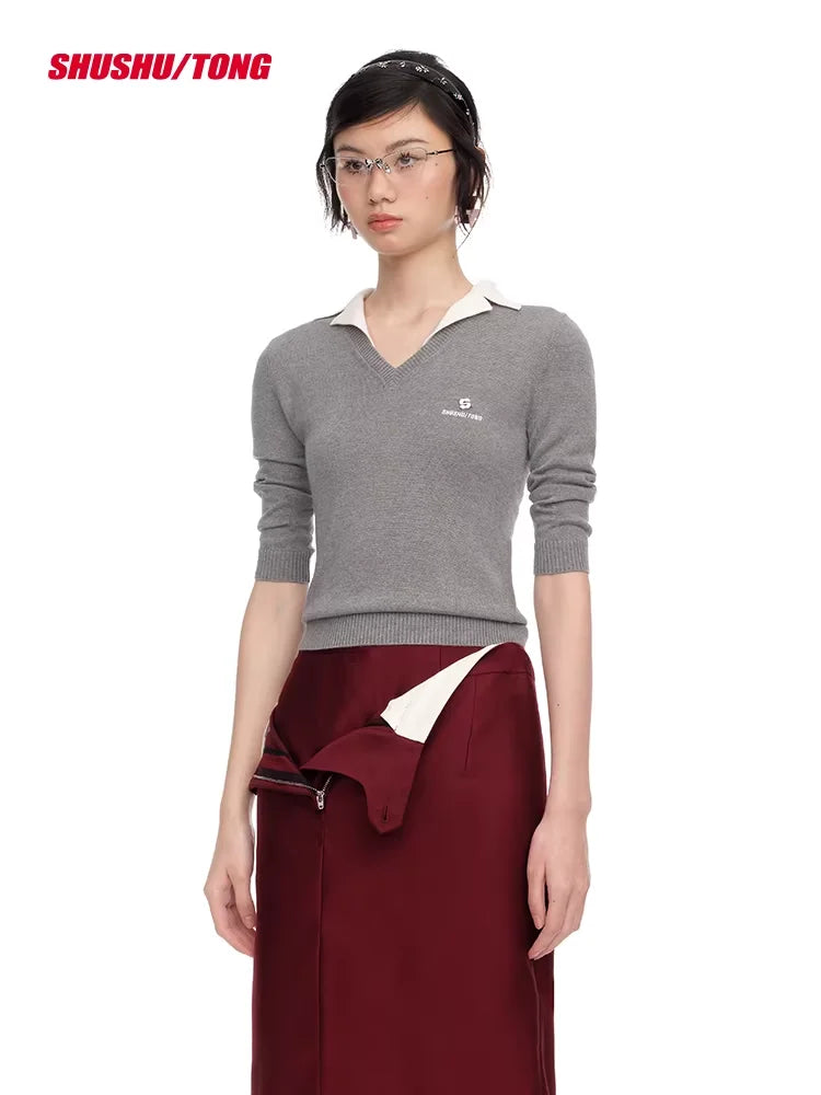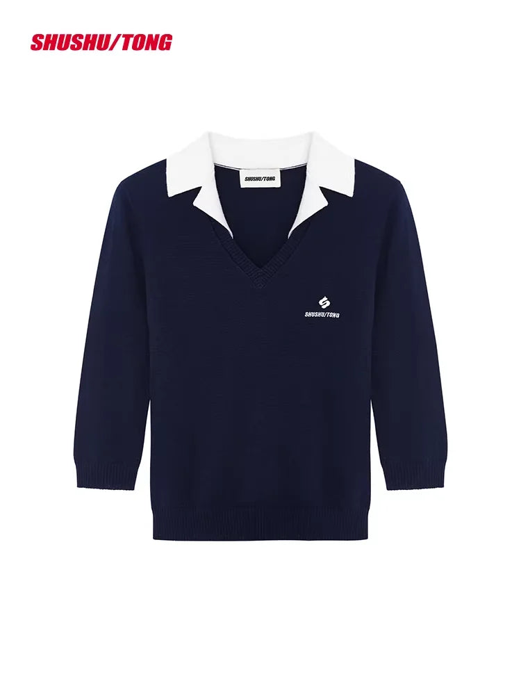 This elegant knit sweater for women features a stylish black V-neck design complemented by a crisp white patchwork lapel, creating a refined and preppy appearance. The fitted silhouette and three-quarter length sleeves enhance its sophisticated charm. A subtle embroidered logo on the chest adds a touch of detail without overpowering the classic look. Perfect for pairing with tailored skirts or trousers, this sweater brings a modern twist to timeless elegance.