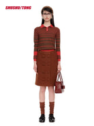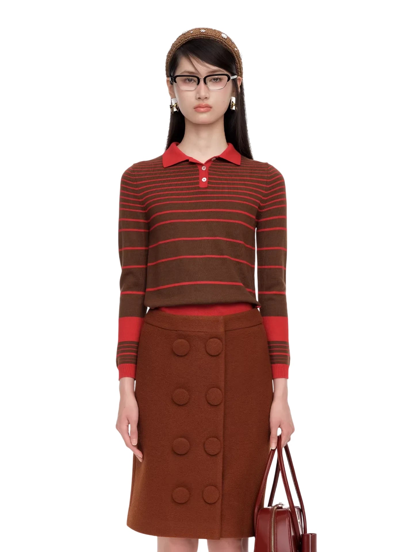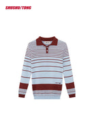 This stylish women's long sleeve knit sweater features eye-catching horizontal stripes in red and white. Designed with a contrast red collar and cuffs, it brings a modern twist to a classic polo-style silhouette. Perfect for winter wear, this sweater combines comfort and fashion effortlessly.