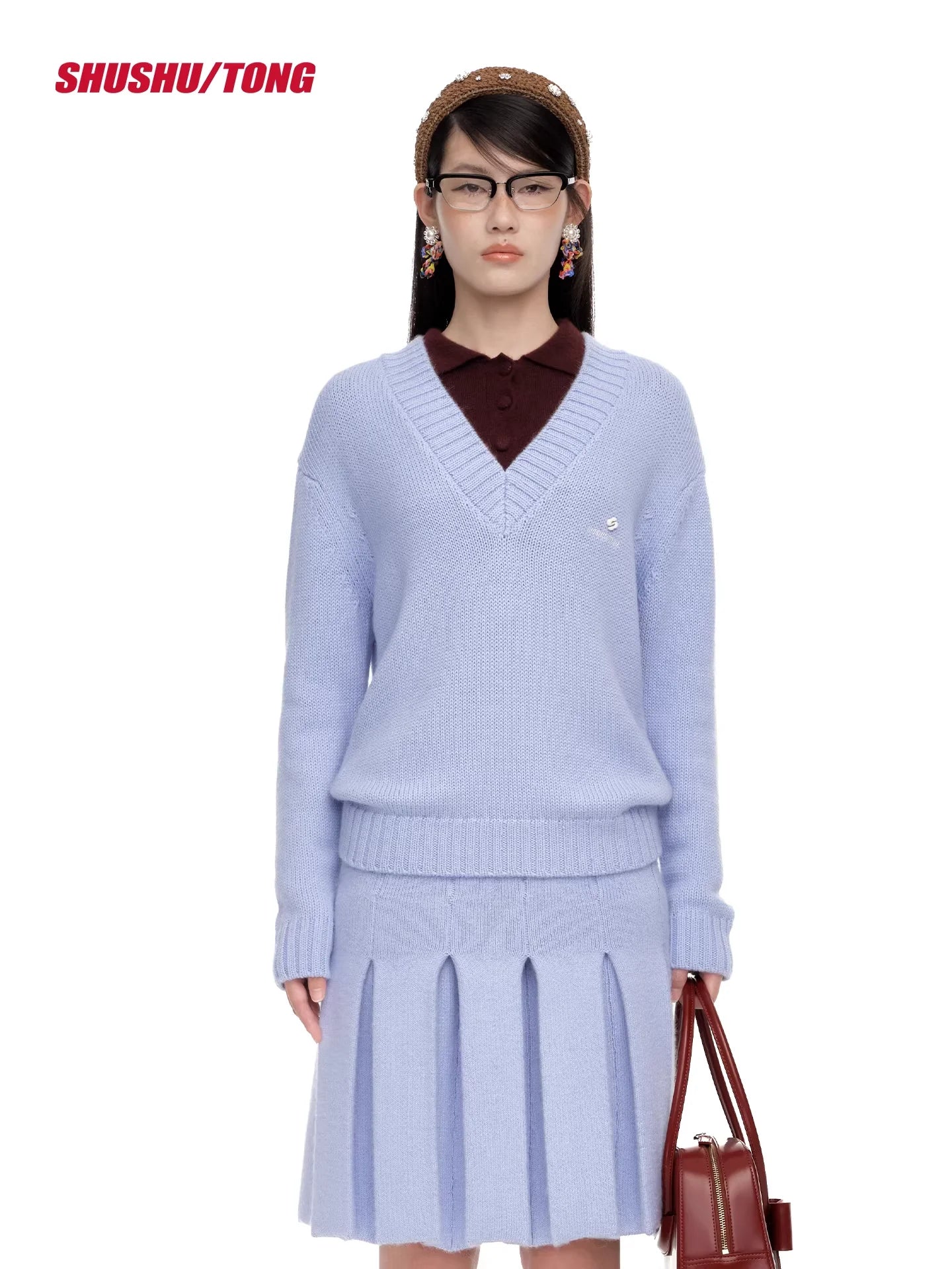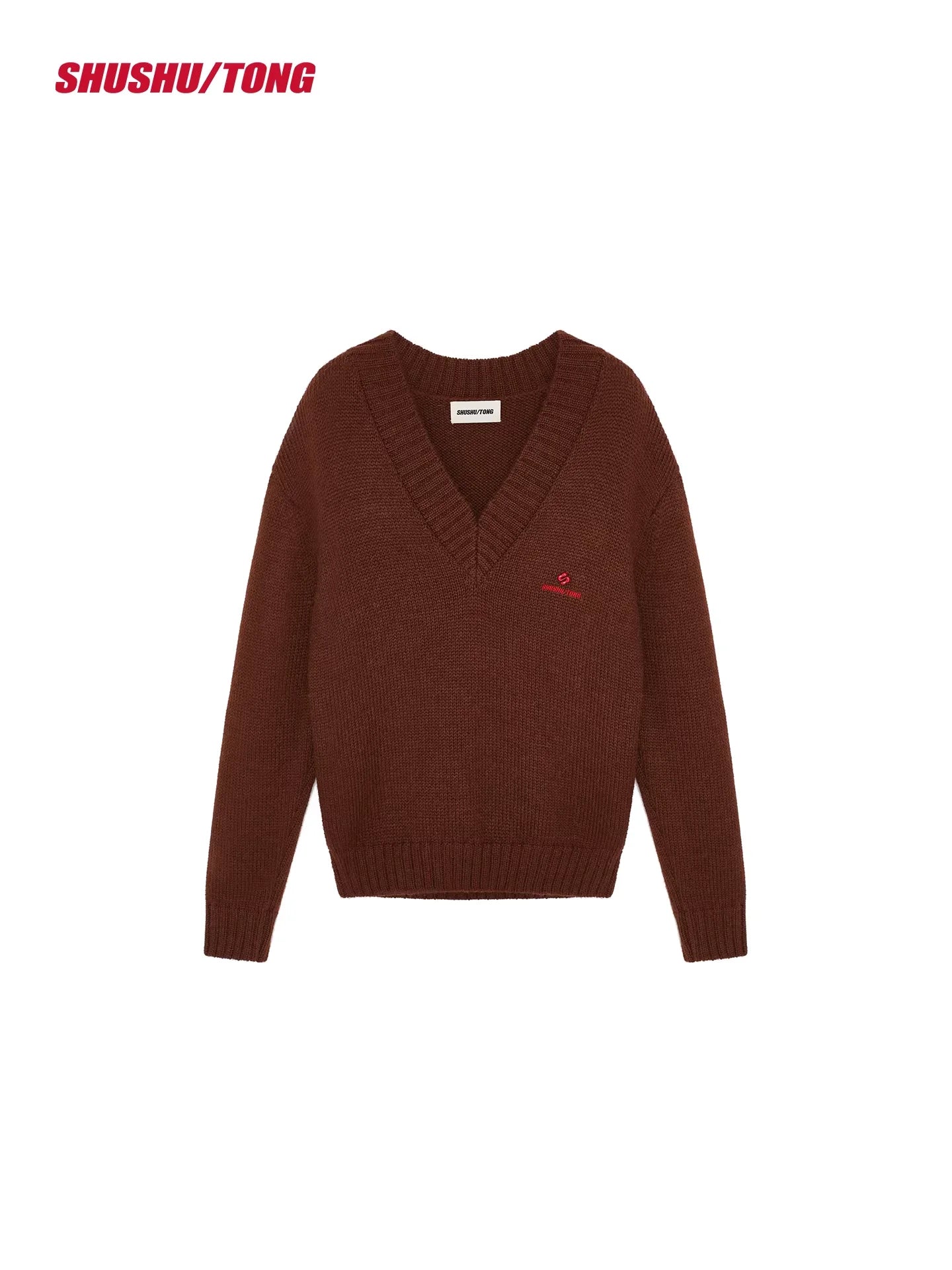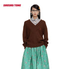 Embrace winter elegance with this stylish women's V-neck knit pullover sweater. Featuring ribbed cuffs and hem, this deep brown sweater is designed for both comfort and sophistication. Layered effortlessly over a structured collared shirt, it offers a refined and versatile look. Perfectly paired with a vibrant skirt or classic denim, this pullover elevates your seasonal wardrobe with a touch of modern charm.