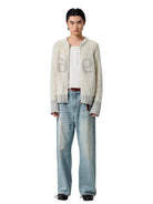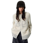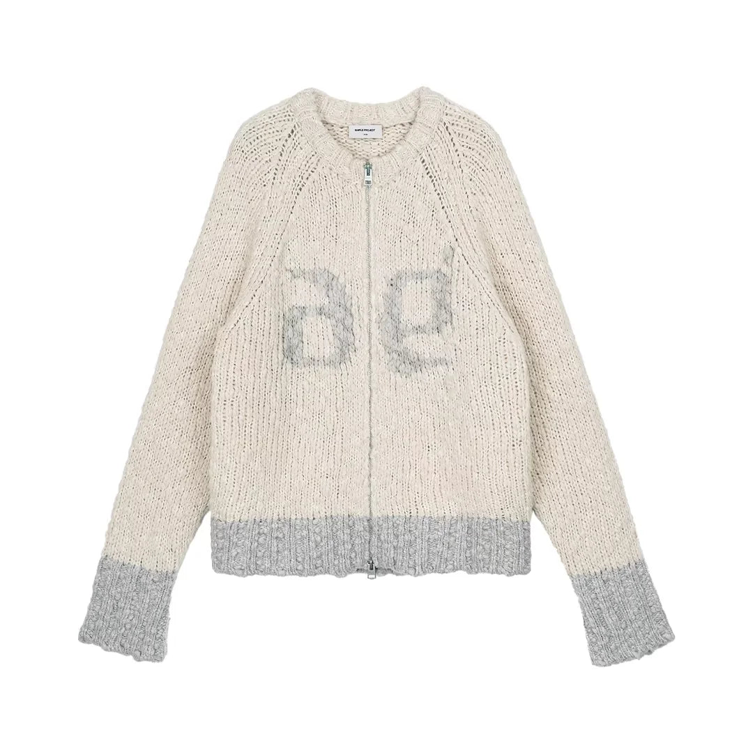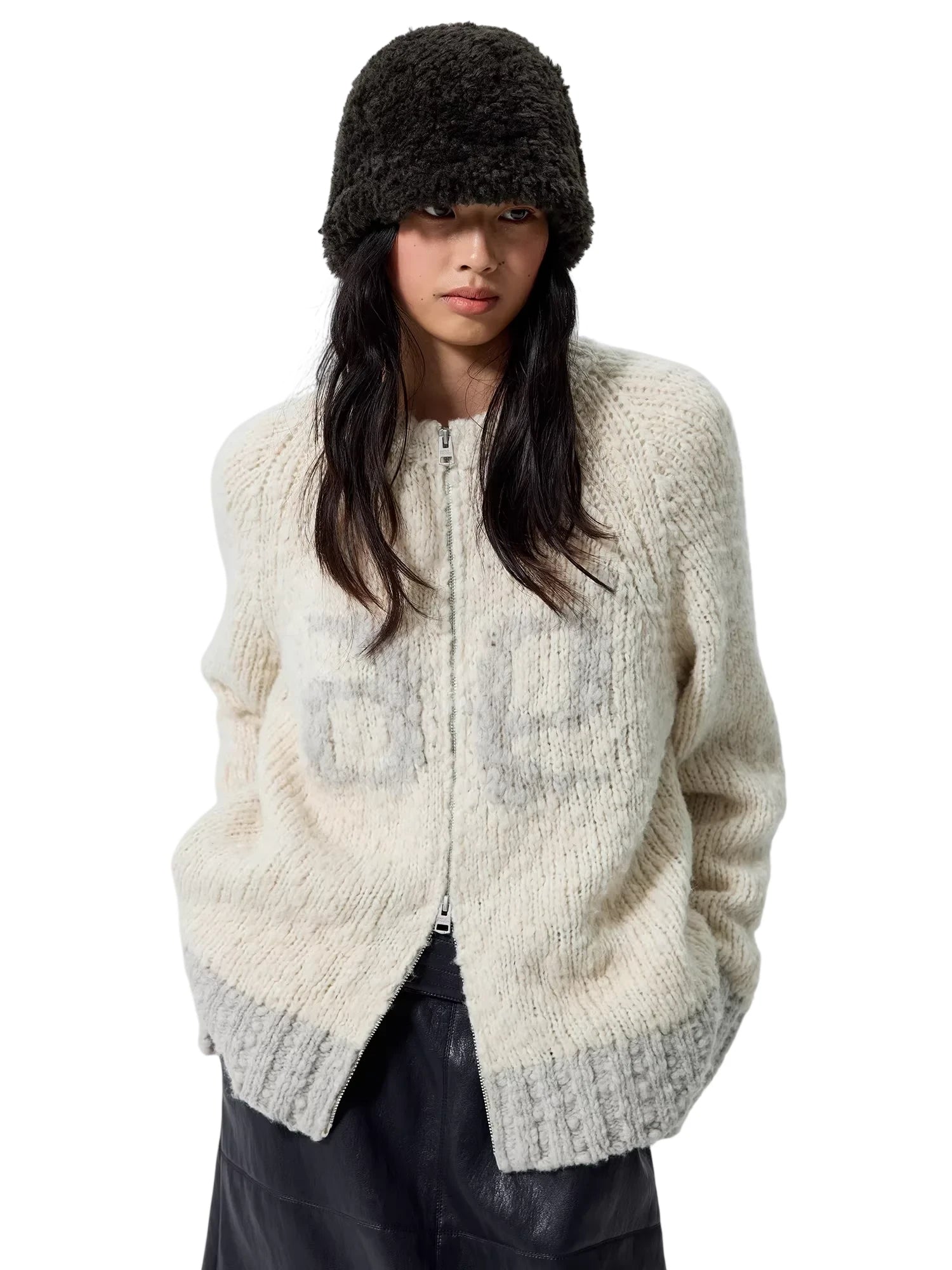Elevate your winter wardrobe with this cozy and oversized zip-up cardigan, designed in a soft cream knit with light gray ribbed accents on the cuffs and hem. Its chunky wool texture provides warmth and comfort, while the subtle, oversized number graphic on the chest adds a touch of modern style. Perfectly paired with edgy accessories or casual layers, this women's cardigan is a versatile outerwear staple for colder seasons.