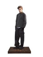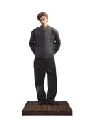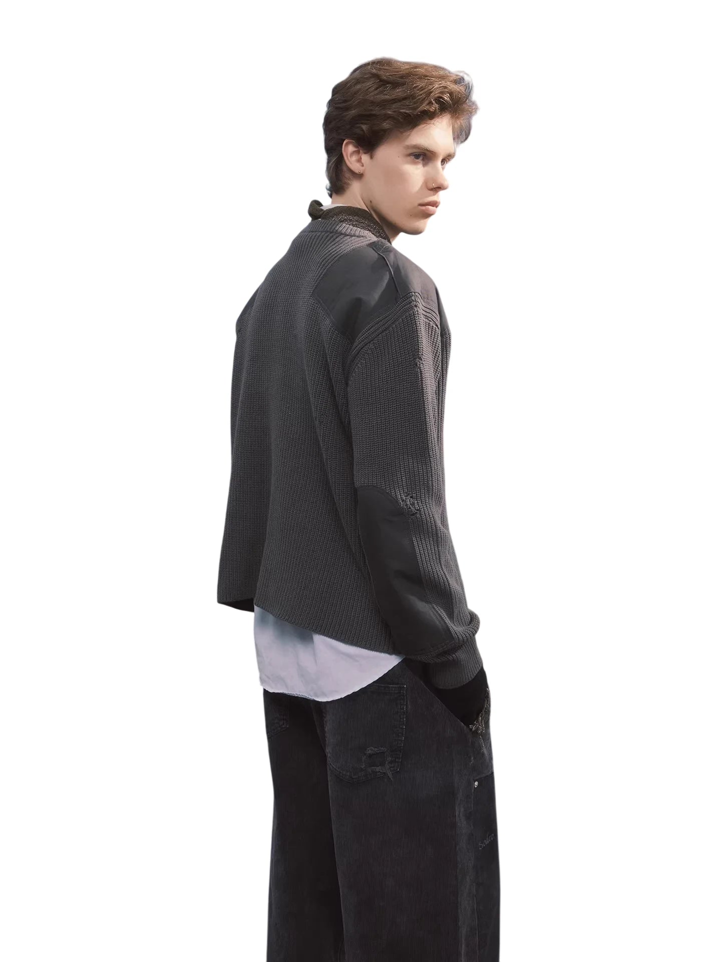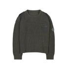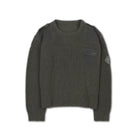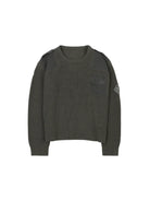 This men's military-inspired knit sweater is designed in a rugged army green color, featuring a vintage loose fit and durable ribbed texture throughout. Distressed detailing adds a worn-in character, while reinforced fabric patches on the shoulders and chest enhance durability. A flap pocket on the left chest provides subtle utility, and a stitched lightning bolt badge adorns the left sleeve for a bold finishing touch. The crew neckline and cuffs are ribbed to retain shape and structure, making it a standout piece for casual, functional style.