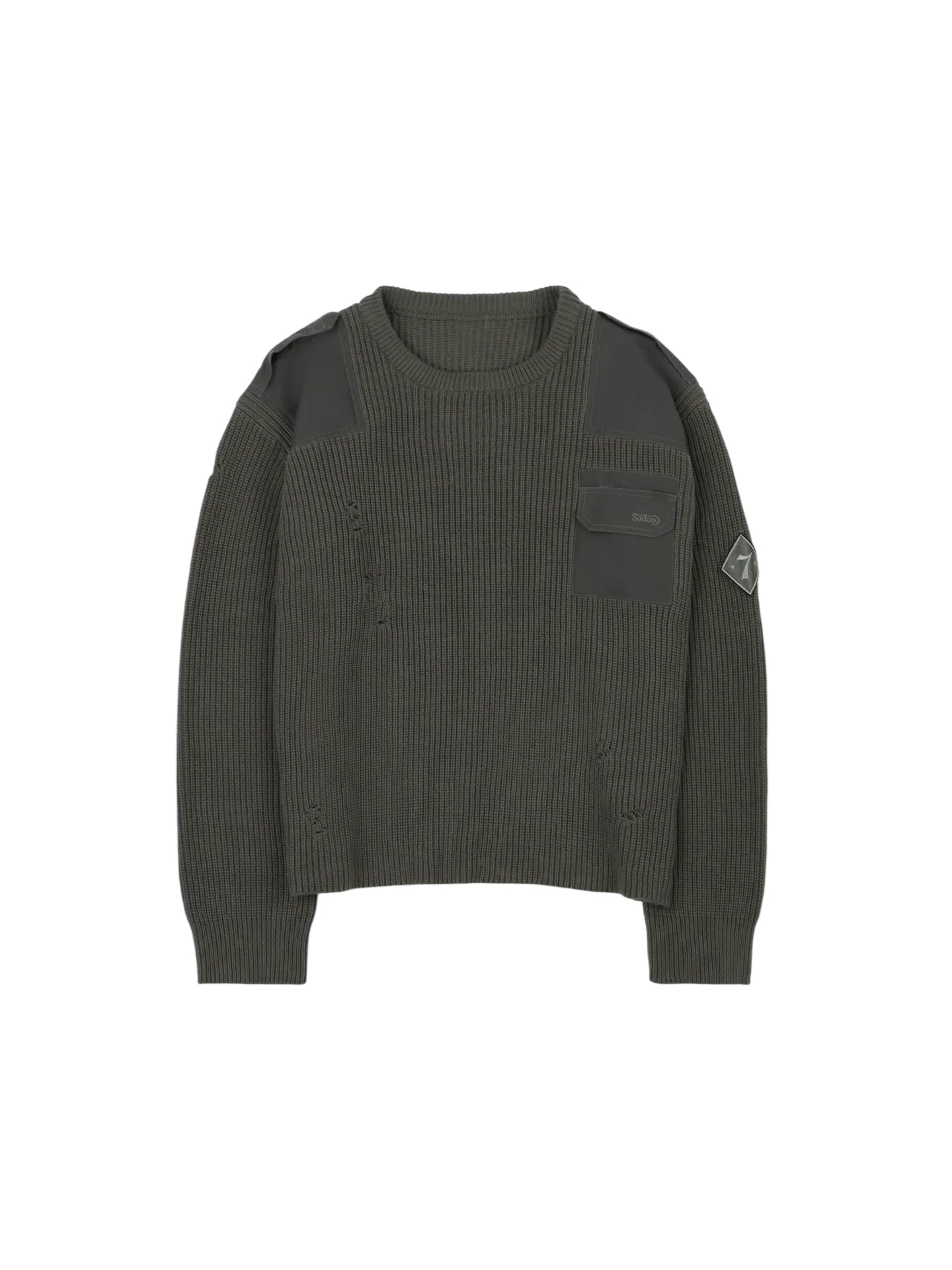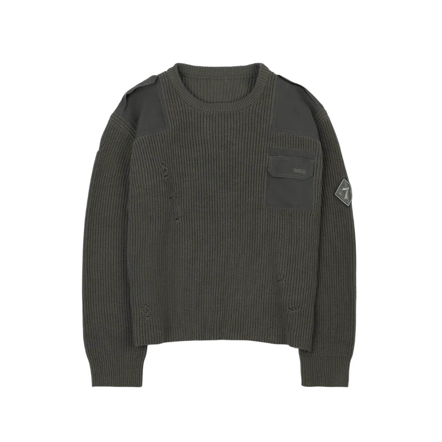 SOD Online Store Men's Army Green Distressed Knit Sweater with Patches