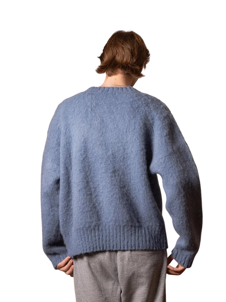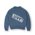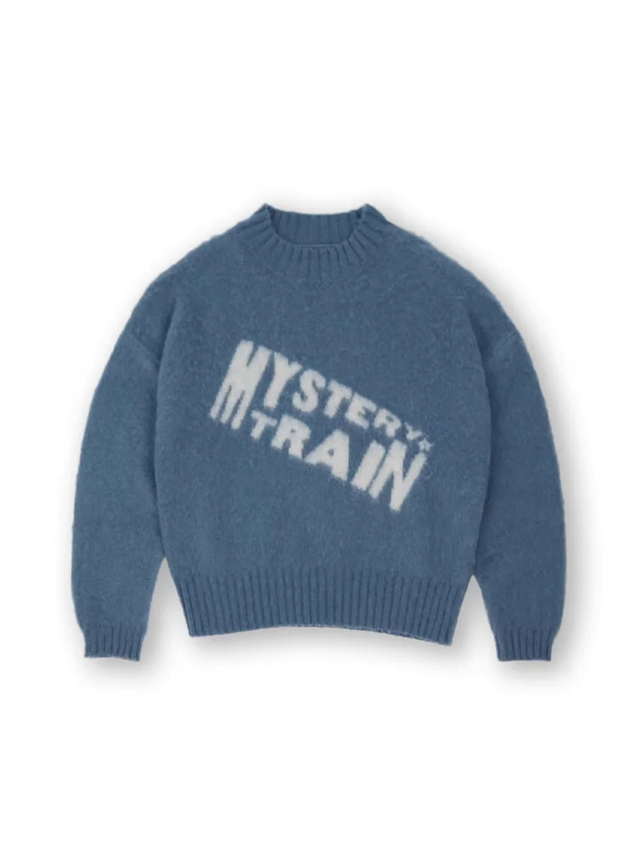 This men's oversized sweater combines contemporary style with luxurious comfort. Crafted from a soft mohair blend, it features a jacquard knit in a textured blue hue. The sweater is designed with ribbed cuffs, hem, and crew neckline for a snug yet relaxed fit. A standout feature is the bold white 'MYSTERY TRAIN' graphic across the chest, rendered in a dynamic, slanted typeface for added visual appeal. Perfect for layering or wearing on its own, this sweater offers a modern, soft-touch aesthetic ideal for cooler weather.