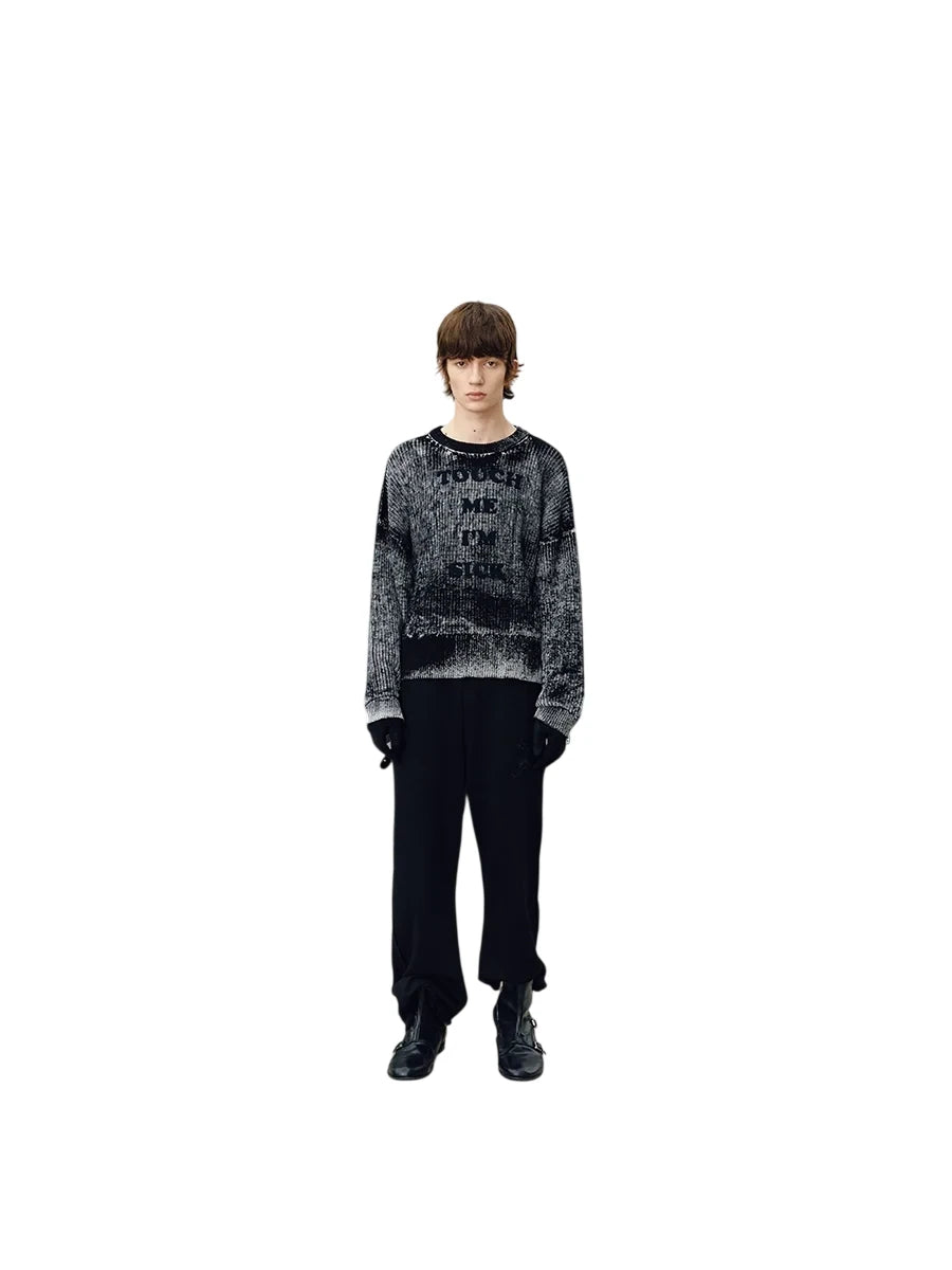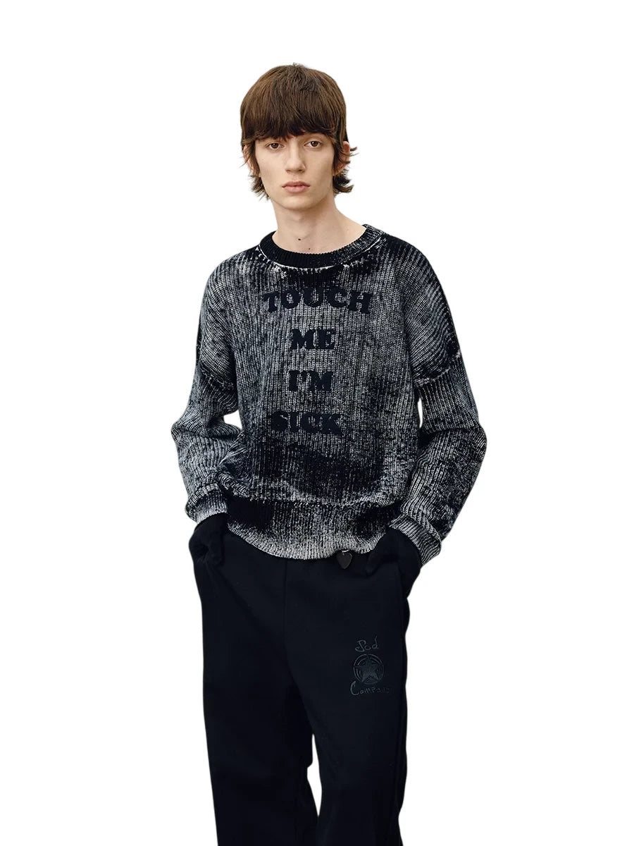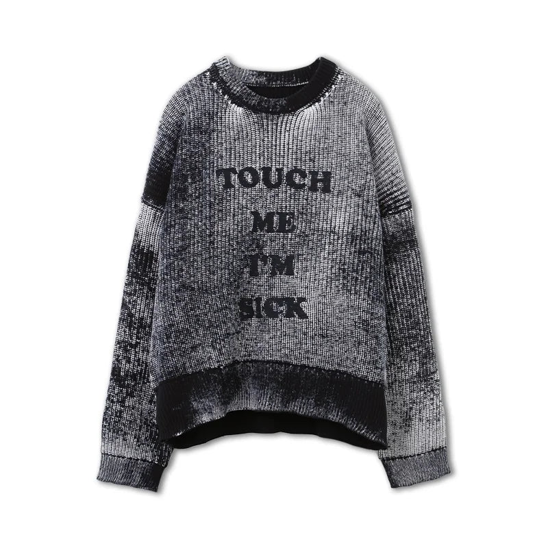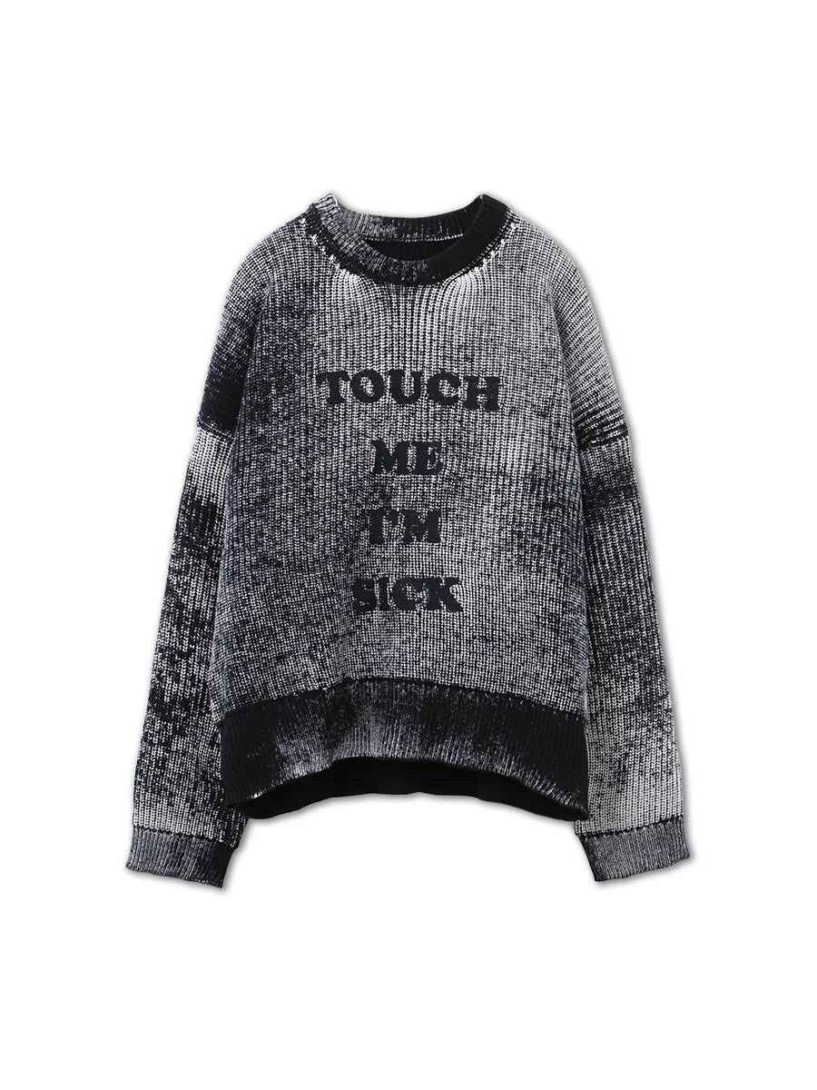 This unisex oversized knit sweater features a bold, alternative design with a grunge-inspired black and grey gradient. The front showcases the striking slogan 'TOUCH ME I'M SICK' in bold, capital letters, giving the piece a rebellious and edgy vibe.