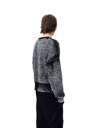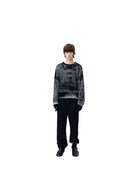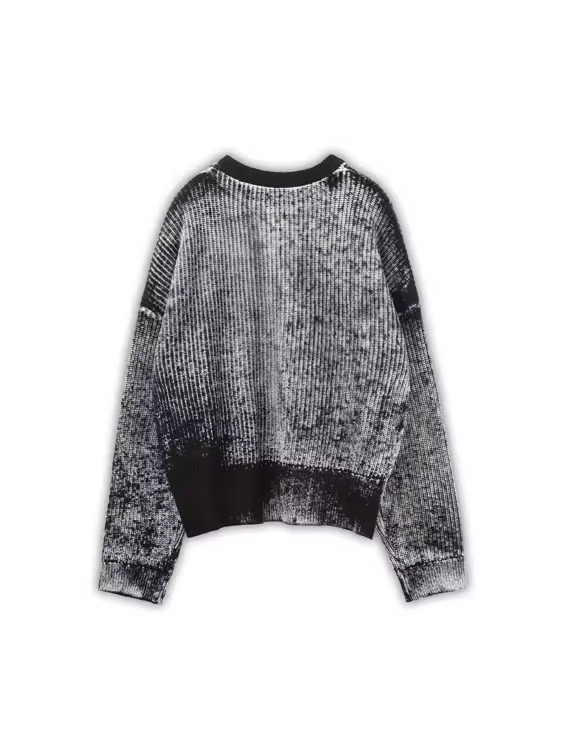 Designed for a loose, relaxed fit, it includes drop shoulders, ribbed cuffs, and a hem for added comfort and style. The marled knit texture and distressed visual finish provide a worn-in, vintage appeal that complements its streetwear-inspired aesthetic.