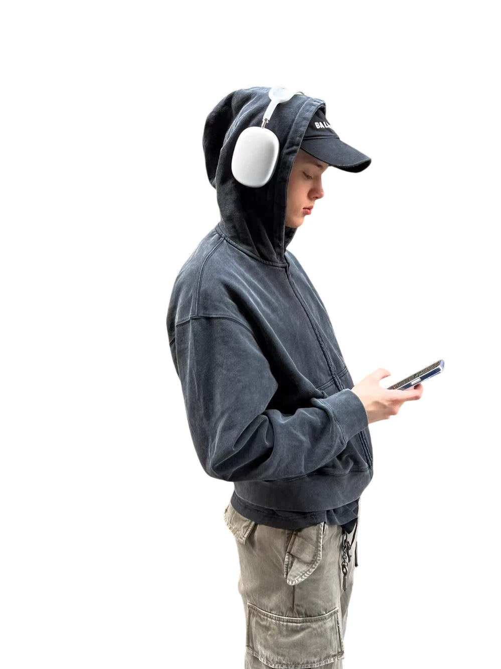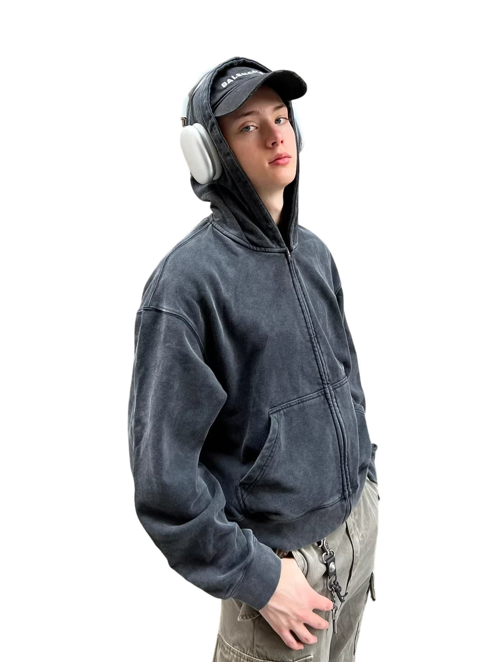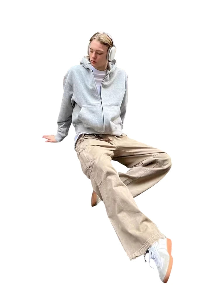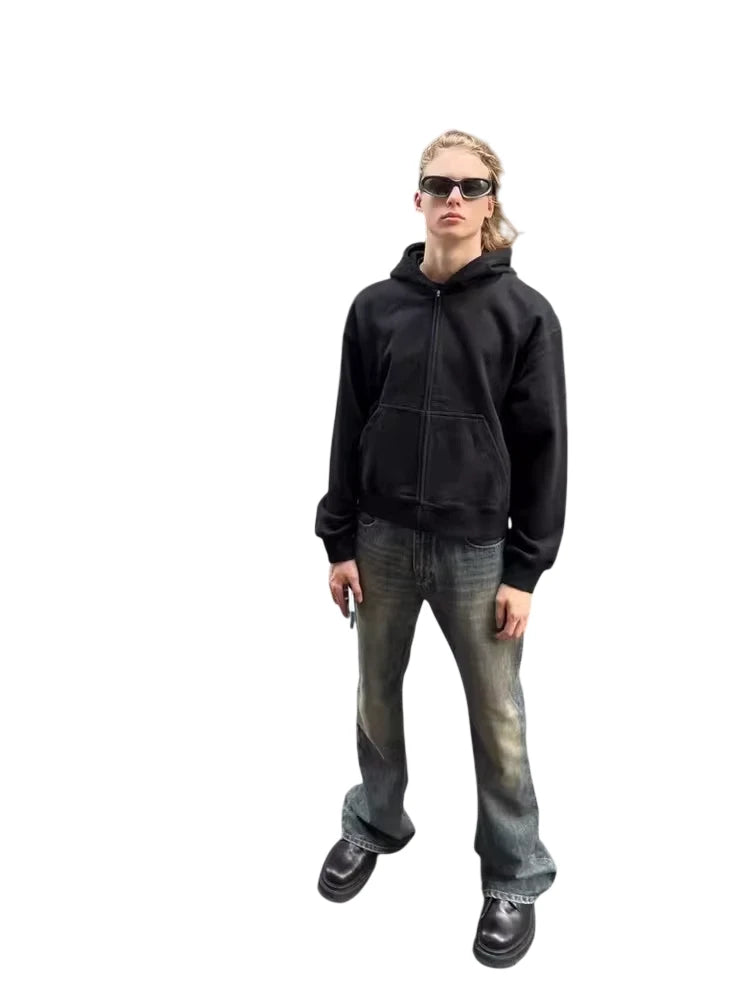 This men's hoodie features a retro washed black and gray finish with a short, boxy fit for a relaxed, American streetwear look. Designed with a zip-up front and kangaroo pocket, it offers both comfort and practicality. Ideal for layering, it pairs effortlessly with casual styles like cargo pants and caps.