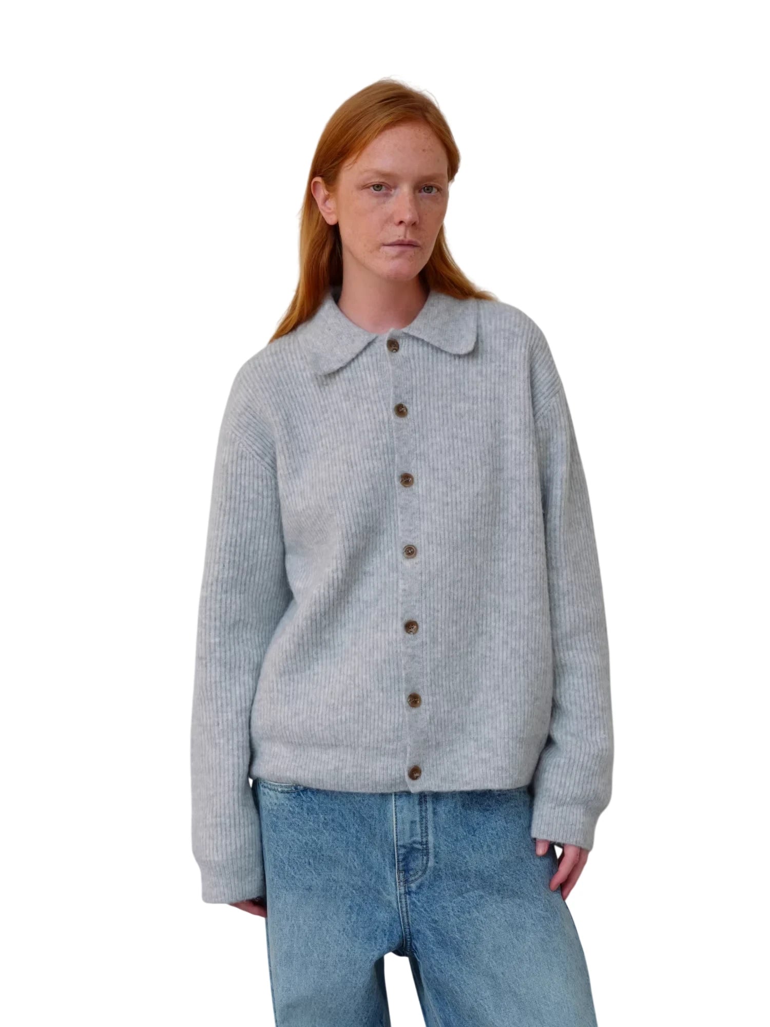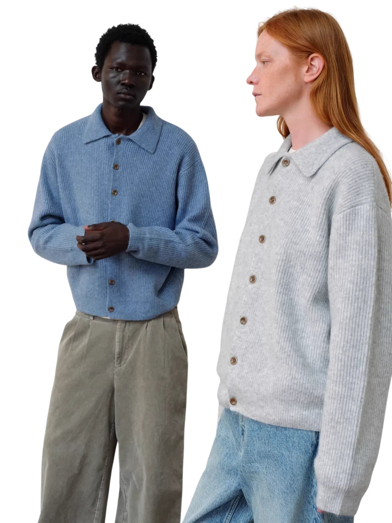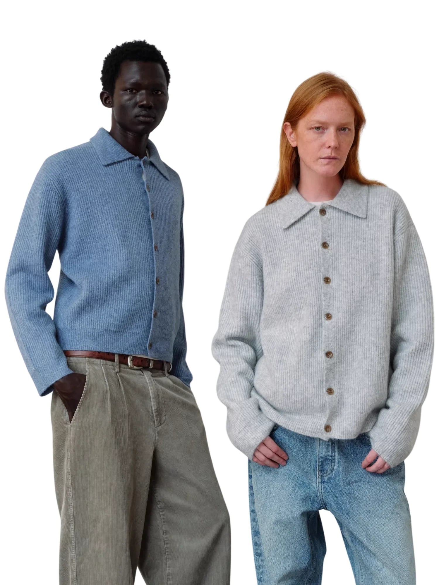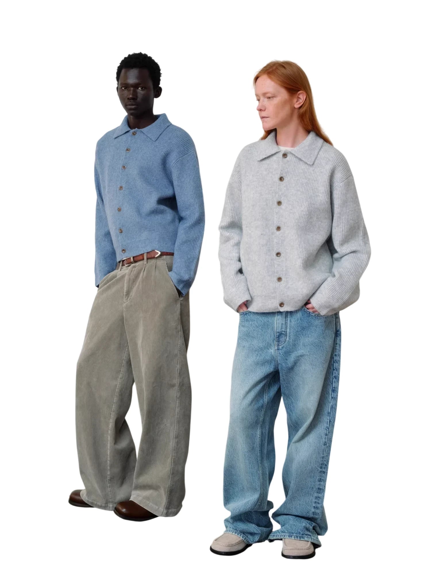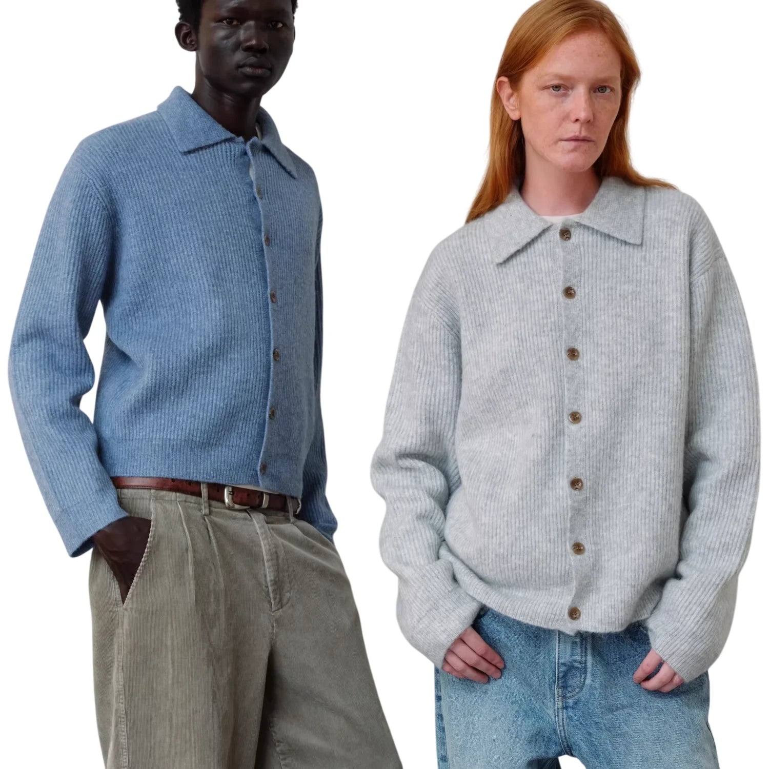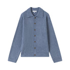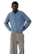 Stay stylish and warm with this unisex ribbed cardigan crafted from a soft wool blend. Featuring a button-up front, classic polo collar, and cozy fine ribbed knit texture, this sweater is perfect for layering in cooler weather. Available in medium blue with matching buttons or light gray with contrasting brown buttons, it pairs effortlessly with both casual and tailored pieces. Designed for comfort and versatility, this fuzzy knit cardigan brings timeless charm to any wardrobe.