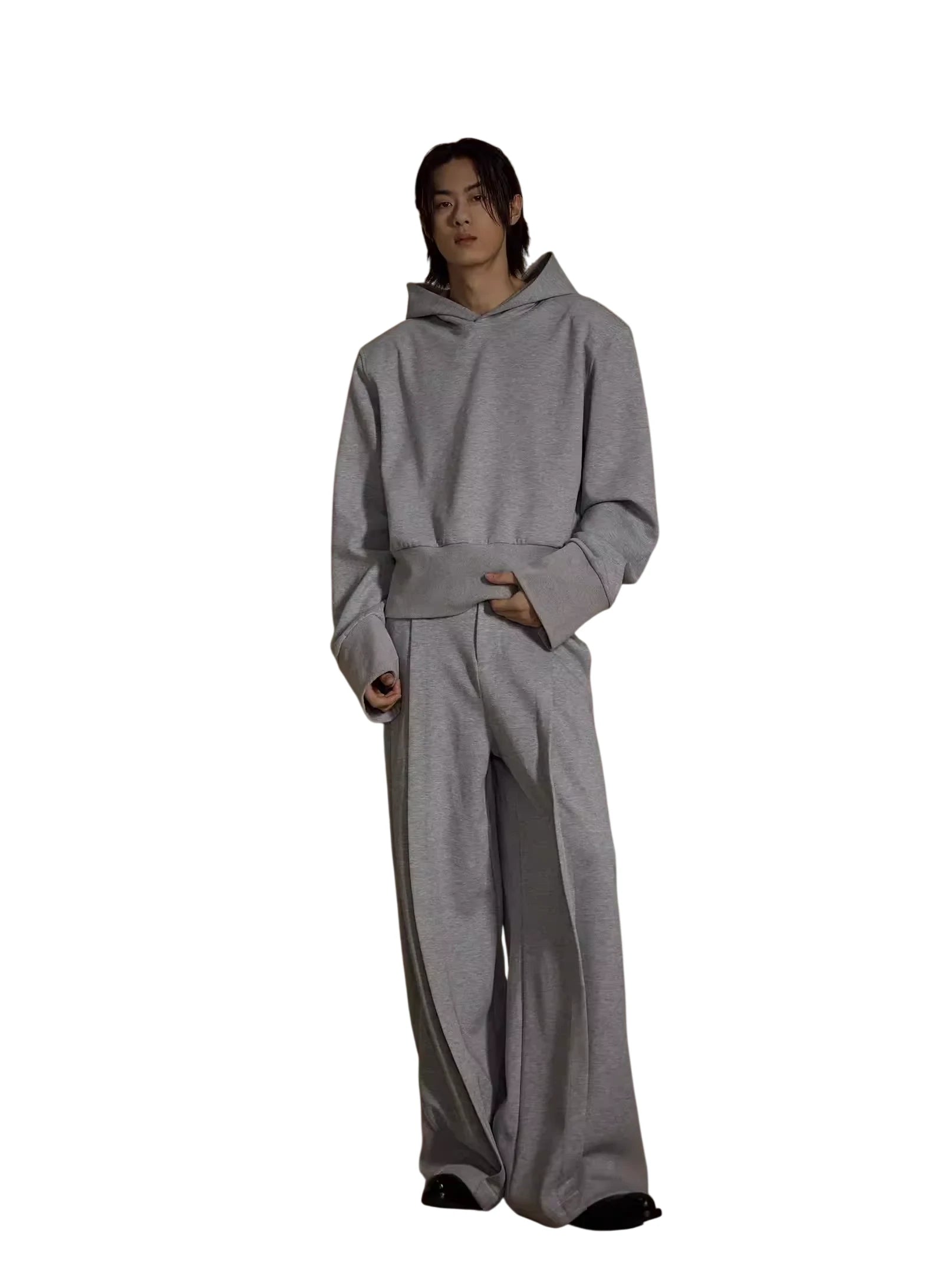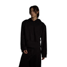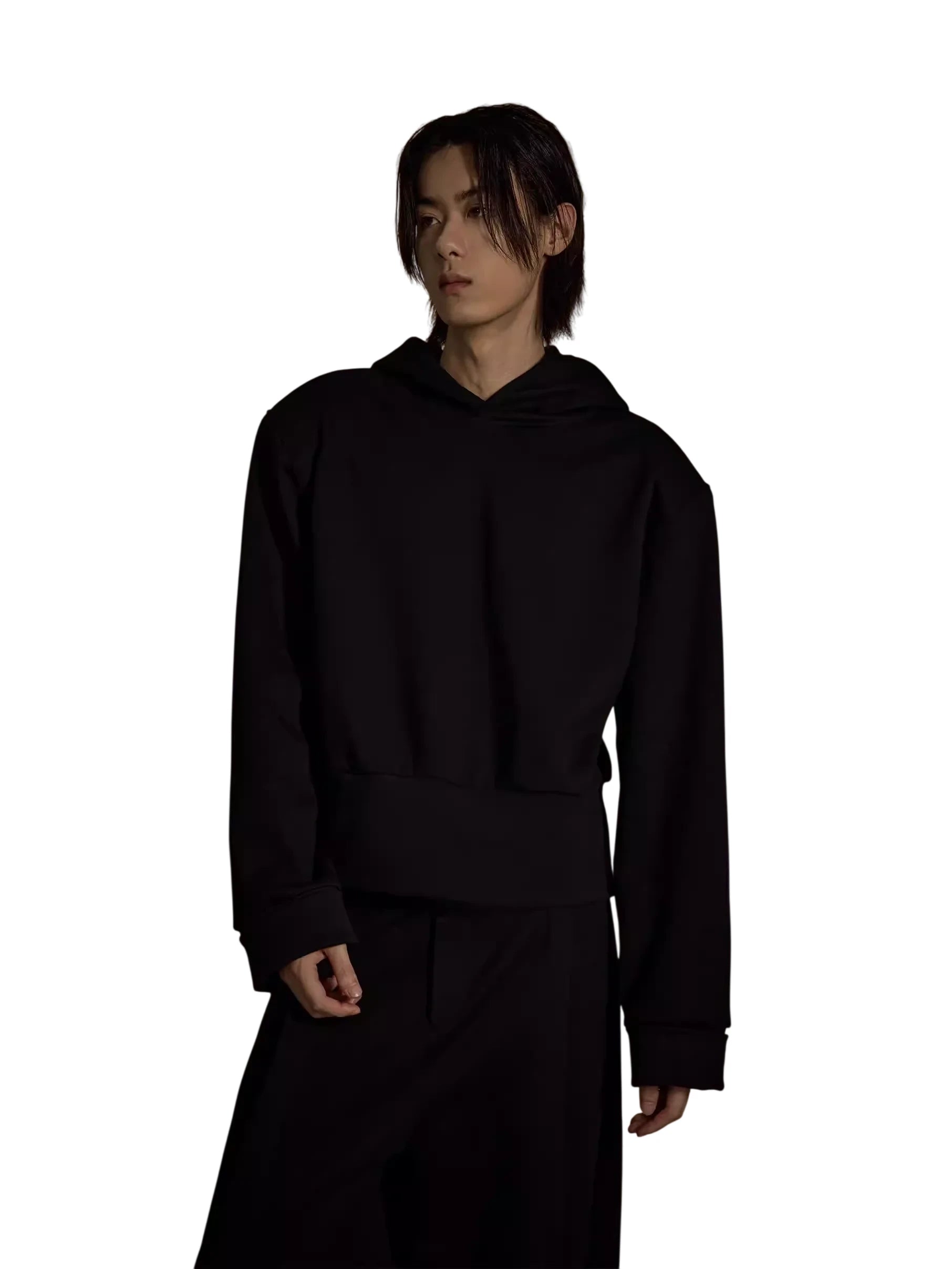 This men's hoodie features a structured, oversized design for a bold, modern silhouette. Crafted from heavyweight fabric, it includes a high waist and padded shoulders for added shape and style. The elongated sleeves and wide waistband contribute to its contemporary, relaxed fit, ideal for minimalist streetwear looks.