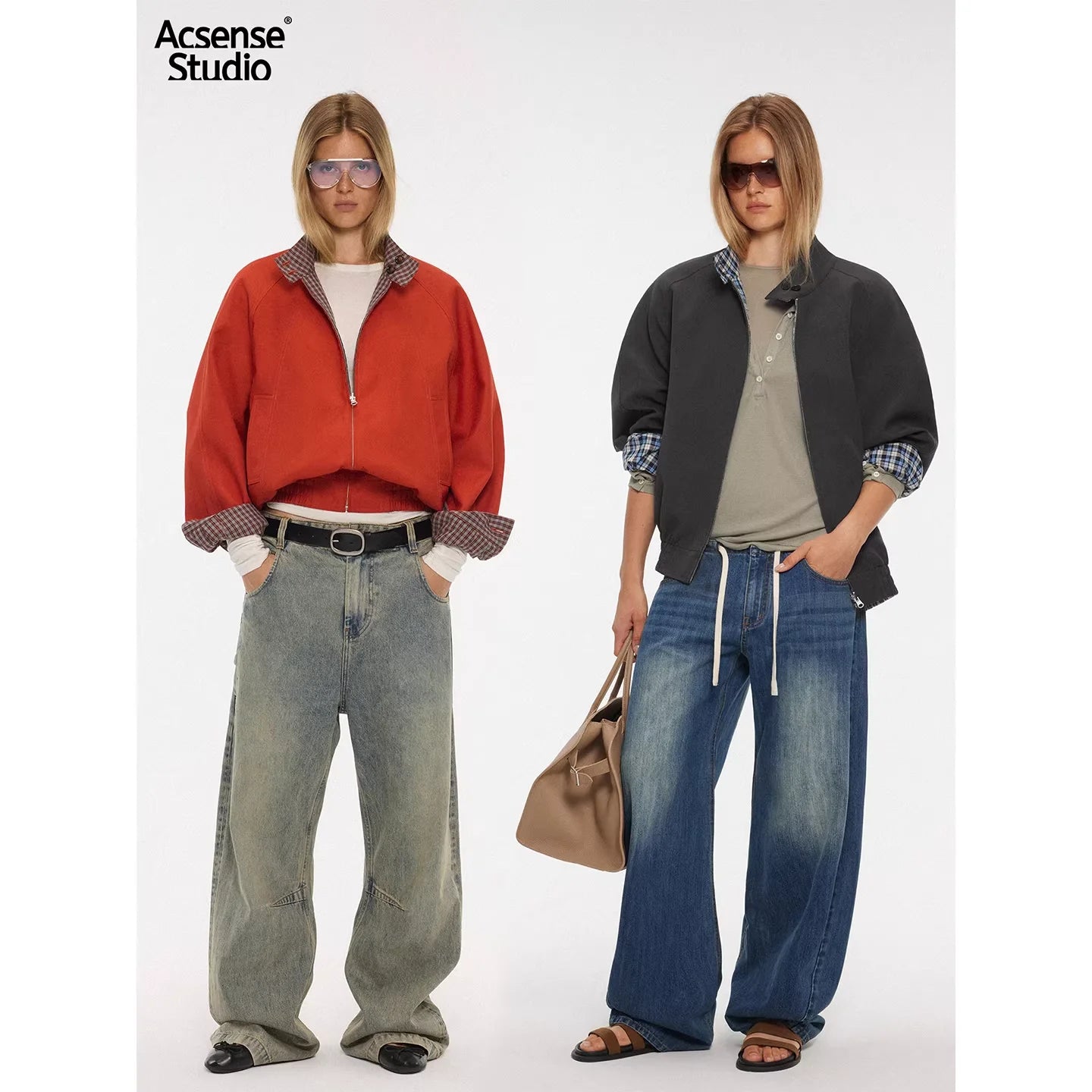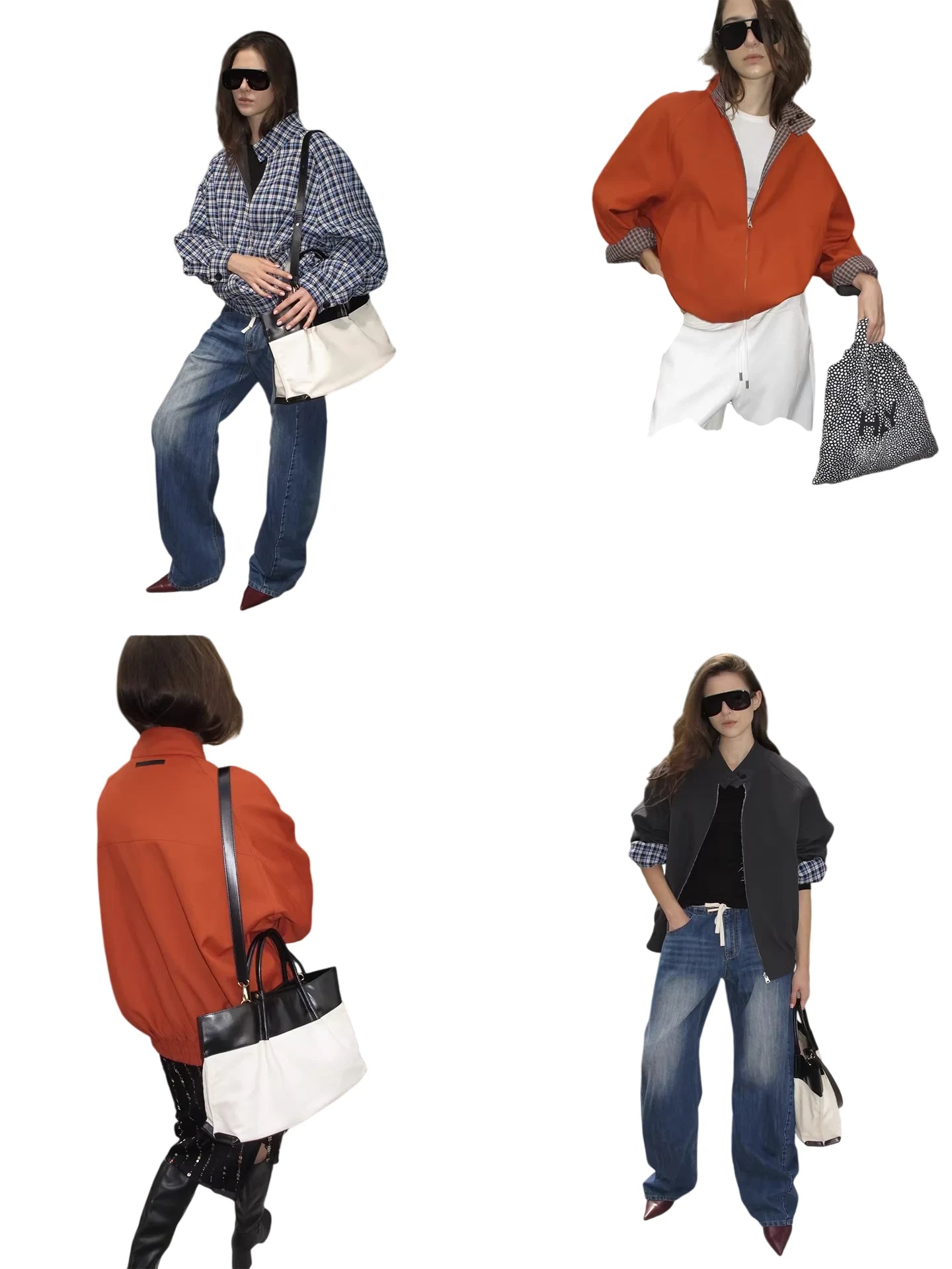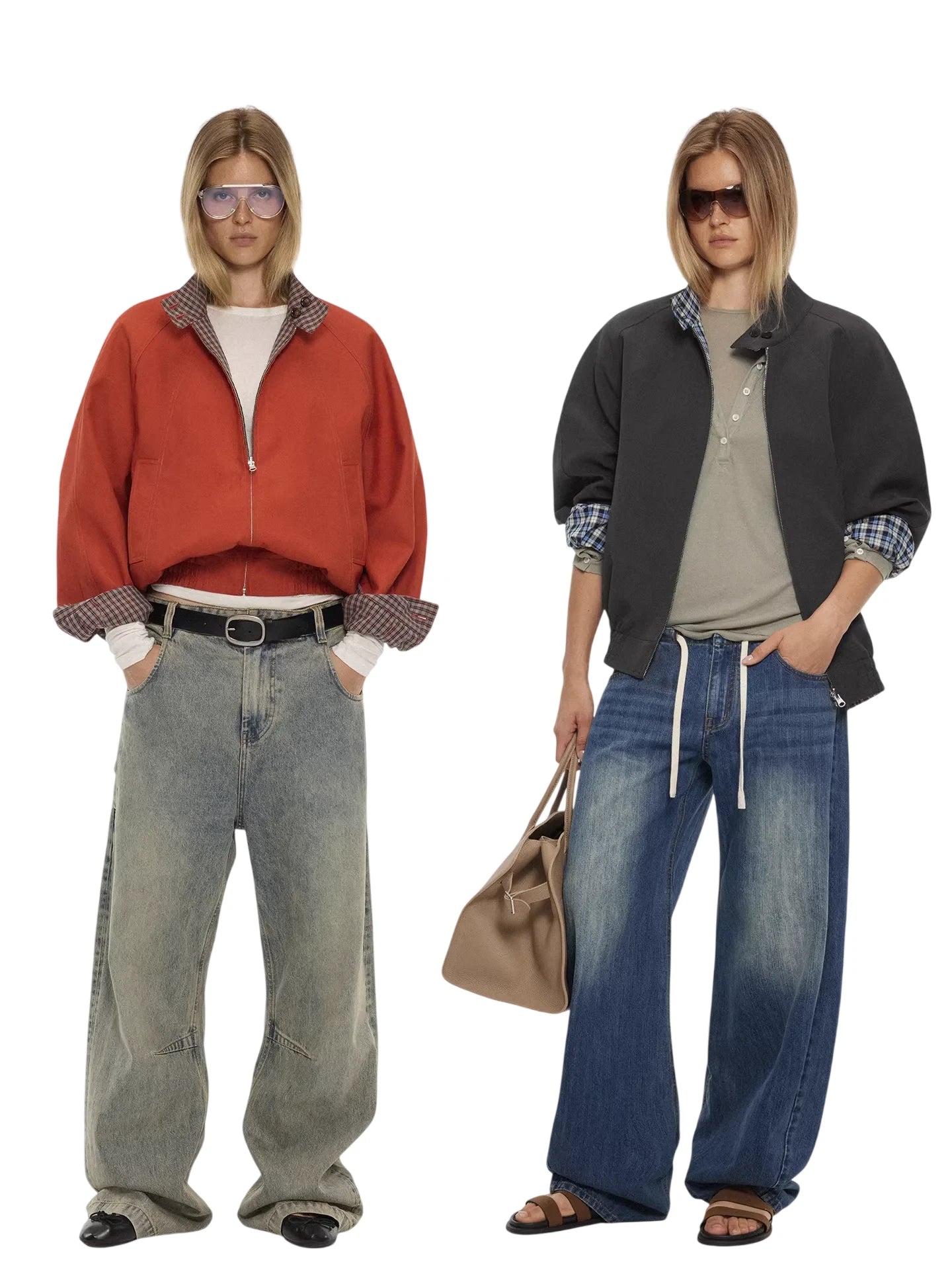 Modelled here by women in contemporary styling, the jacket pairs effortlessly with wide-leg jeans, adding a laid-back yet fashion-forward touch perfect for urban settings.