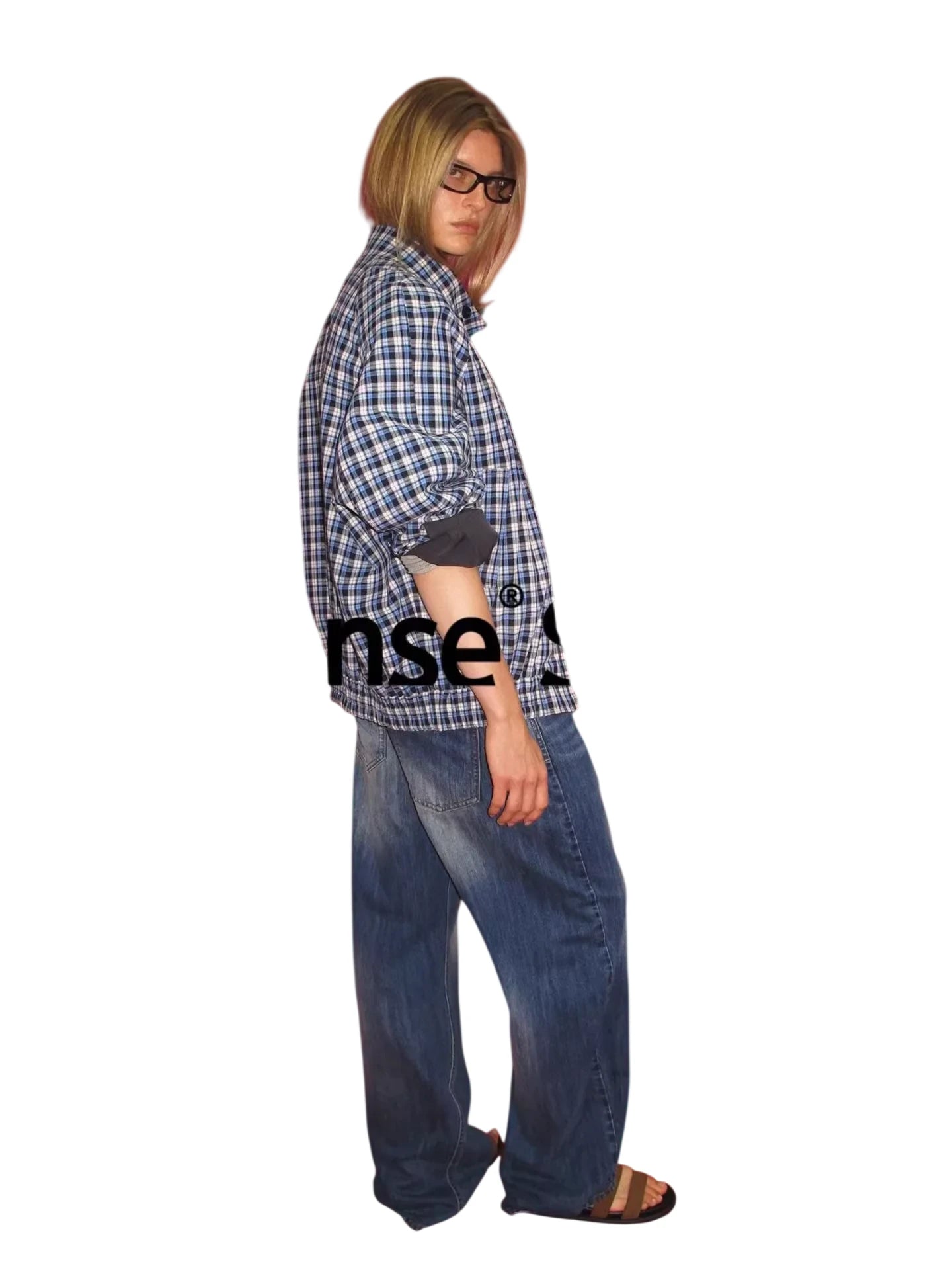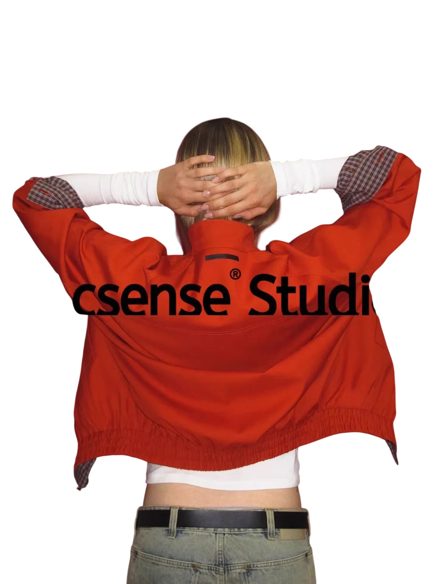 Elevate your casual wardrobe with this reversible stand collar jacket featuring multi-panel construction and bold plaid lining detail. Designed with a relaxed, loose fit, this outerwear piece blends modern streetwear aesthetics with functional layering options. The jacket showcases a stylish contrast lining visible at the cuffs and collar, making it a versatile choice for various outfits.