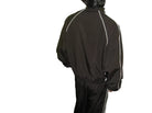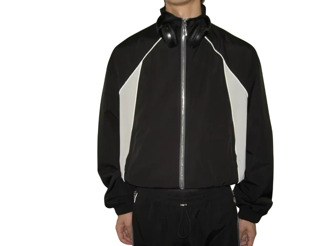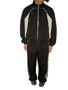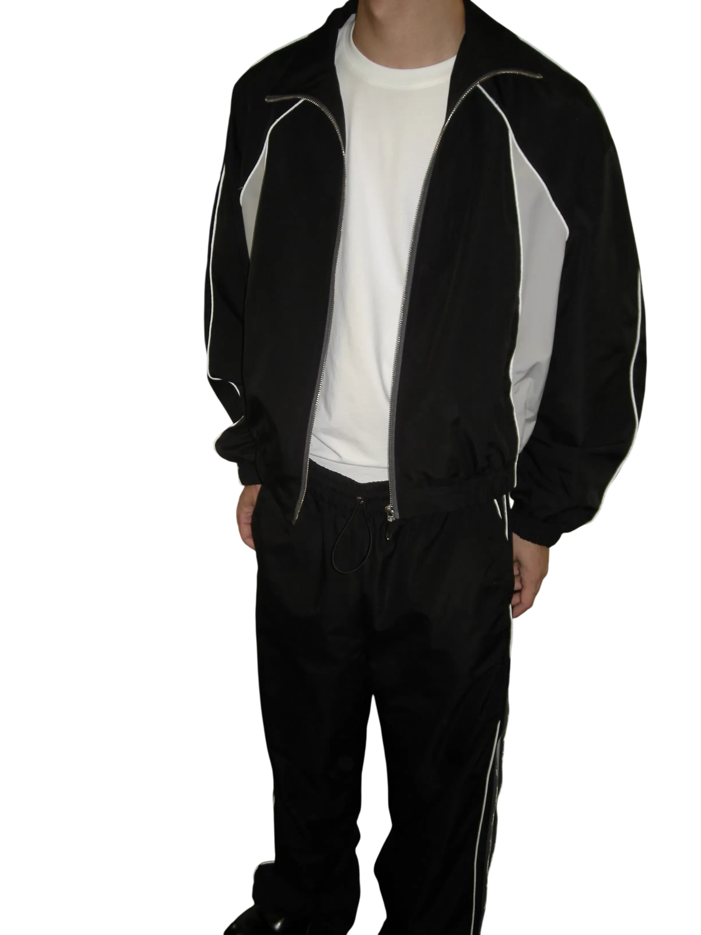 This men's black oversized sports jacket features a front zip-up closure and distinctive white triangular side panels that add a dynamic edge to its modern silhouette. Designed for both comfort and style, the jacket is part of a coordinated tracksuit set and pairs seamlessly with matching track pants. Ideal for athletic or casual wear, this versatile piece combines function and fashion effortlessly.