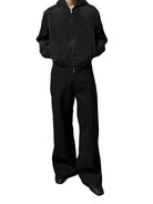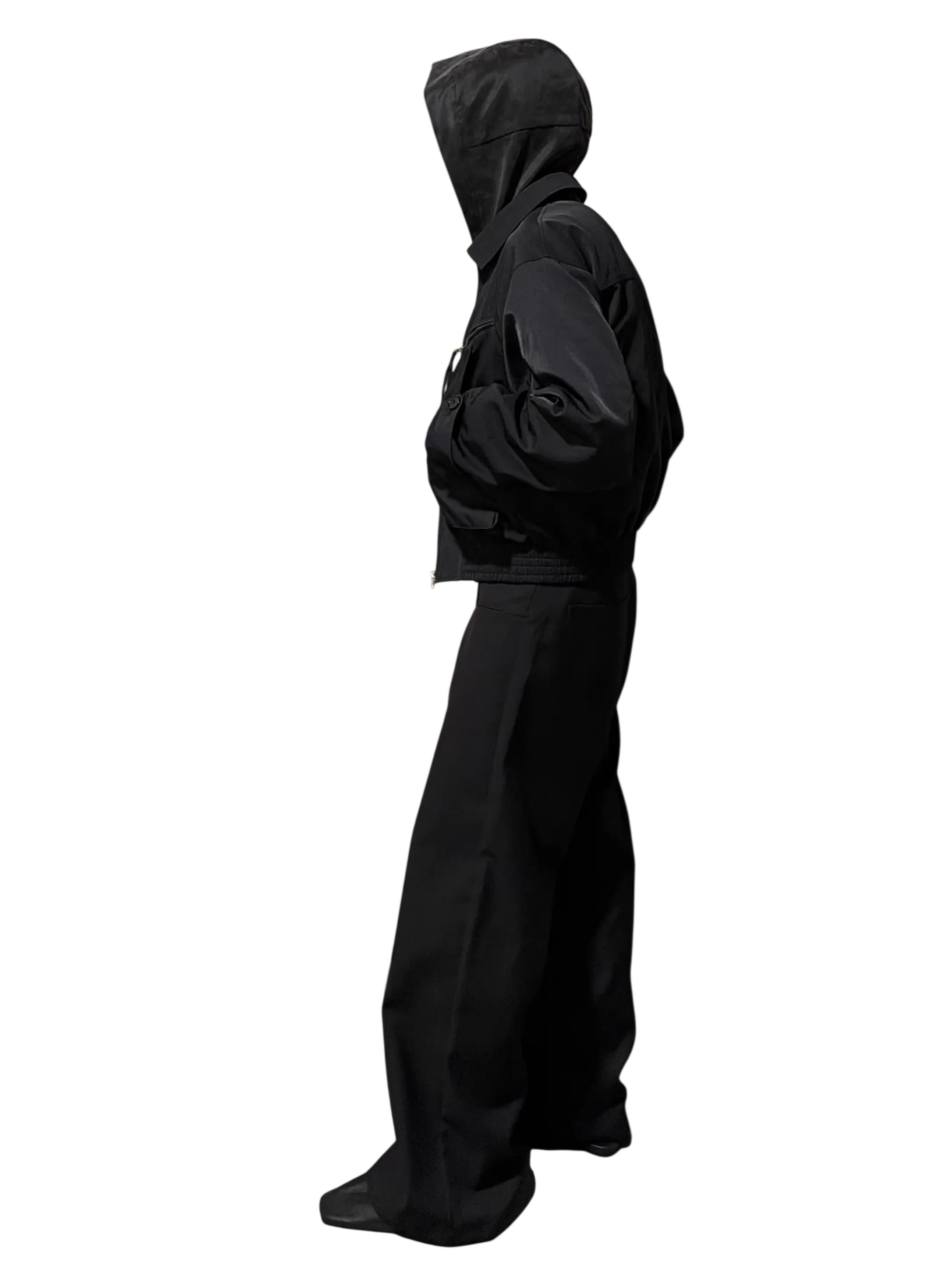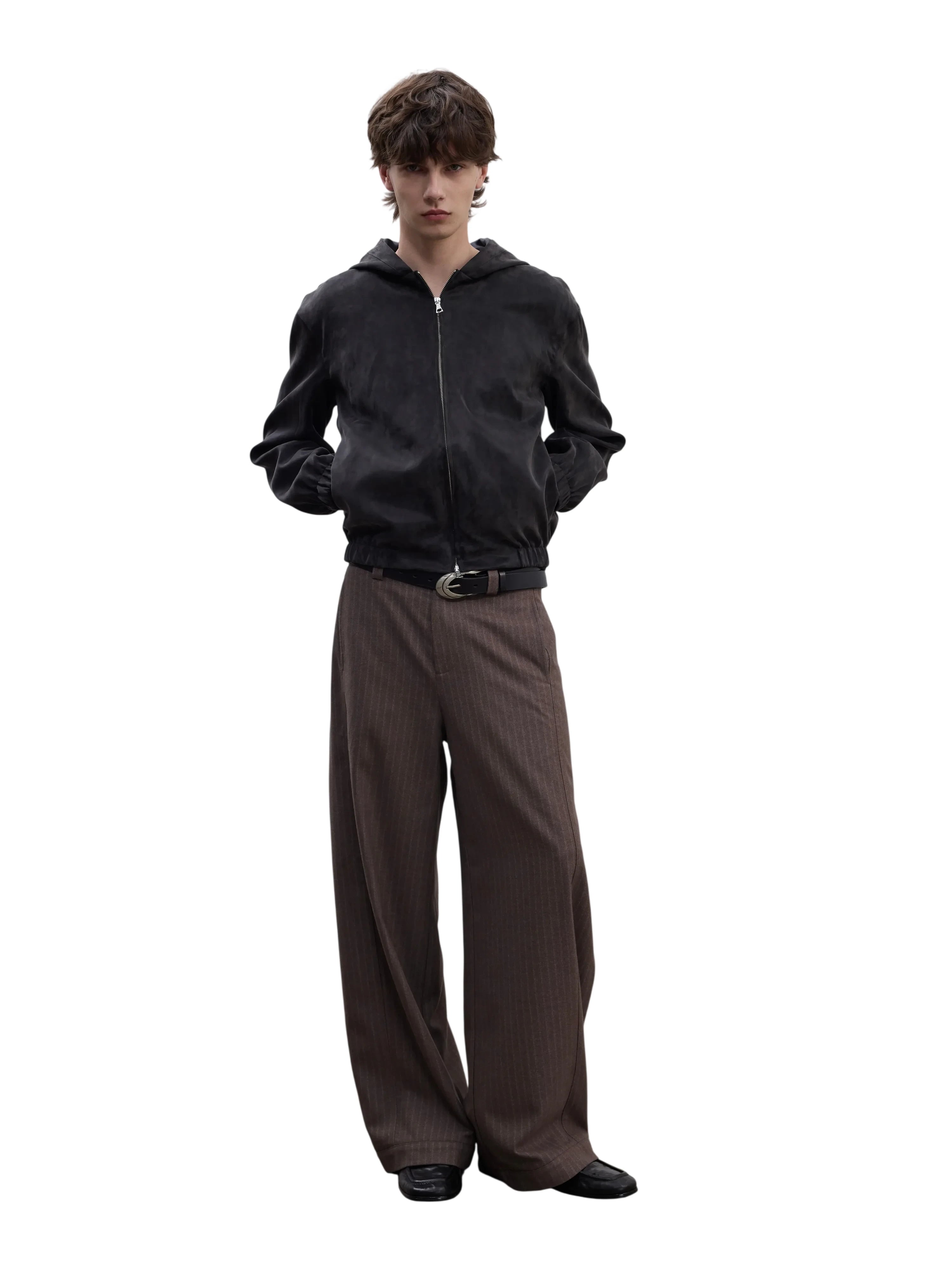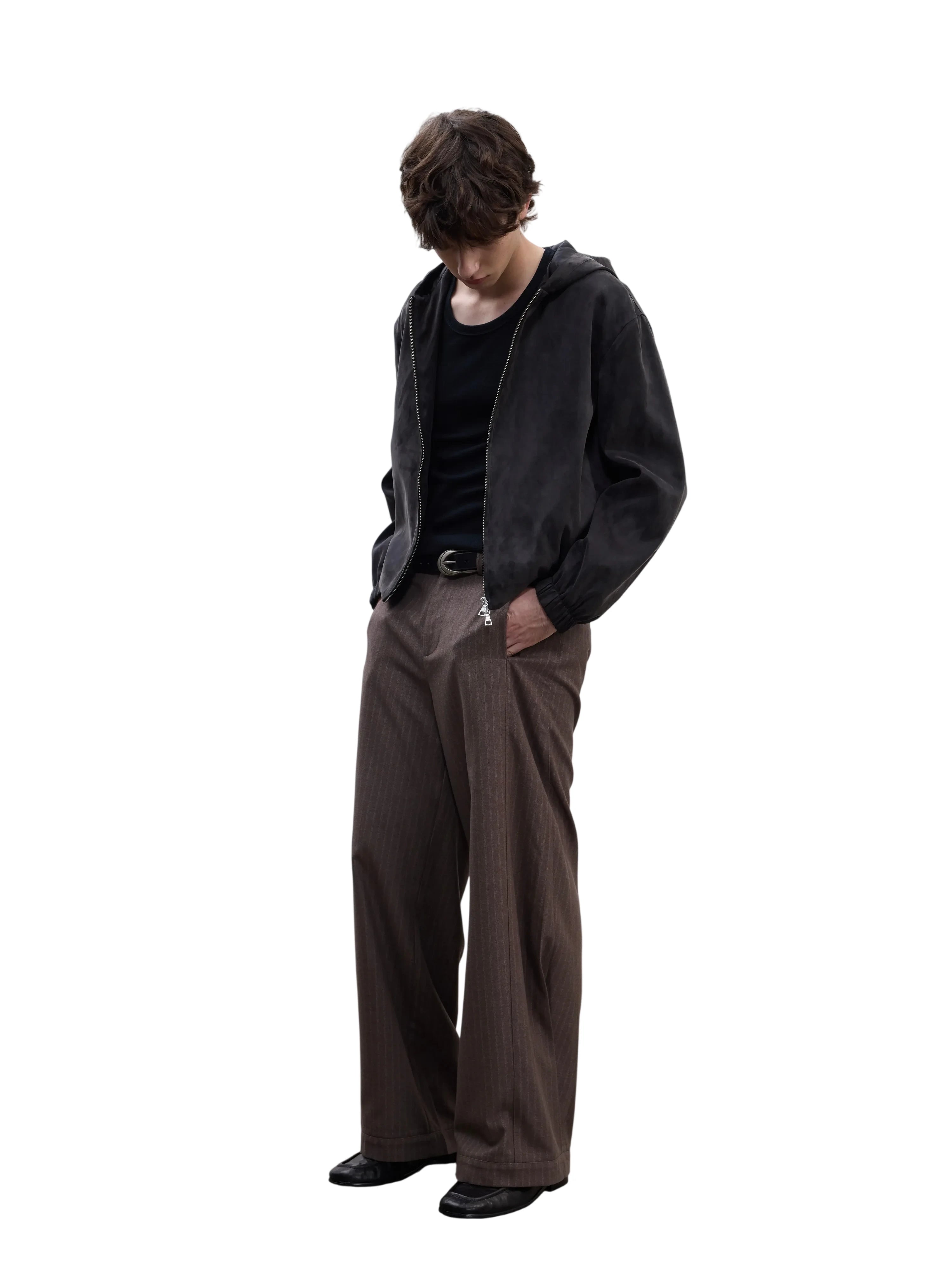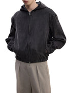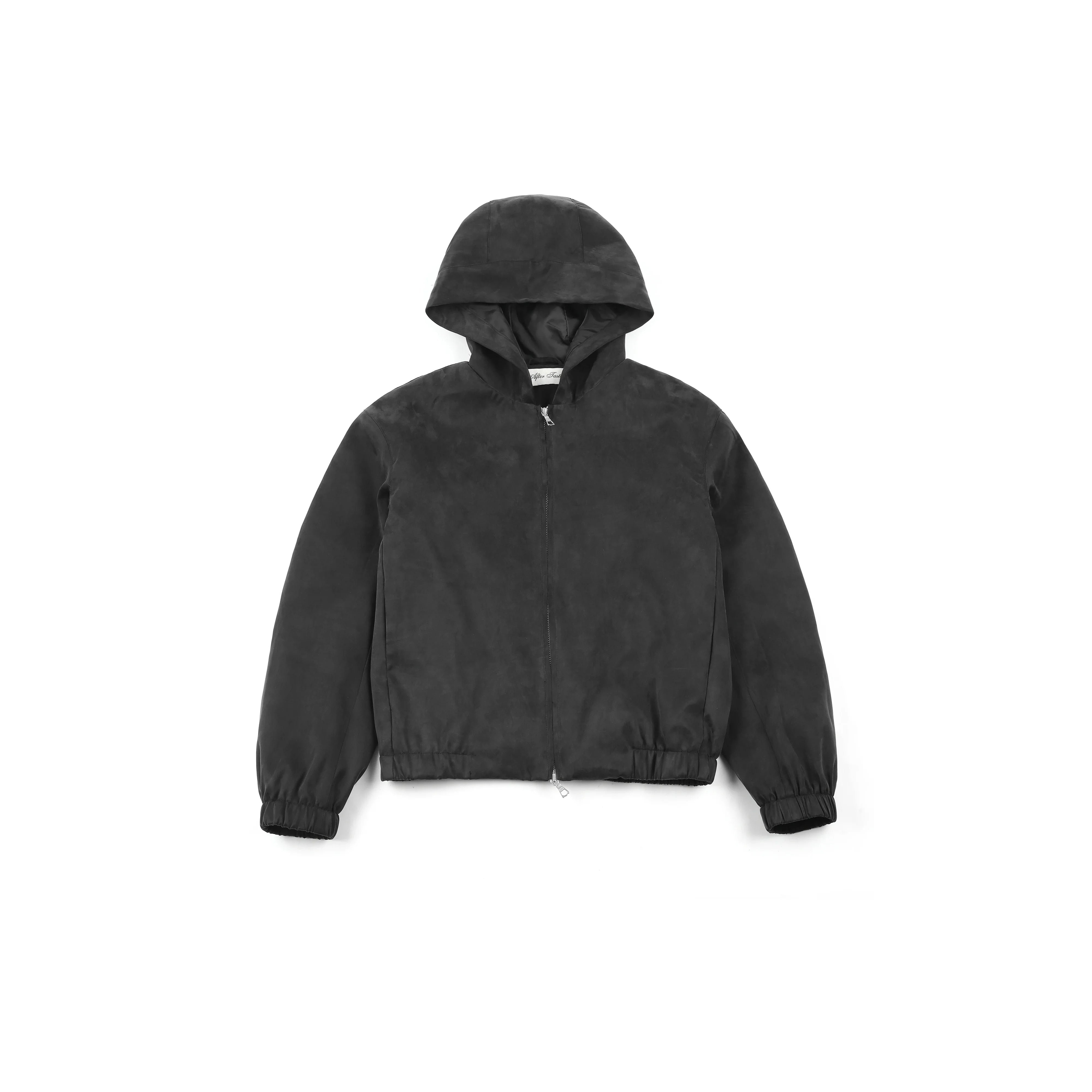 Designed for men, this hooded jacket features a sleek, minimalist aesthetic in a deep charcoal hue. Crafted with a soft, suede-like fabric, it offers a lightweight and comfortable outerwear option. The sandwashed treatment enhances its texture, giving it a refined and contemporary look. The jacket includes a full front zip closure, elasticated cuffs and hem for a secure fit, and discreet side pockets integrated seamlessly into the design. Perfect for transitional weather, this elevated essential combines style with simple functionality.