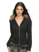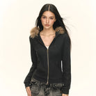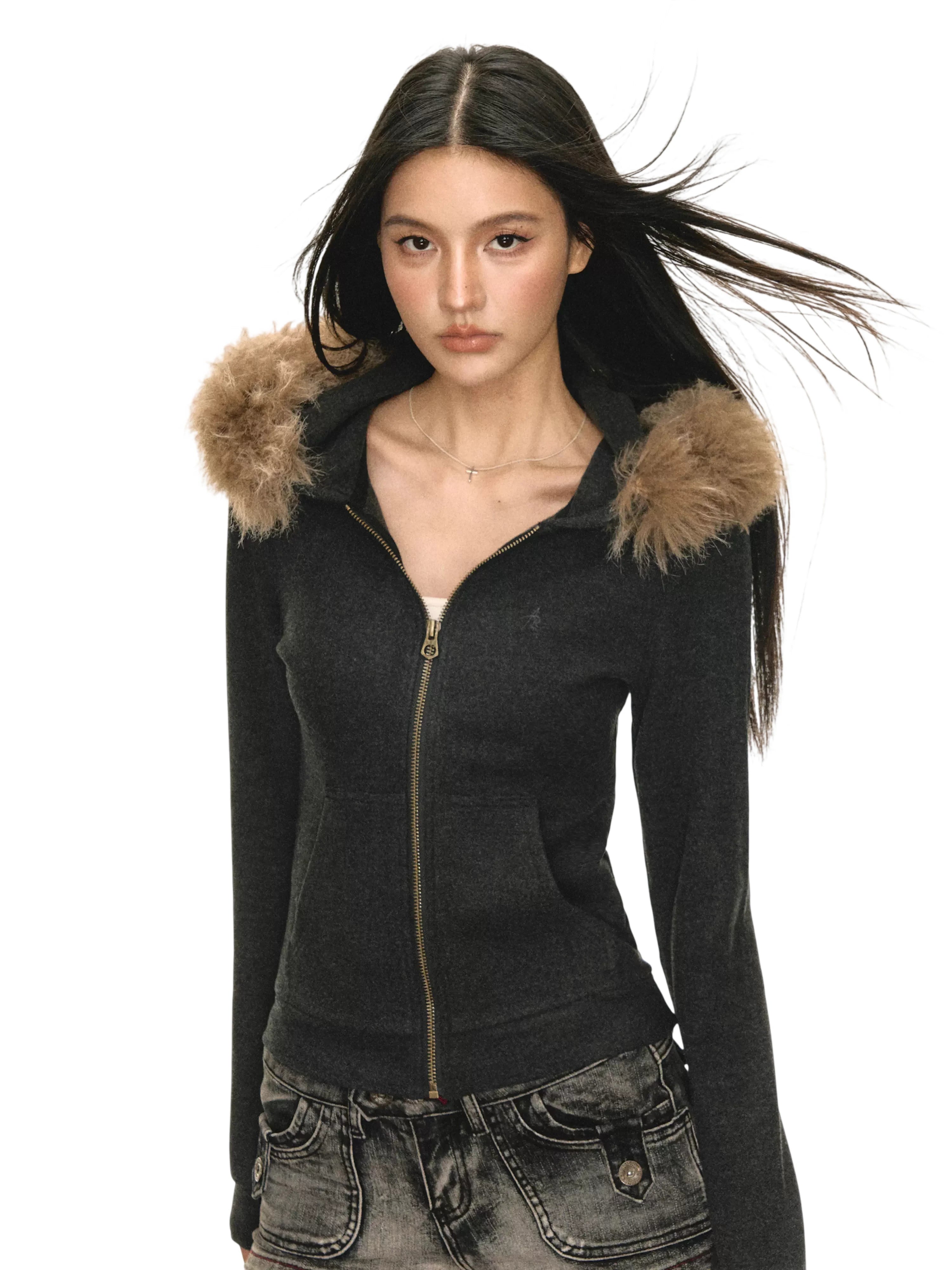 This stylish women's hooded sweatshirt jacket features a unique blend of retro charm and playful edge. Designed with a soft, comfortable fabric, it includes a statement faux fur collar that is detachable for versatile looks. The large hood is adorned with black devil horn accents, adding a bold, whimsical touch. A front zipper and side pockets provide everyday practicality, while the cropped length makes it a great choice for autumn layering.