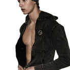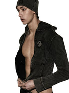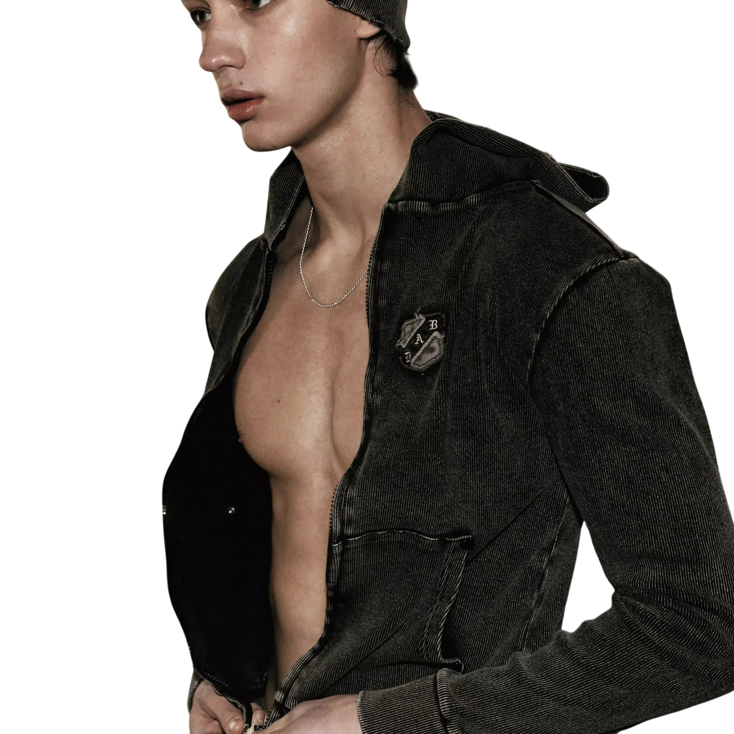 This slim fit hooded denim jacket features a vintage-inspired design with a dark wash finish. Made from a textured fabric resembling corduroy or denim, it showcases detailed seam accents along the shoulders, sleeves, and torso for a tailored look.