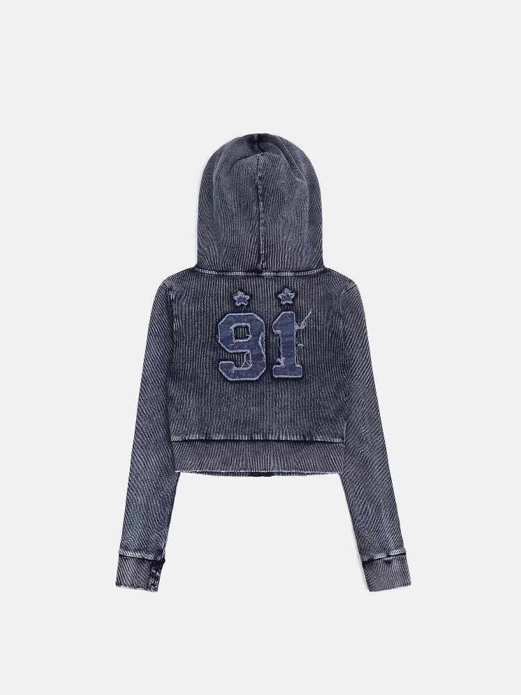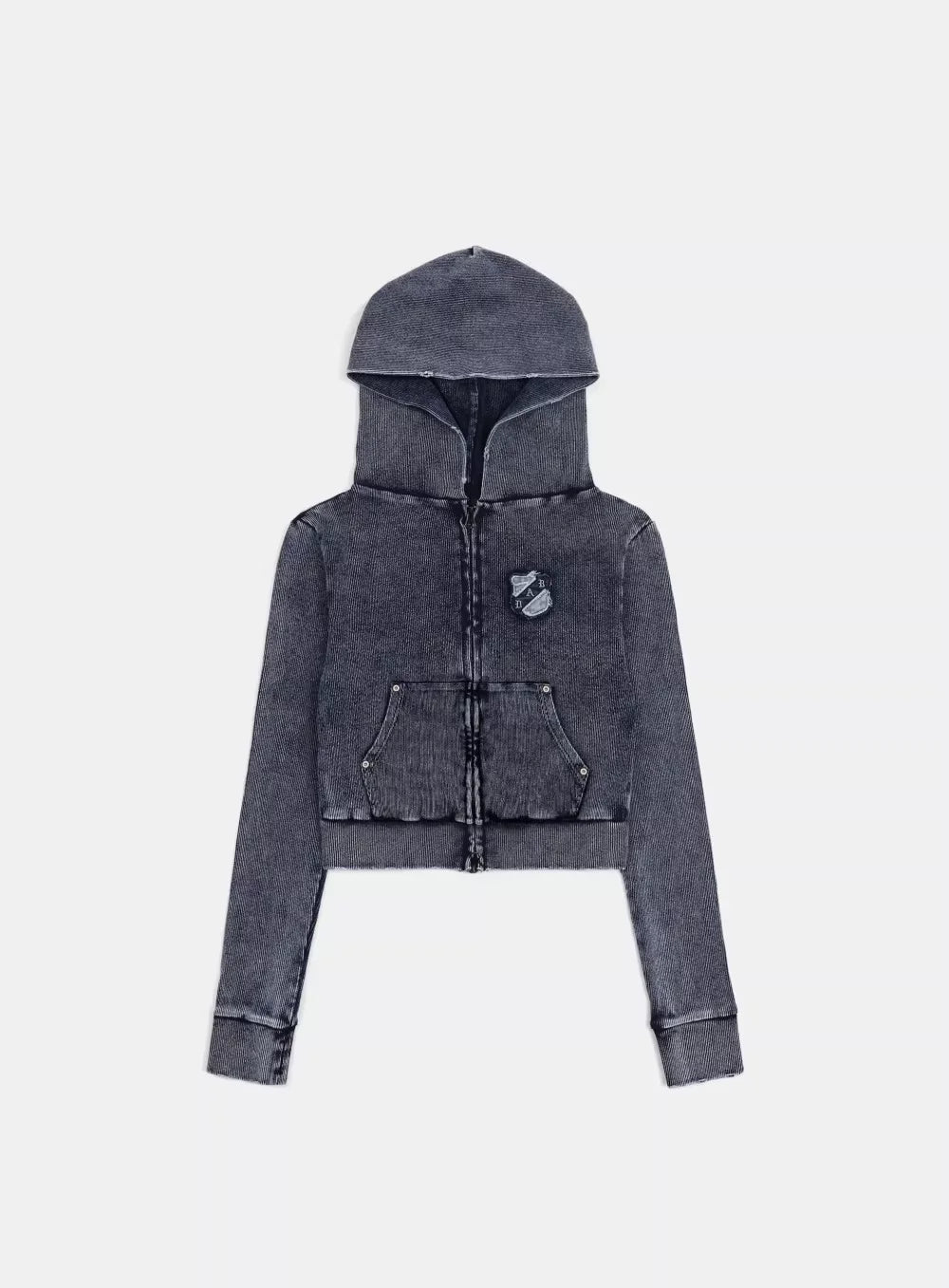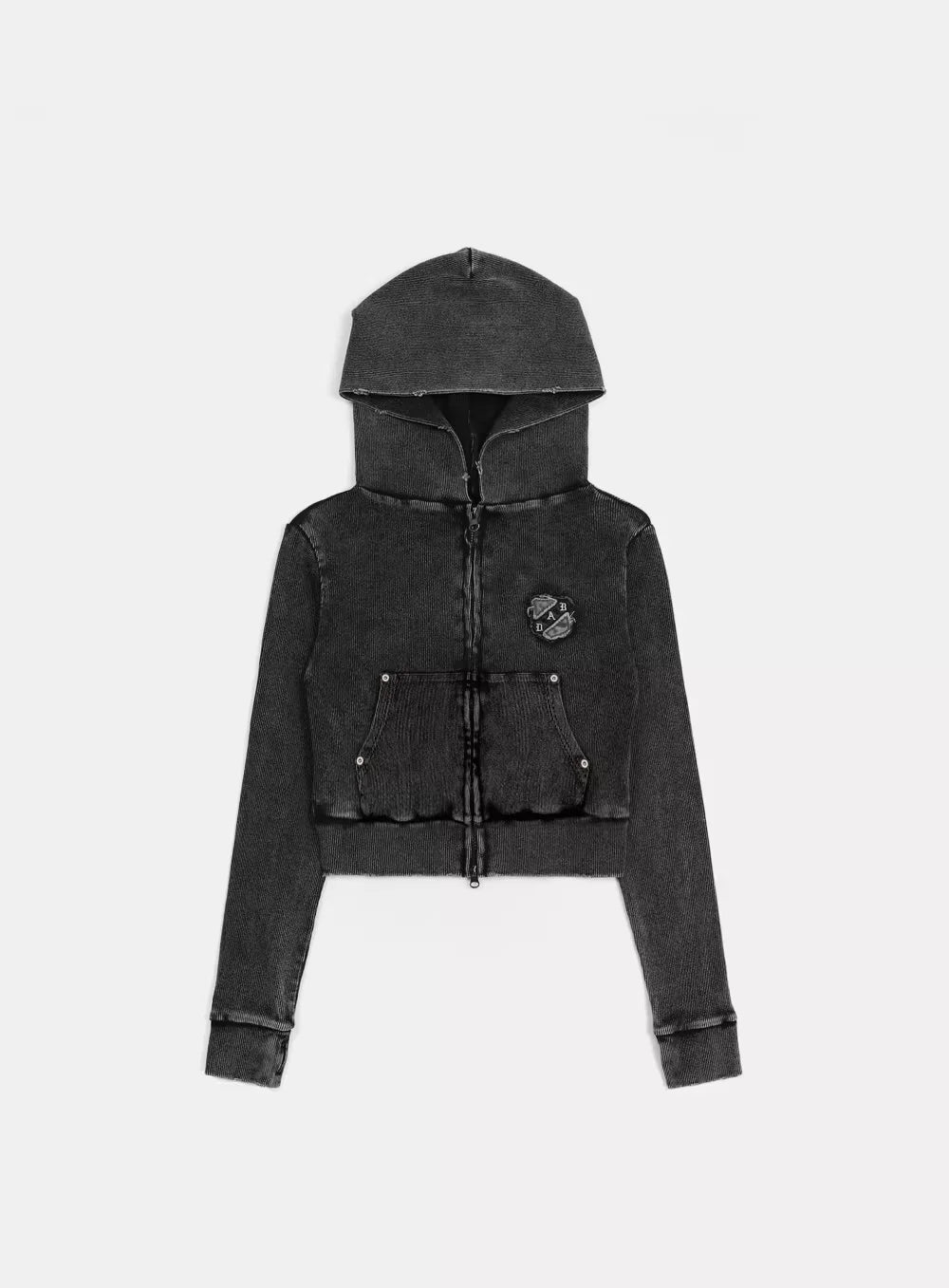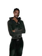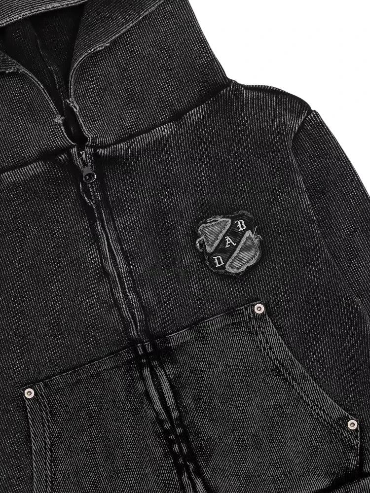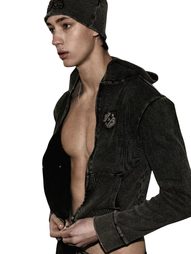Embroidered with an 'A B' patch on the left chest, this stylish zip-up hoodie adds a distinctive touch to any outfit. Worn here by a male model, it's paired with a matching beanie and silver chain necklace for a rugged, urban-inspired aesthetic.