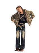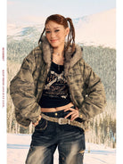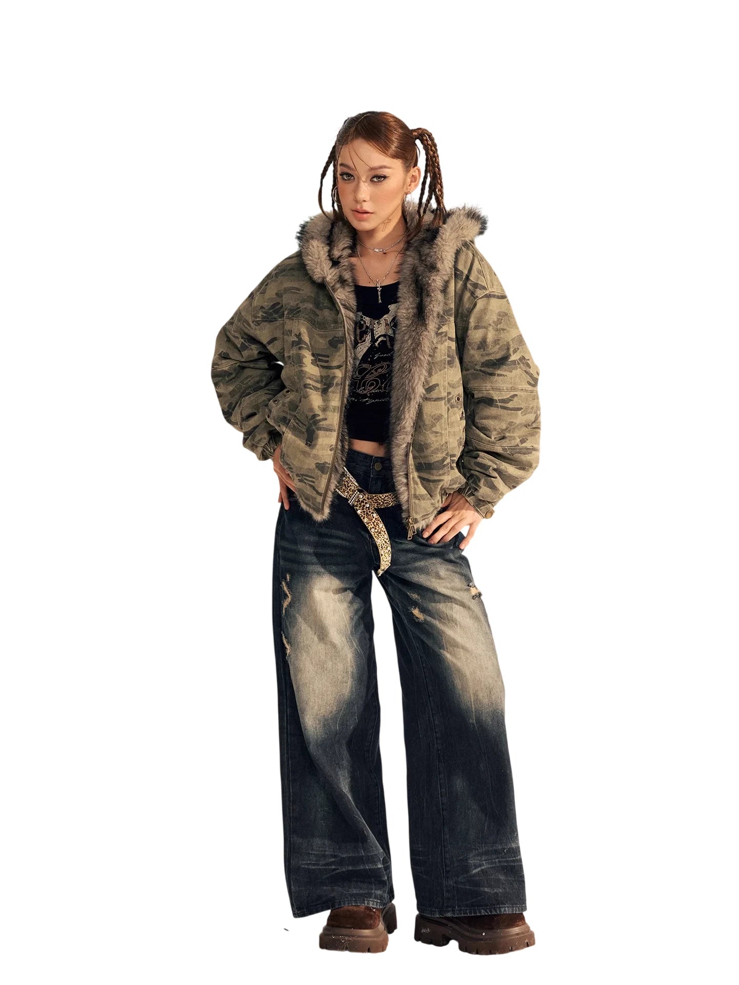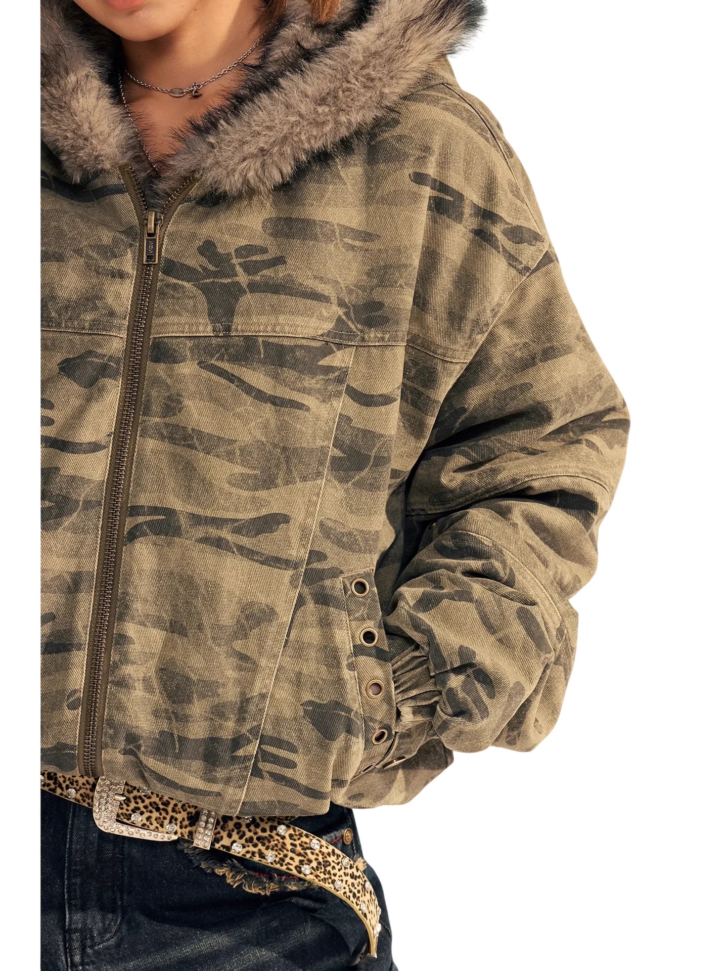 Stay warm and stylish in this women's camouflage padded jacket, crafted from premium cotton and designed with a plush faux fur-lined hood for added insulation. The washed fabric enhances its street-style aesthetic, making it perfect for urban winter wear. Pair it effortlessly with jeans and layered accessories for a bold cold-weather look.