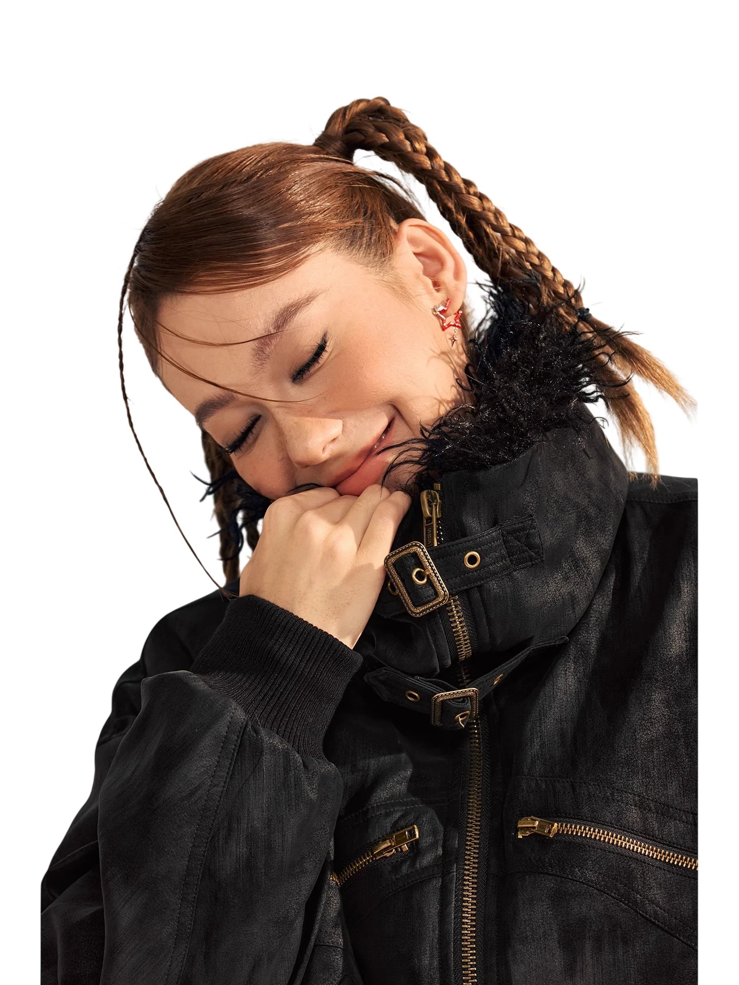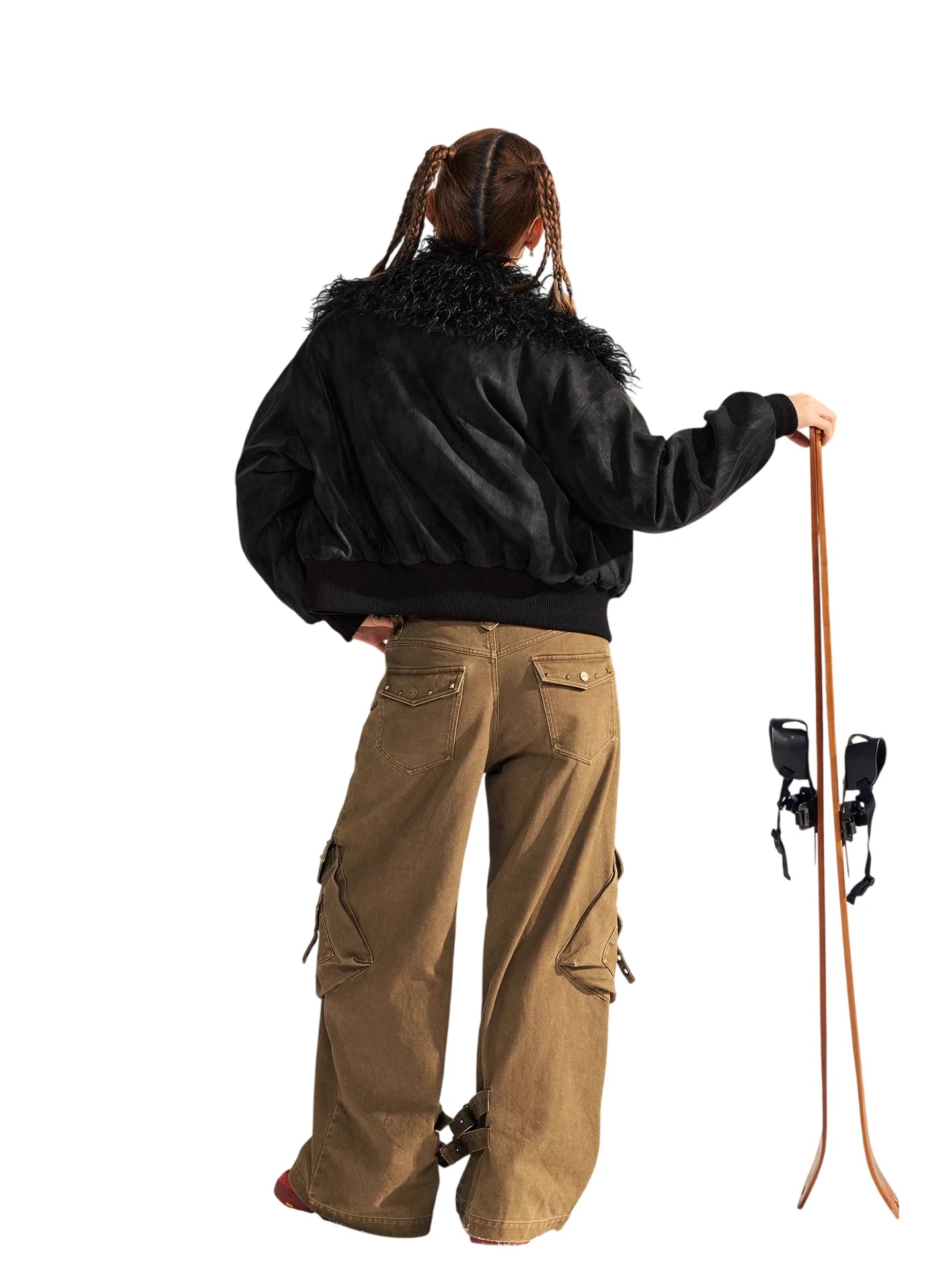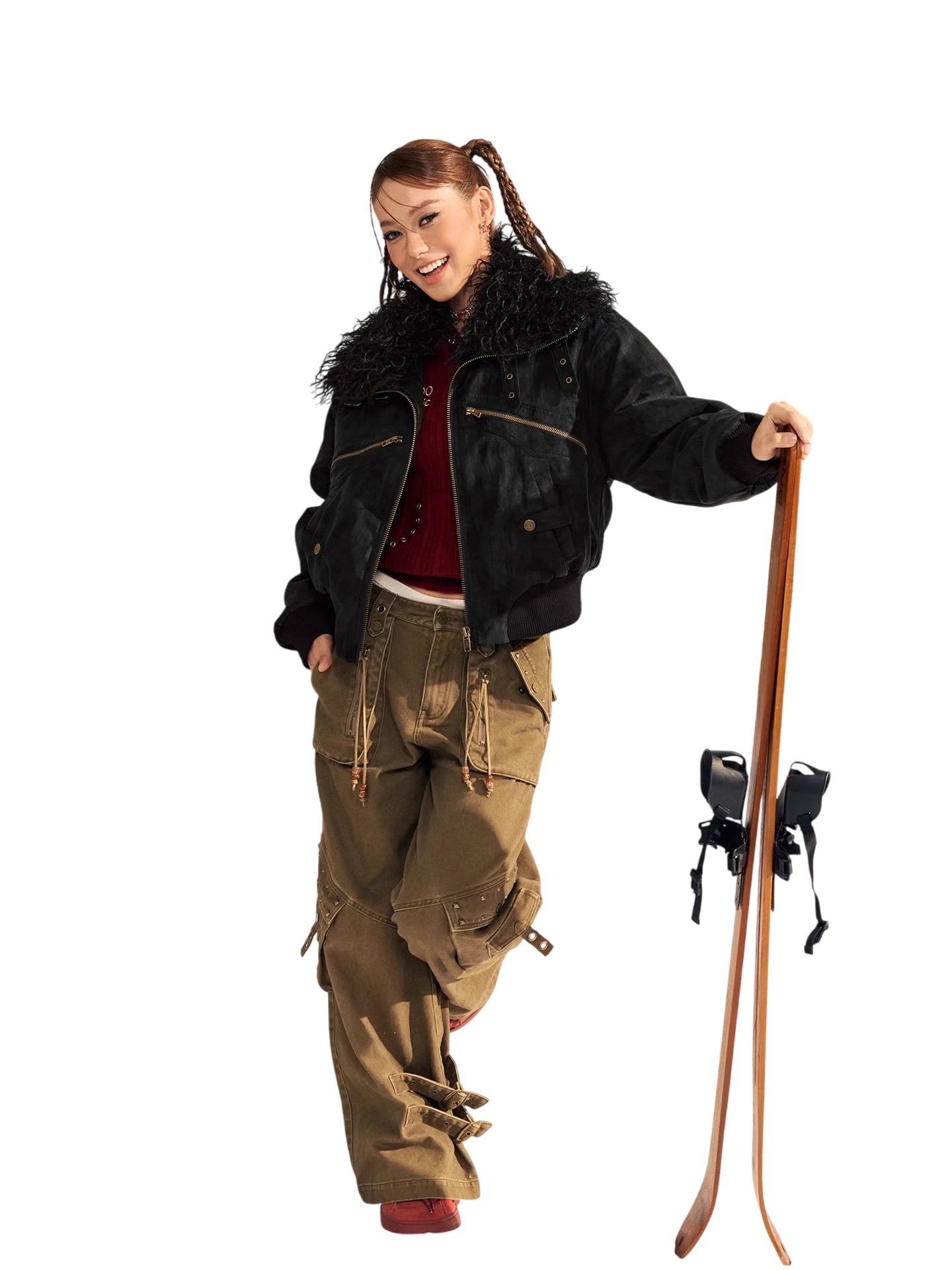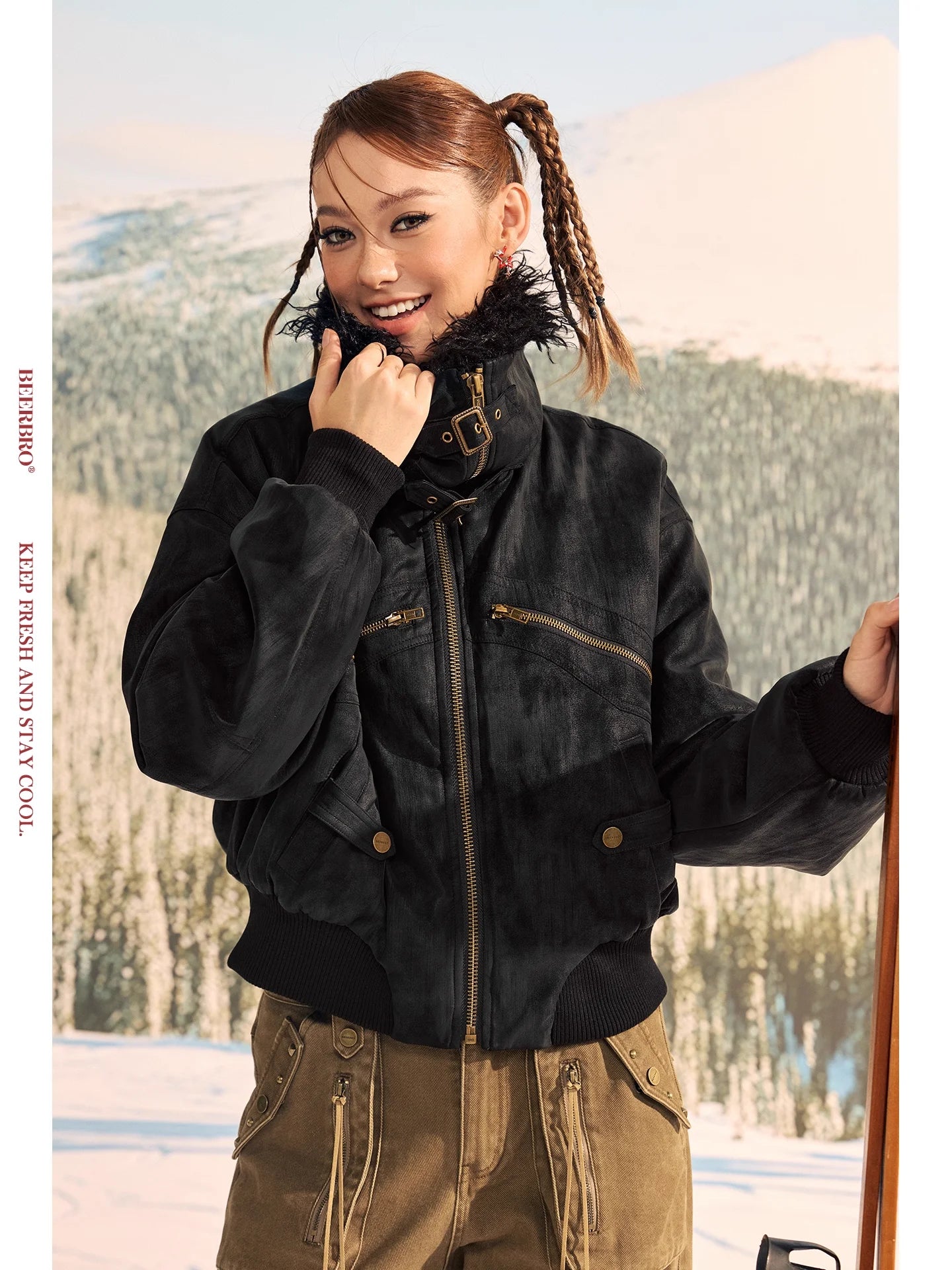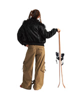 Stay warm and stylish this winter with this thickened PU suede jacket for women. Designed with a luxurious faux fur-lined large lapel and high collar, this jacket provides both comfort and protection against the cold. It features a bomber-style silhouette with ribbed cuffs and hem, creating a snug fit. Functional details include multiple gold-toned zipper and flap pockets, offering both style and practicality. Perfect for outdoor winter settings, this jacket blends fashion and functionality effortlessly.