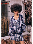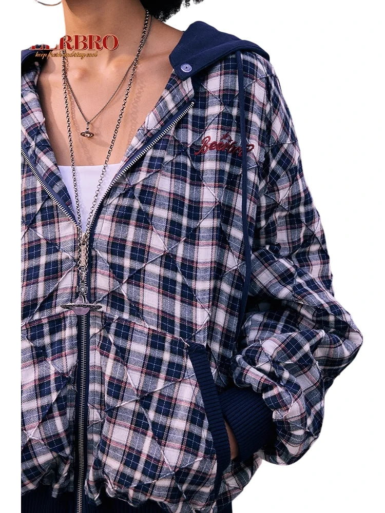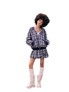 Embrace nostalgic style with this Y2K-inspired two-piece set, featuring a zip-up hooded jacket and a matching high-waisted A-line skirt. Designed in a classic navy blue, white, and red plaid pattern, the cotton jacket offers ribbed cuffs, hem, and hood lining, along with front pockets for added comfort. The embroidered pleated skirt flatters the figure with its slim, feminine silhouette. Perfect for cool weather, this coordinated look adds a trendy retro edge to your wardrobe.