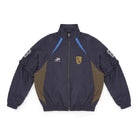 This men's bomber-style coach jacket features a modern athletic silhouette with a vintage twist. Designed in a deep navy blue with warm brown side accents, it showcases a bold number "8" printed on the back and sleeve. The jacket includes detachable sleeves for versatile wear and an adjustable drawstring at the waist for a customized fit. Ideal for transitional seasons, it blends retro sportswear aesthetics with functional design.
