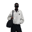 Step into autumn with this men's oversized workwear jacket, designed for ultimate comfort and street-style appeal. Crafted from a soft suede-like fabric in a light gray tone, this jacket features a stylish wide bud collar, a zip-up front, and a zippered chest pocket for added utility.