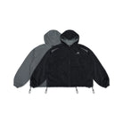 Stay versatile and stylish with this men's reversible hooded sports jacket. Featuring a unique double-sided design, one side offers a cozy solid grey fleece perfect for chillier days, while the other showcases a sleek black exterior with grey shoulder accents for a more athletic look. This functional jacket includes a full-zip front, adjustable drawstring hem, two side pockets, and a printed chest logo for a sporty touch.