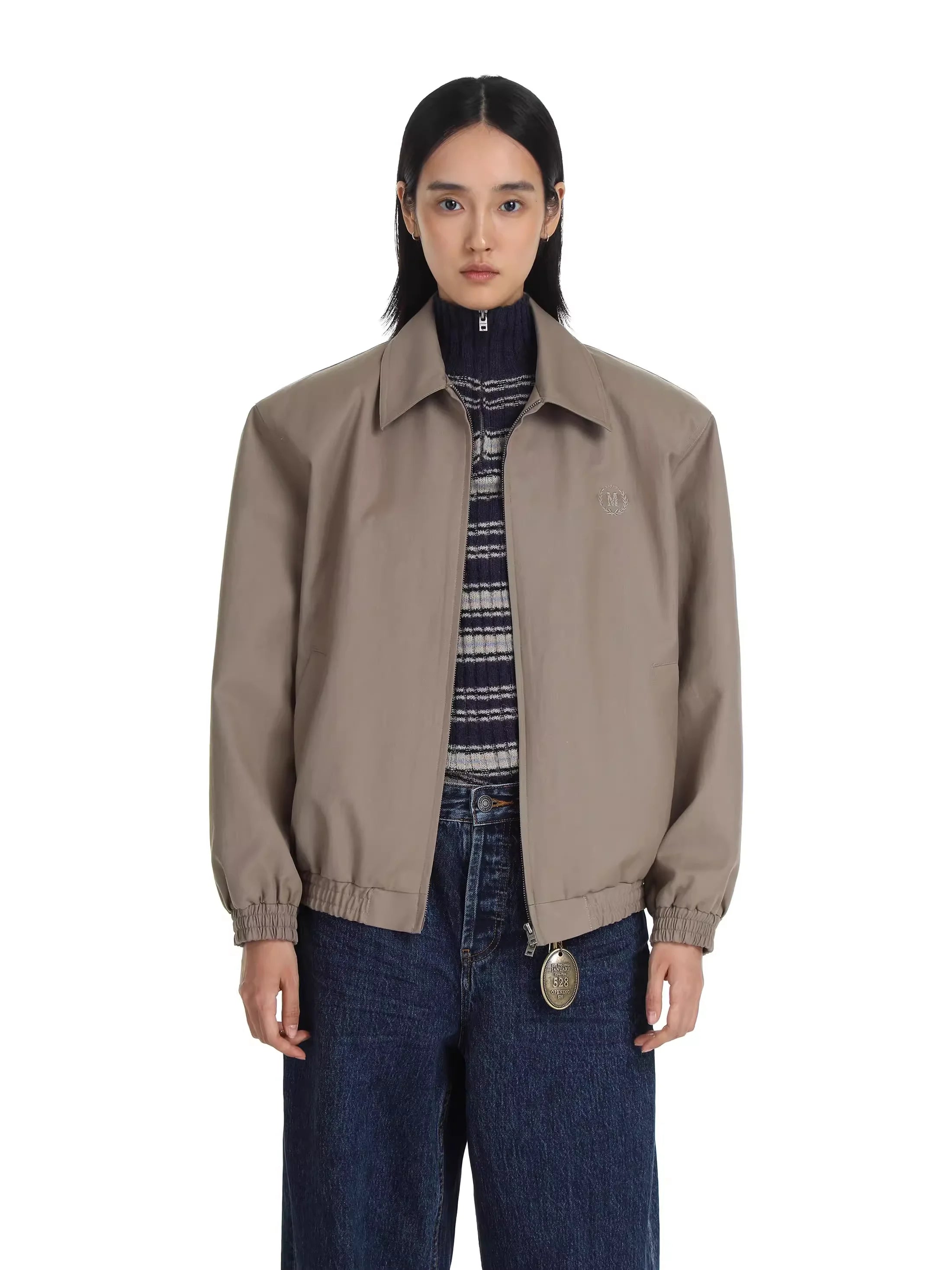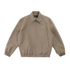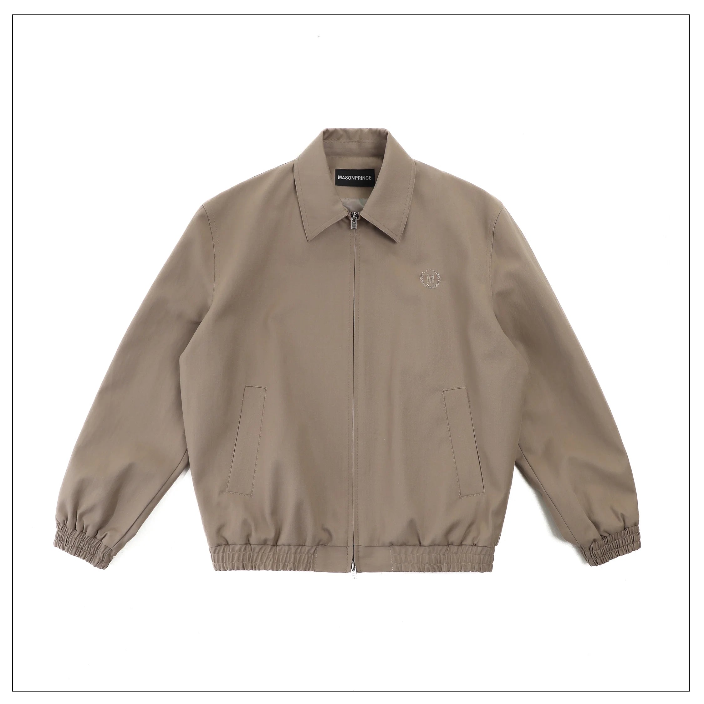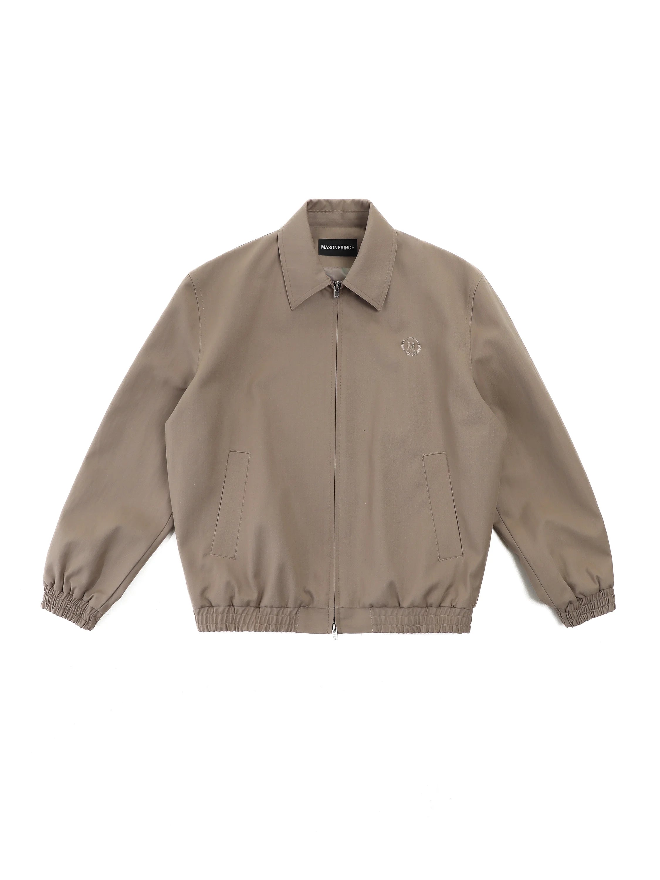 This men's vintage-style jacket features a structured lapel design with built-in shoulder pads for a defined silhouette. Crafted in a light brown tone, it includes a zip-up front and two vertical welt pockets for a clean, understated look. Subtle embroidered detailing on the left chest adds a touch of refined branding. Elasticized cuffs and hem provide a secure, comfortable fit, making this jacket a versatile choice for casual or elevated everyday wear.