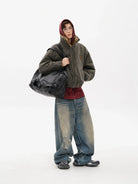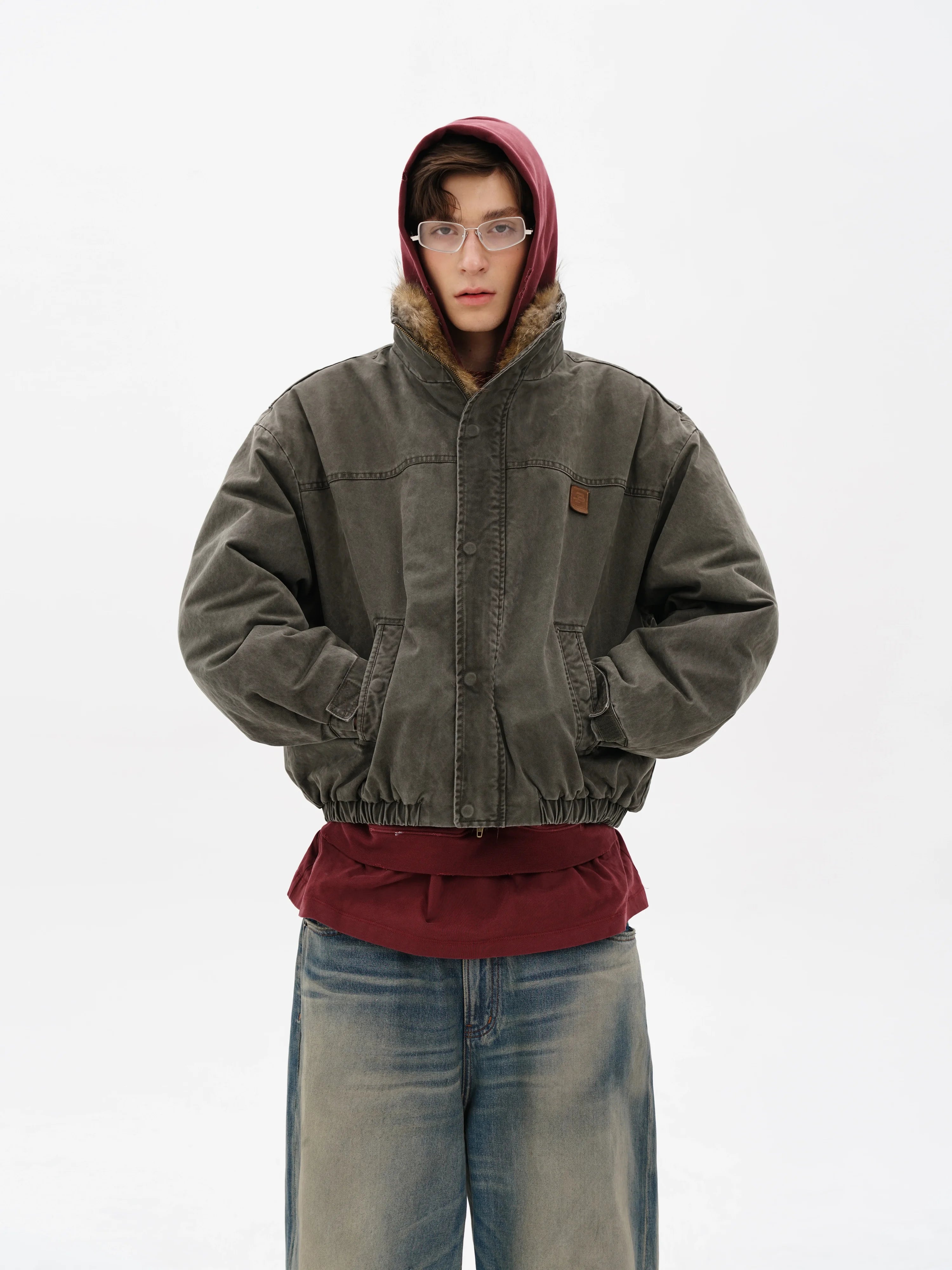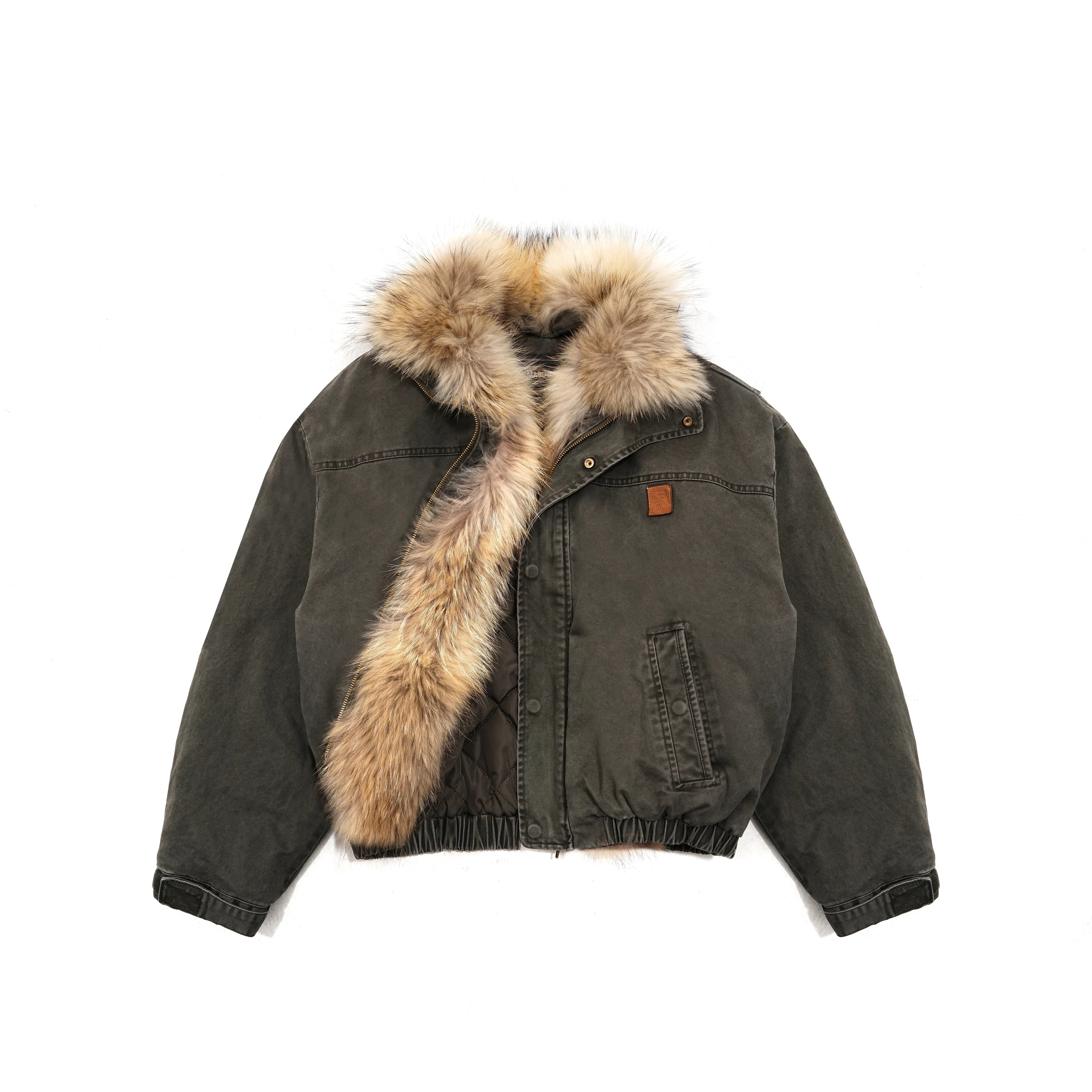 The jacket's highlight is its oversized real fur trim, wrapping around the collar or hood in luxurious tones of tan, brown, and grey for rich texture and enhanced warmth. A small leather patch on the chest adds a distinctive detail. Perfectly suited for cold-weather outings or outdoor adventures.