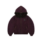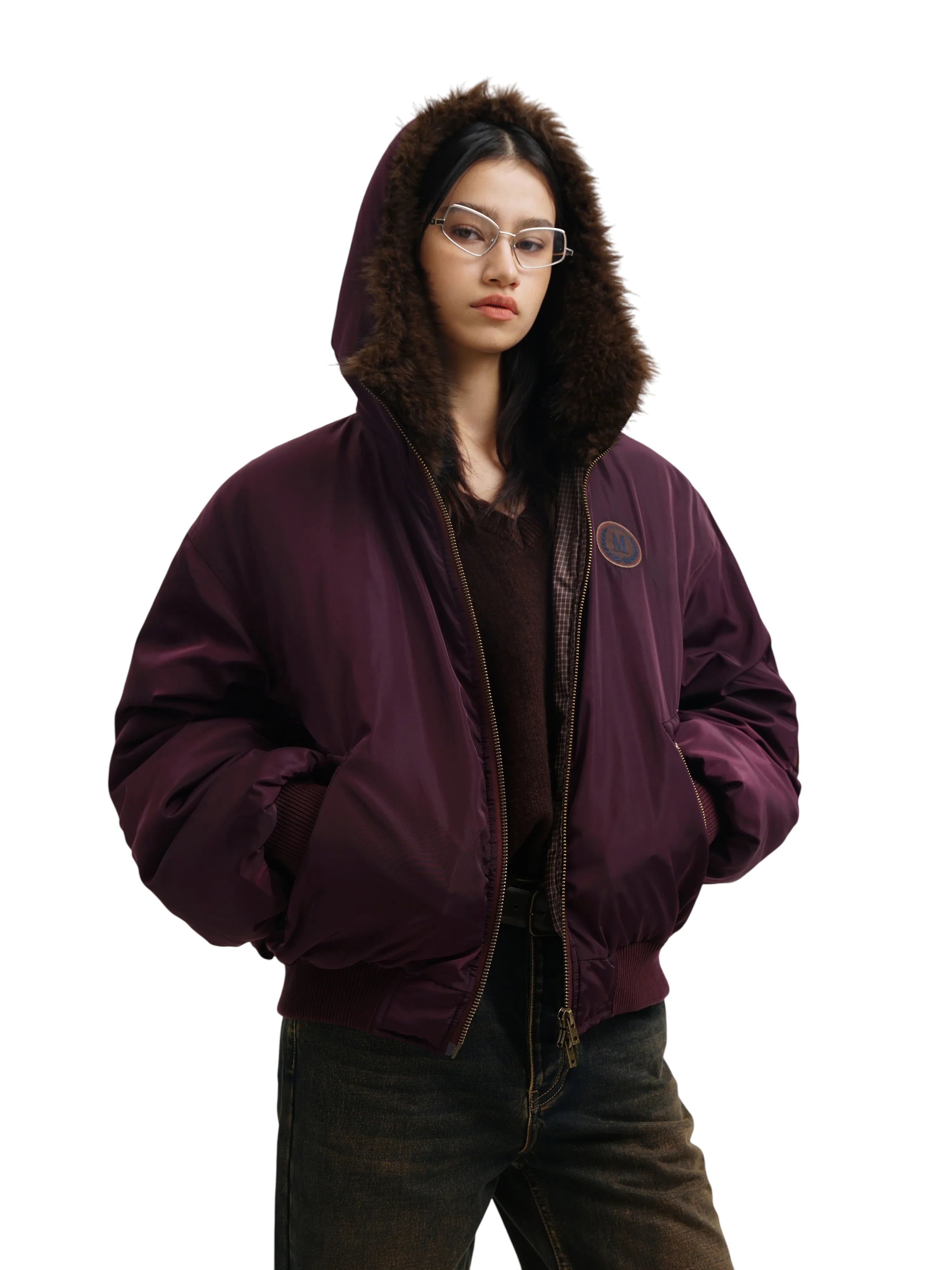 Stay warm and stylish with this women's hooded plaid puffer jacket. Designed in a rich burgundy color, it features a cozy faux fur trim around the hood for added protection against the cold. The jacket offers a relaxed, slightly oversized fit with a thick insulated structure, ribbed cuffs and hem, and a secure zipper closure.