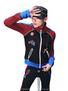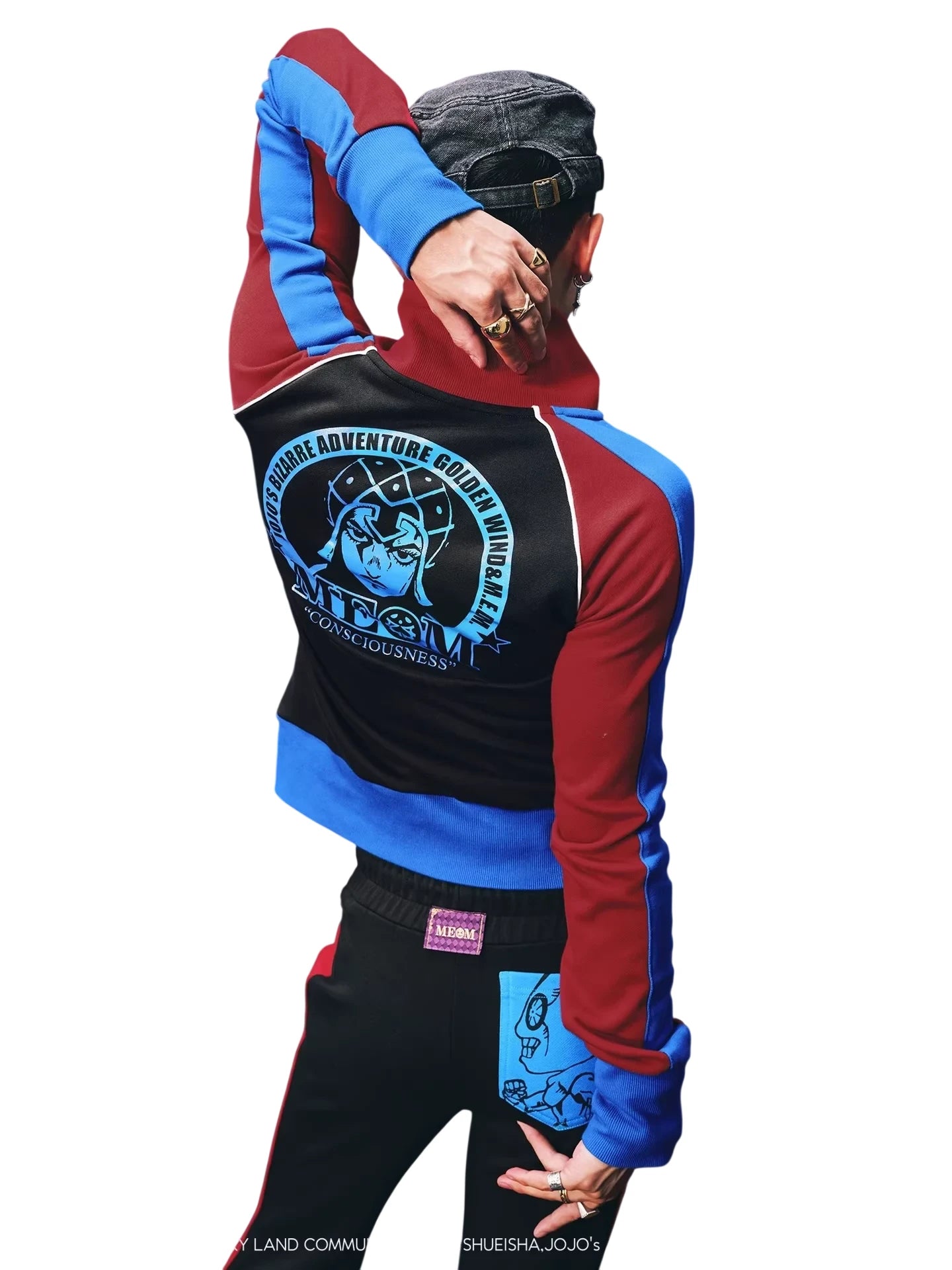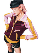 Elevate your casual style with this high-collar zip-up varsity jacket, designed for both men and women. Featuring a bold colorblock design with burgundy, pink, and yellow elements, this jacket showcases multiple embroidered patches and a standout chest detail. Inspired by anime aesthetics, its unique patchwork and detailing make it a perfect statement piece for fans of contemporary streetwear.