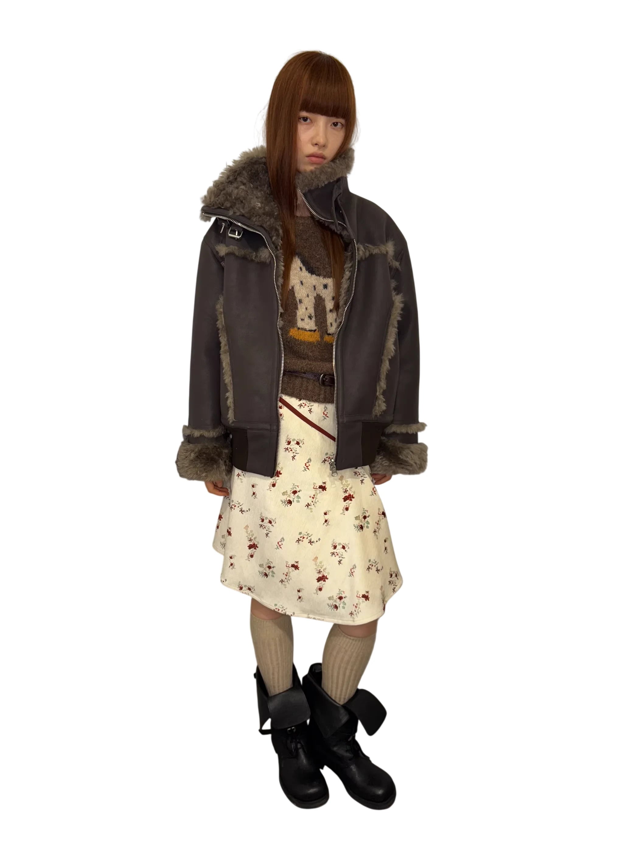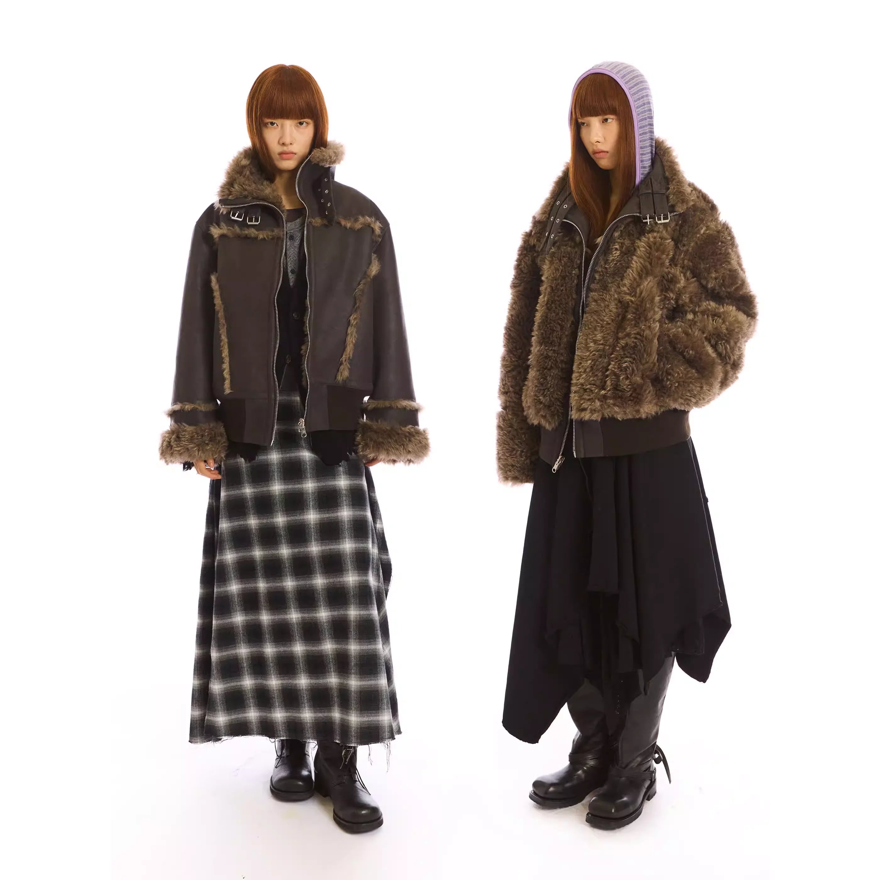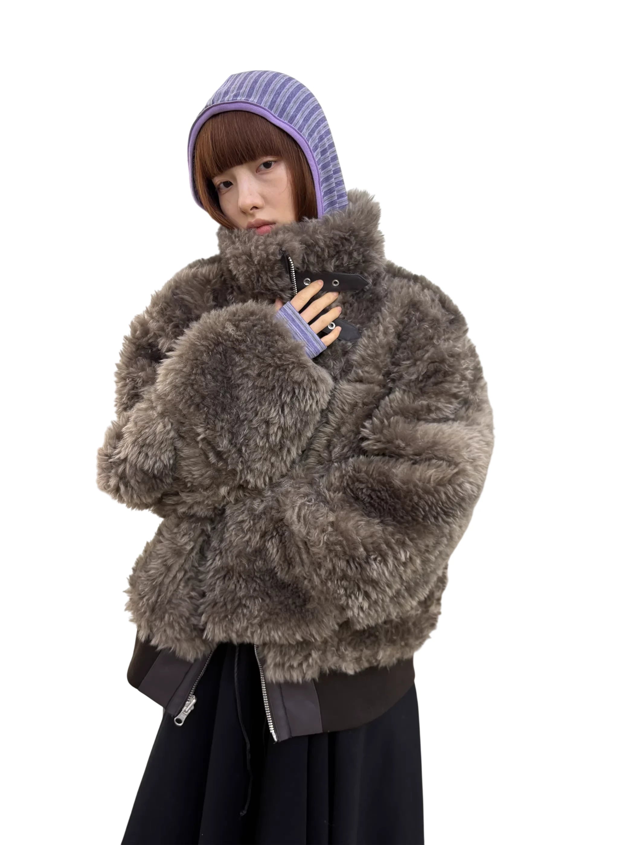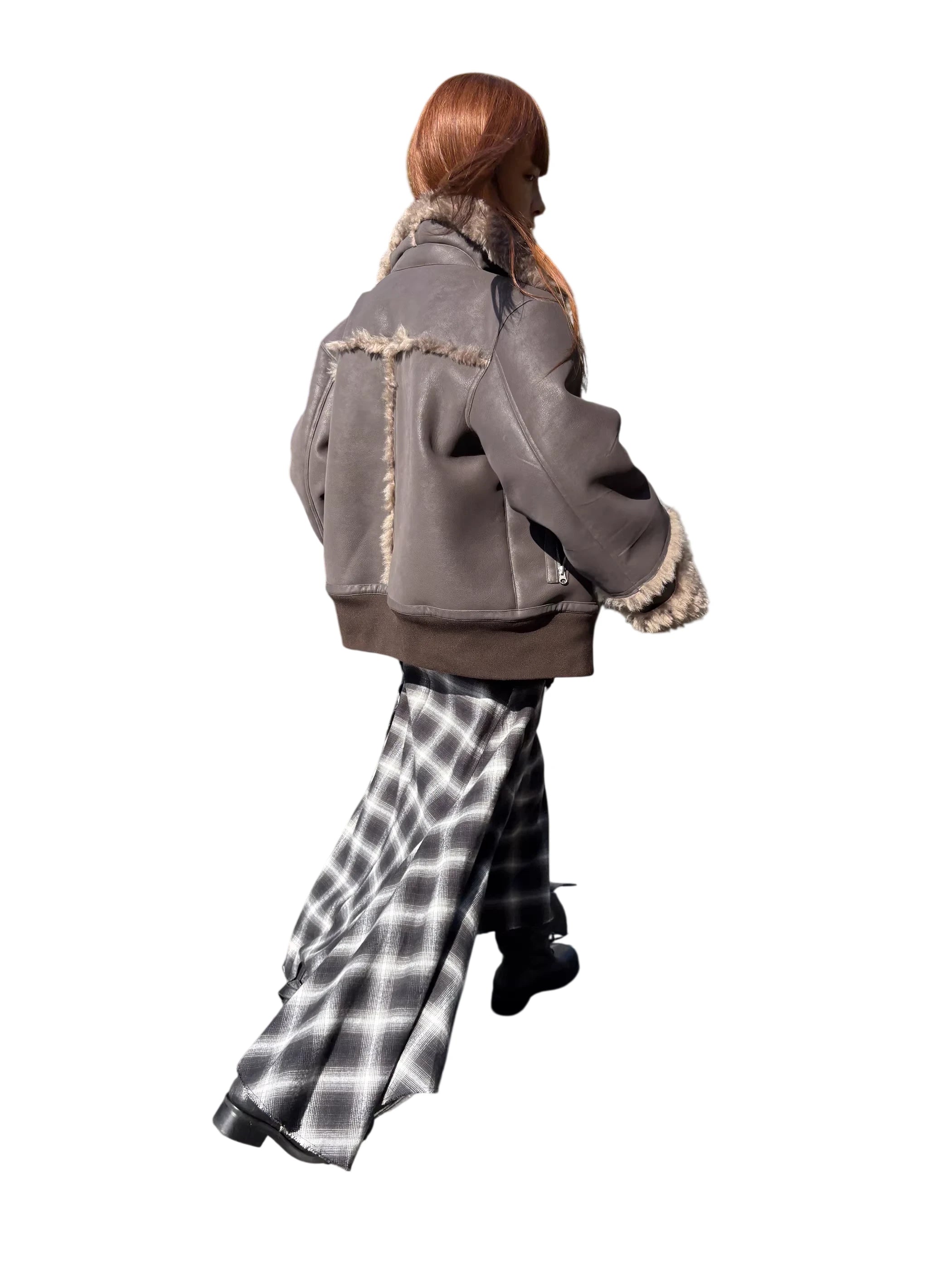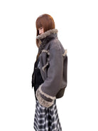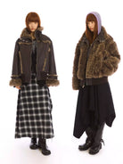 Elevate your winter wardrobe with this stylish reversible shearling jacket. Designed with a stand collar and plush fur-trim accents on the cuffs, collar, and seams, this warm outerwear piece is both functional and fashionable. Featured on a female model, the jacket complements a bold seasonal look, perfect for layering over skirts, boots, and statement winter essentials.