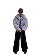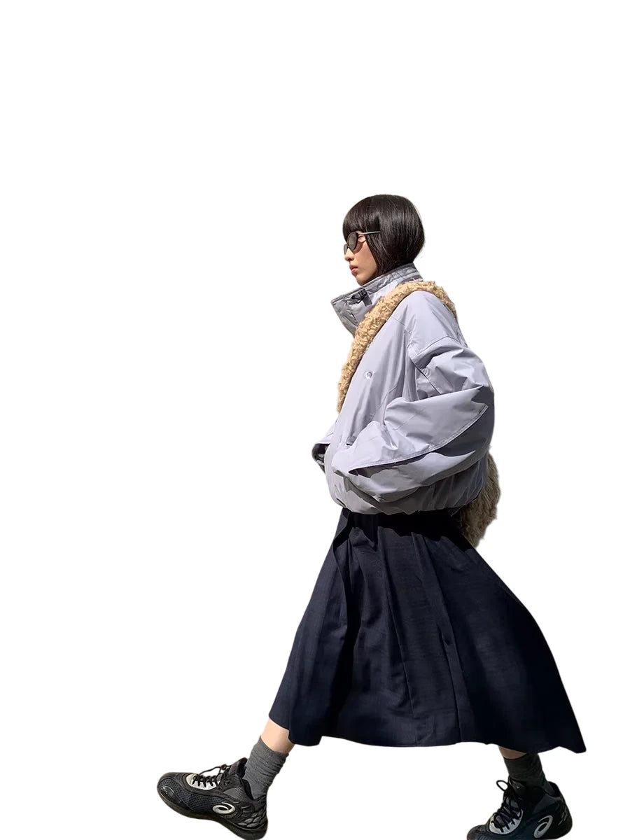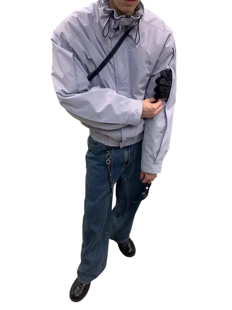This men's short ski jacket features a stand collar and is insulated with Thinsulate for optimal warmth and performance in cold weather. Designed with both functionality and fashion in mind, it blends outdoor utility with streetwear-inspired aesthetics. The jacket showcases an oversized silhouette in a light lavender tone, ideal for layering over formal and casual pieces alike. Its contemporary look is perfect for winter outings and urban adventures.