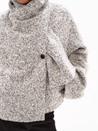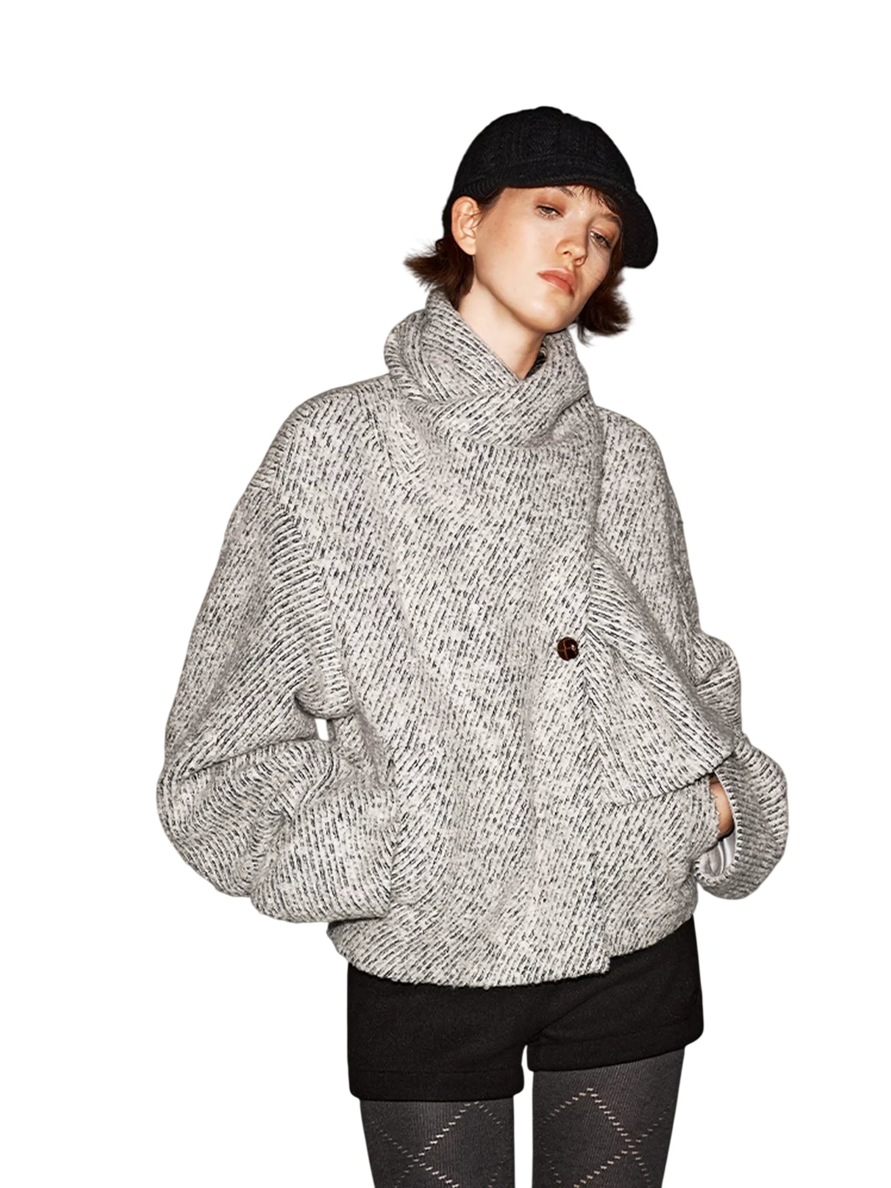 Elevate your fall and winter wardrobe with this stylish women's short coat, crafted from a 50% wool twill tweed fabric for warmth and texture. Designed with a modern asymmetrical silhouette, it features a high, wrap-around scarf collar that secures with a single button for a distinctive look. The relaxed, oversized fit and long sleeves offer comfort and effortless layering, while the textured gray finish adds a sophisticated touch. Perfect for pairing with tights or trousers, this coat brings contemporary elegance to seasonal dressing.