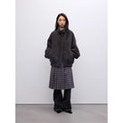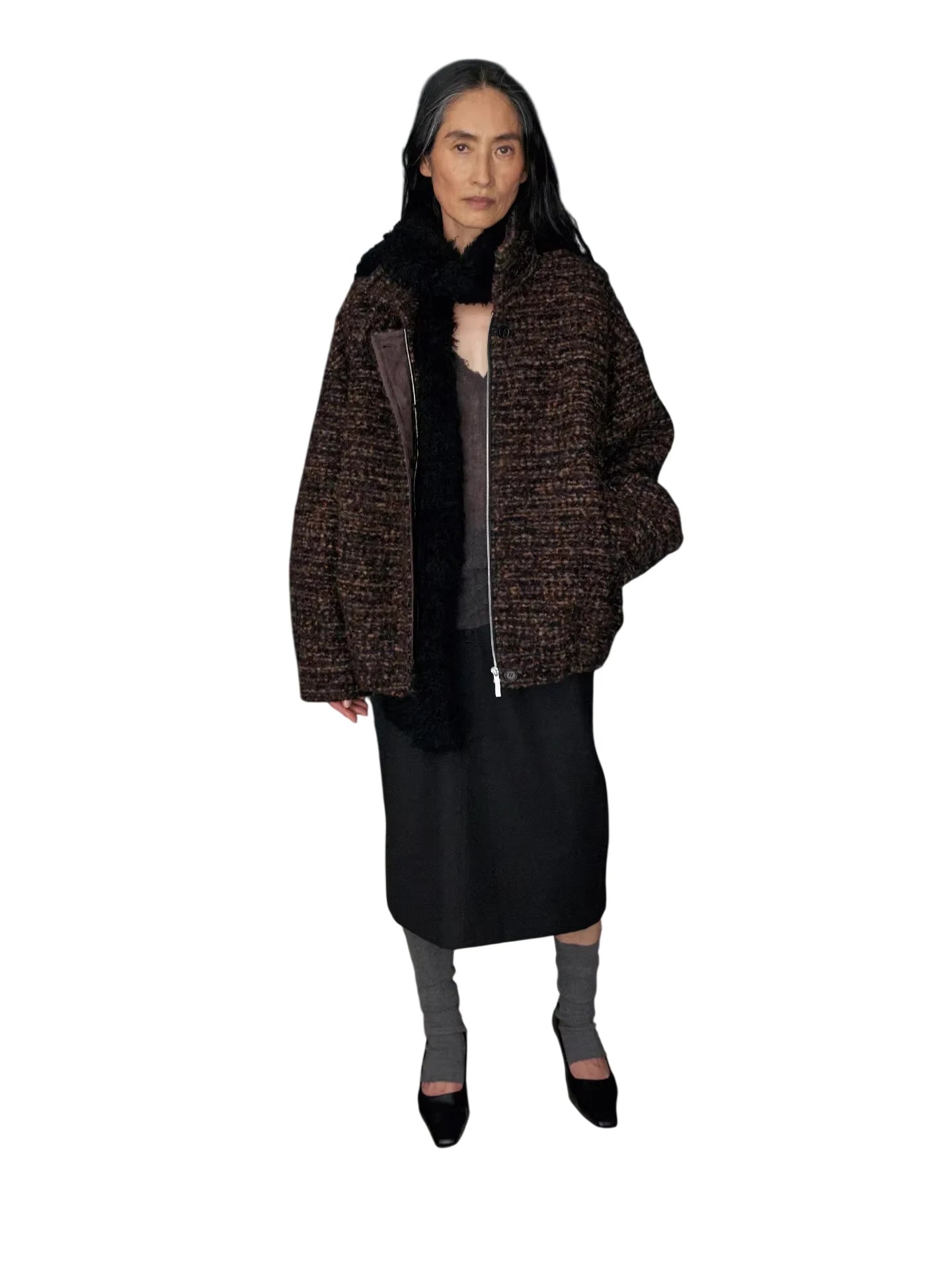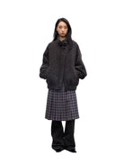 This women's oversized jacket features a plush alpaca wool blend in a bouclé texture for superior warmth and softness. Designed with a stand collar and voluminous sleeves, it offers a relaxed fit that combines comfort with modern style. The front zipper closure is partially concealed by a fabric flap with a button at the collar for a cozy and refined finish. Ideal for cool weather, this jacket brings a luxurious touch to everyday outerwear.
