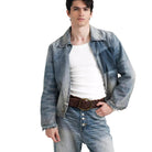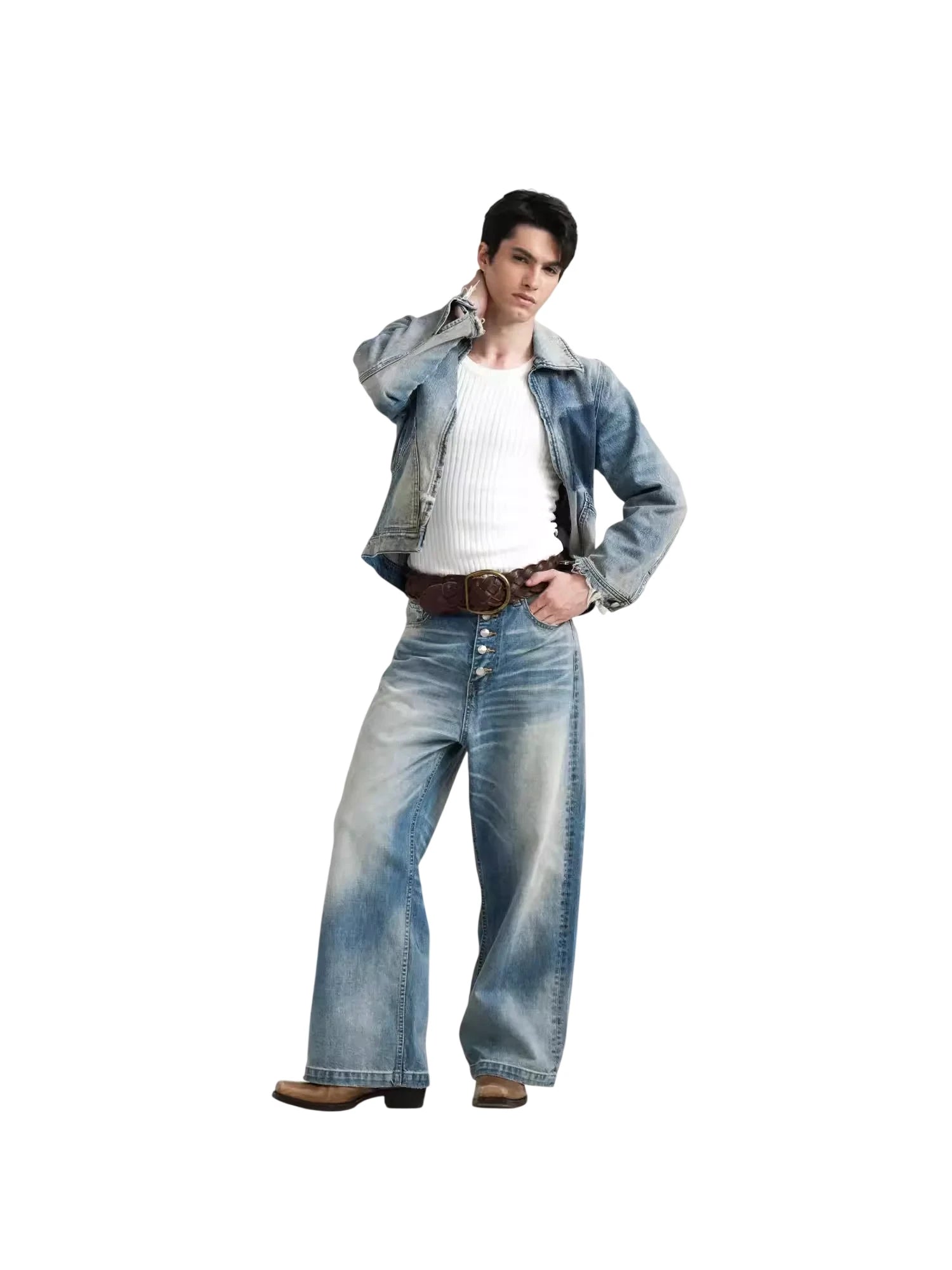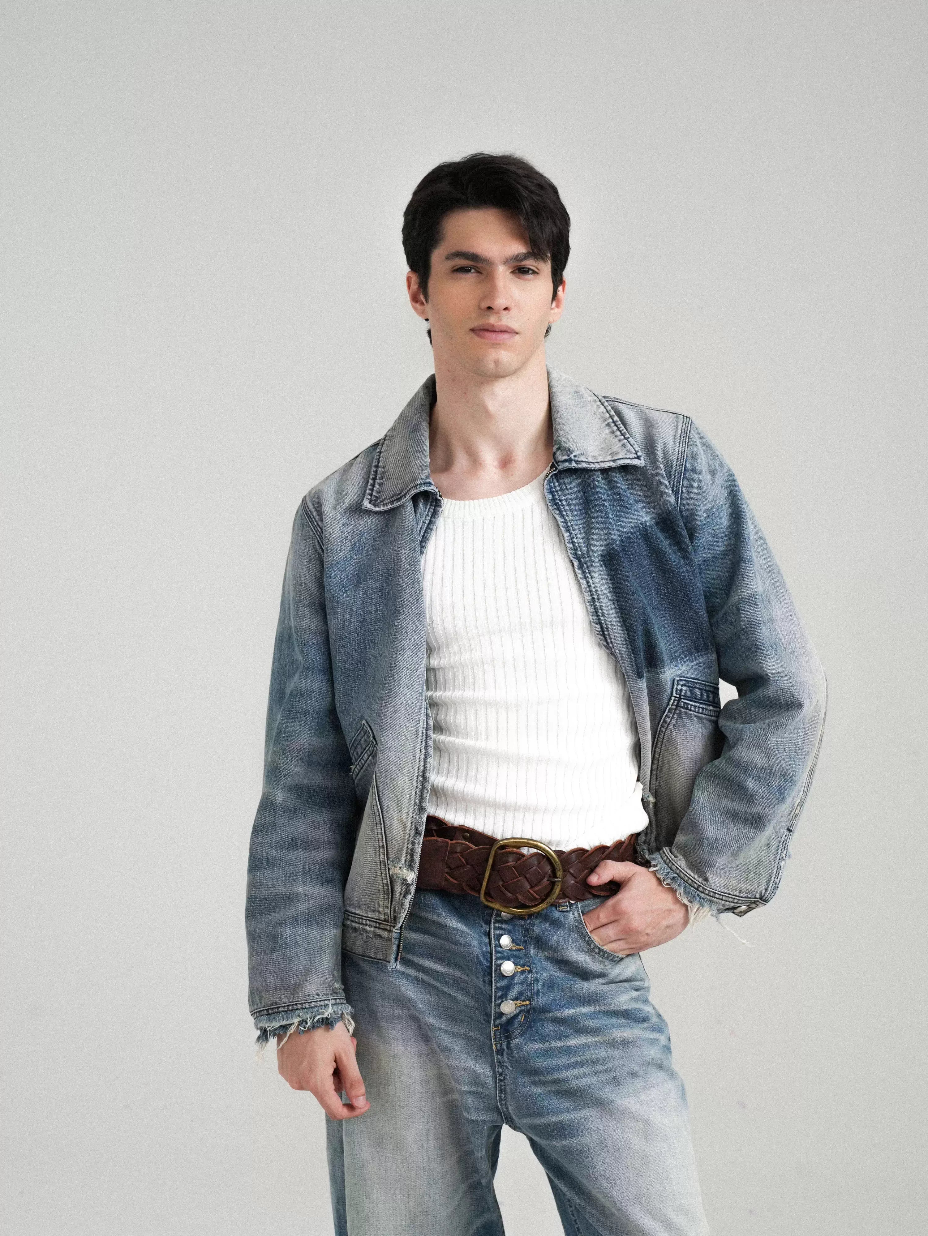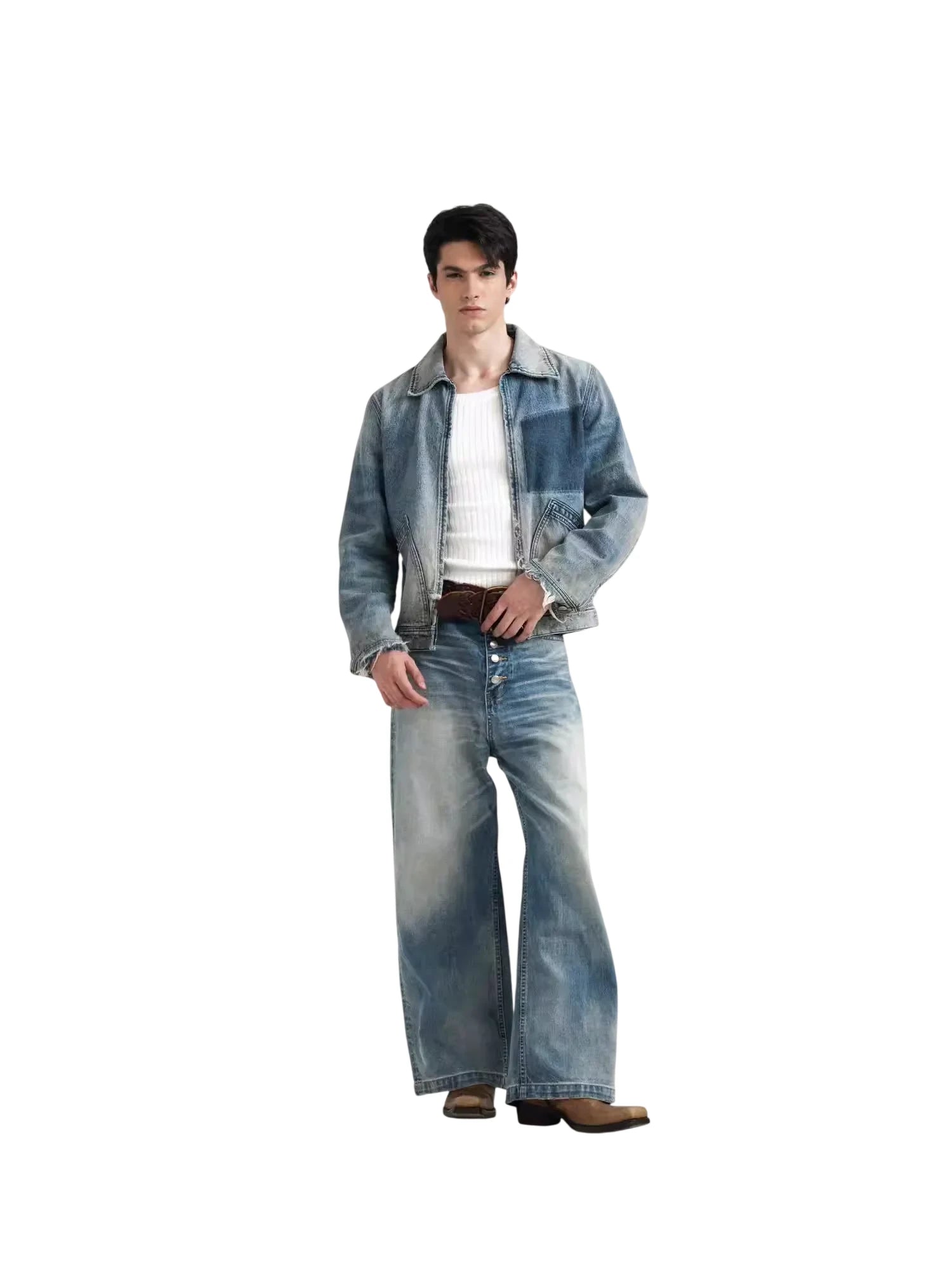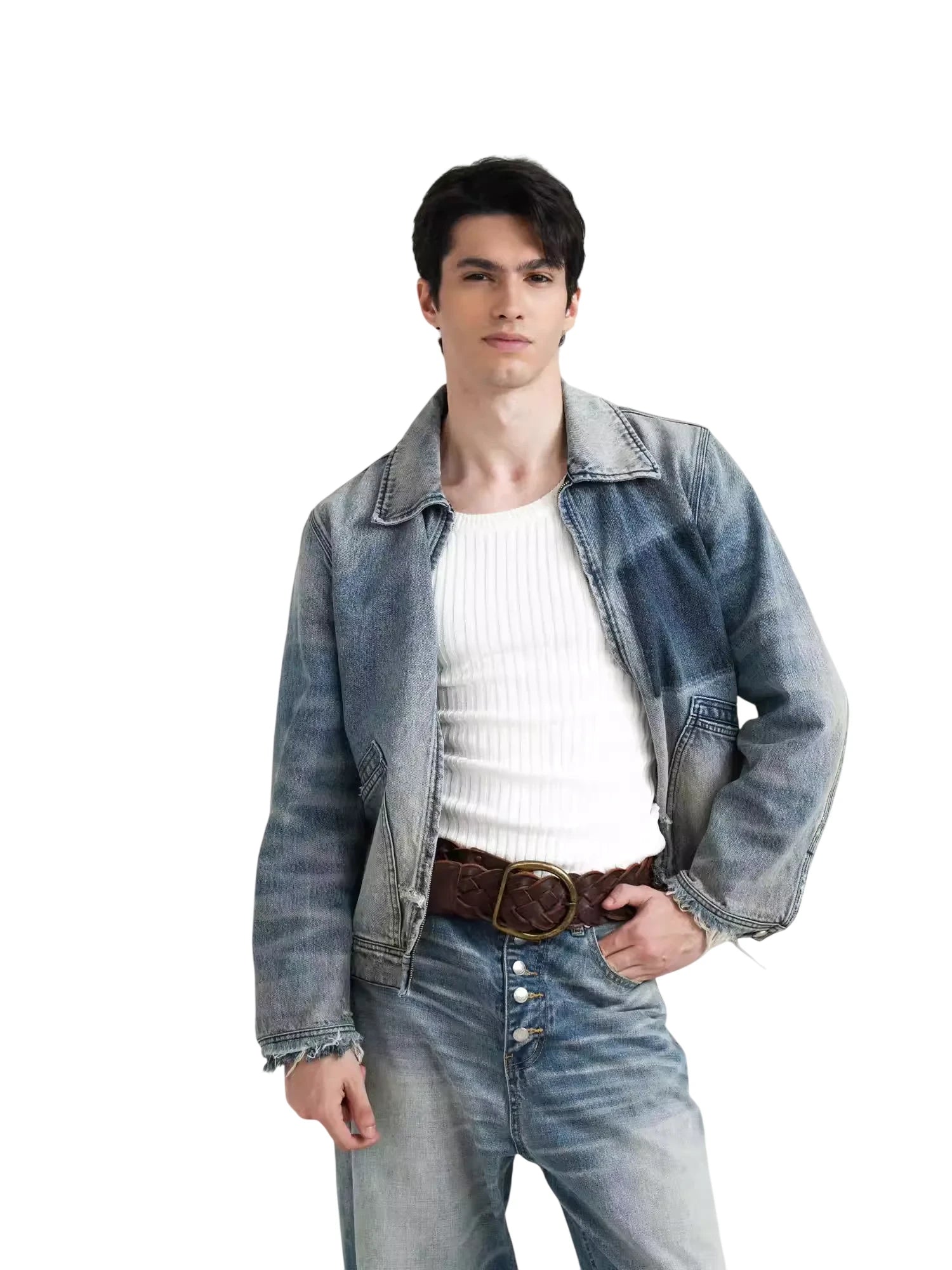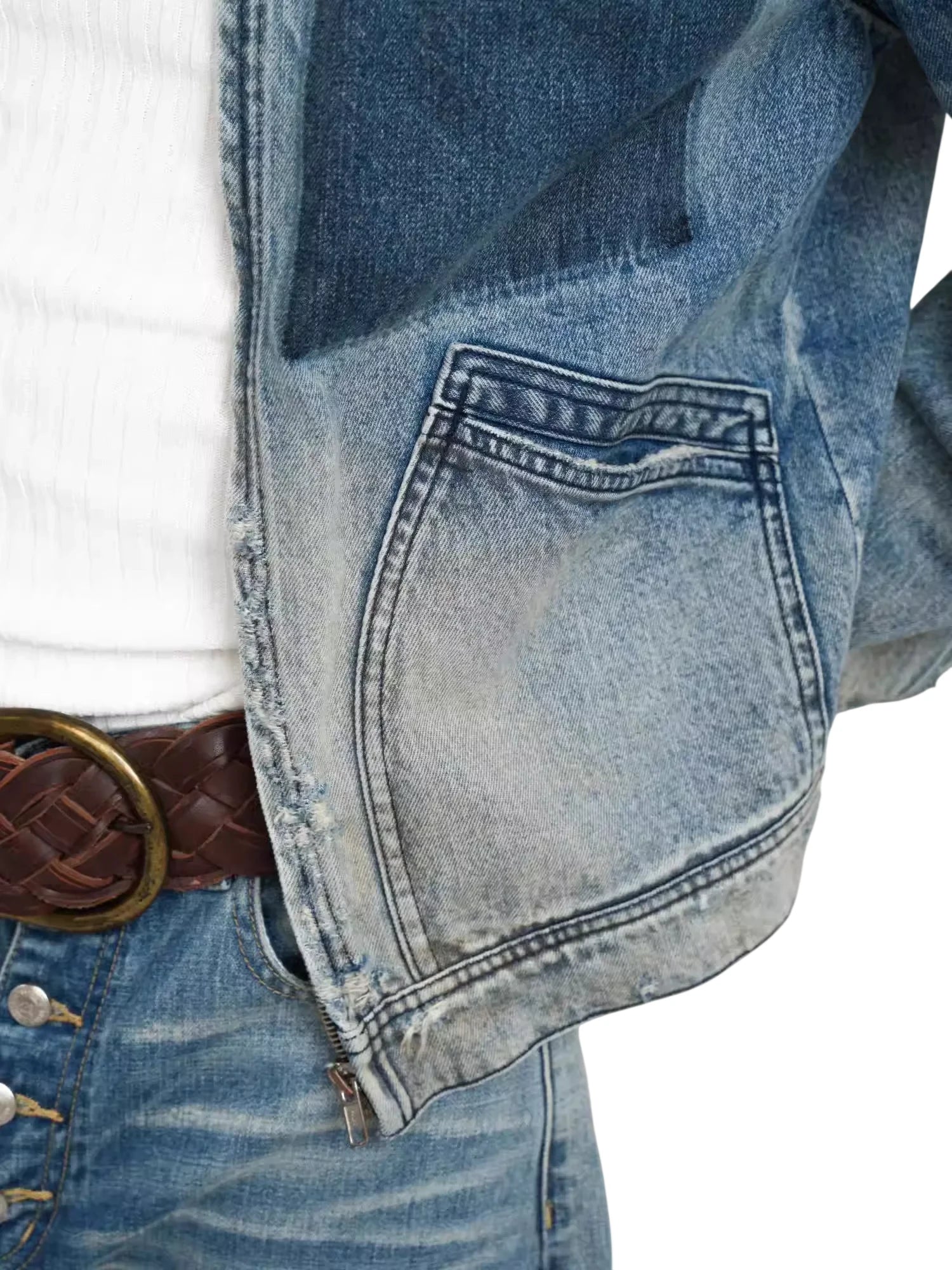 This men's denim jacket features an oversized fit with a gradient wash and distressed detailing for a rugged, seasonal look. Designed for autumn and winter, it includes frayed cuffs, bold seam accents, and a zip-front closure. Perfect for layering over casual outfits, this jacket merges vintage style with modern comfort.