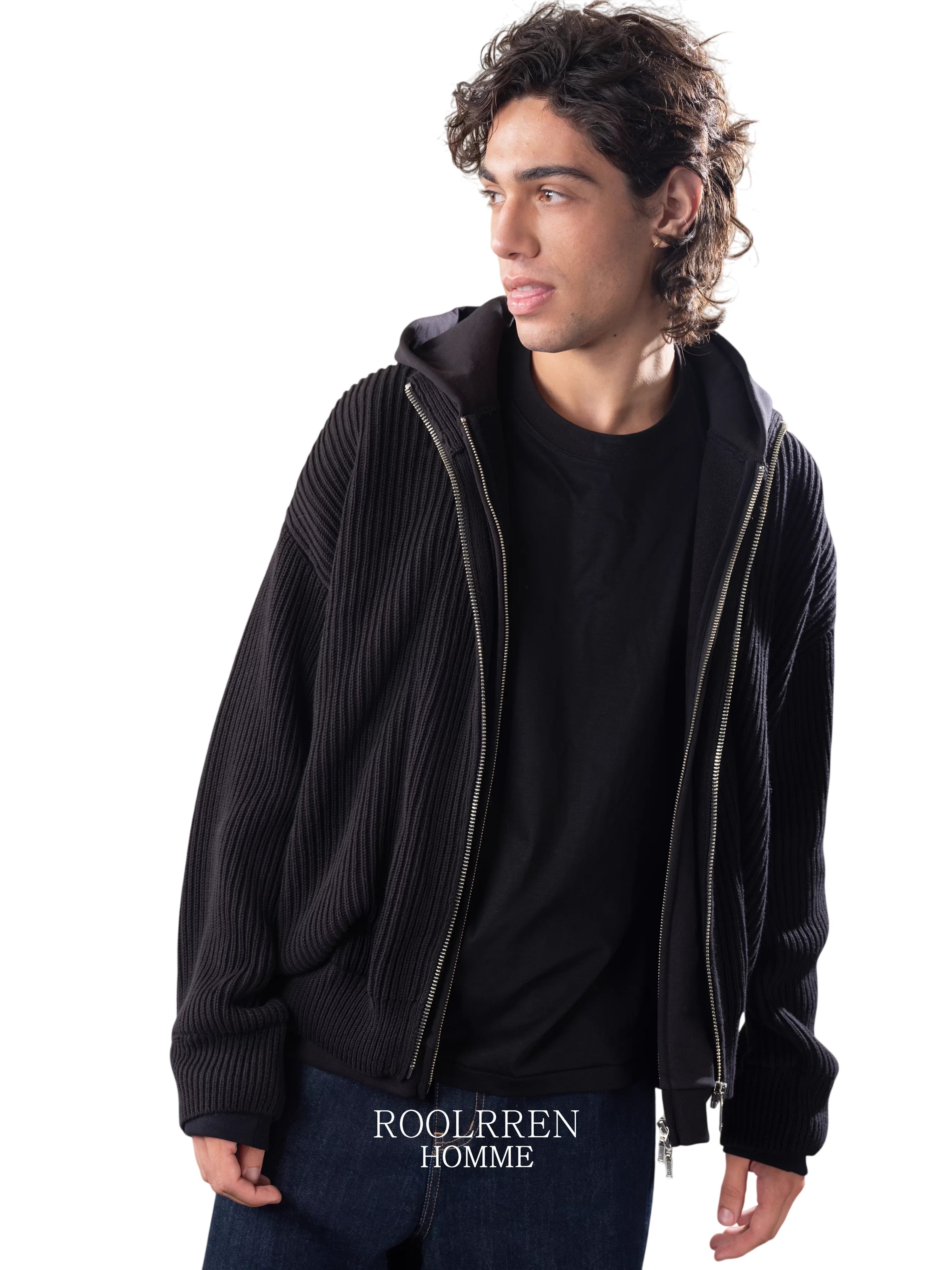 Elevate your everyday style with this men's casual spliced knit jacket. Designed with a layered look, it features a zip-up front, relaxed silhouette, and a hooded inner layer that adds depth and dimension. The chunky ribbed texture enhances visual appeal while maintaining comfort. Perfect for laid-back settings, this piece pairs effortlessly with jeans or joggers for a modern, urban outfit.