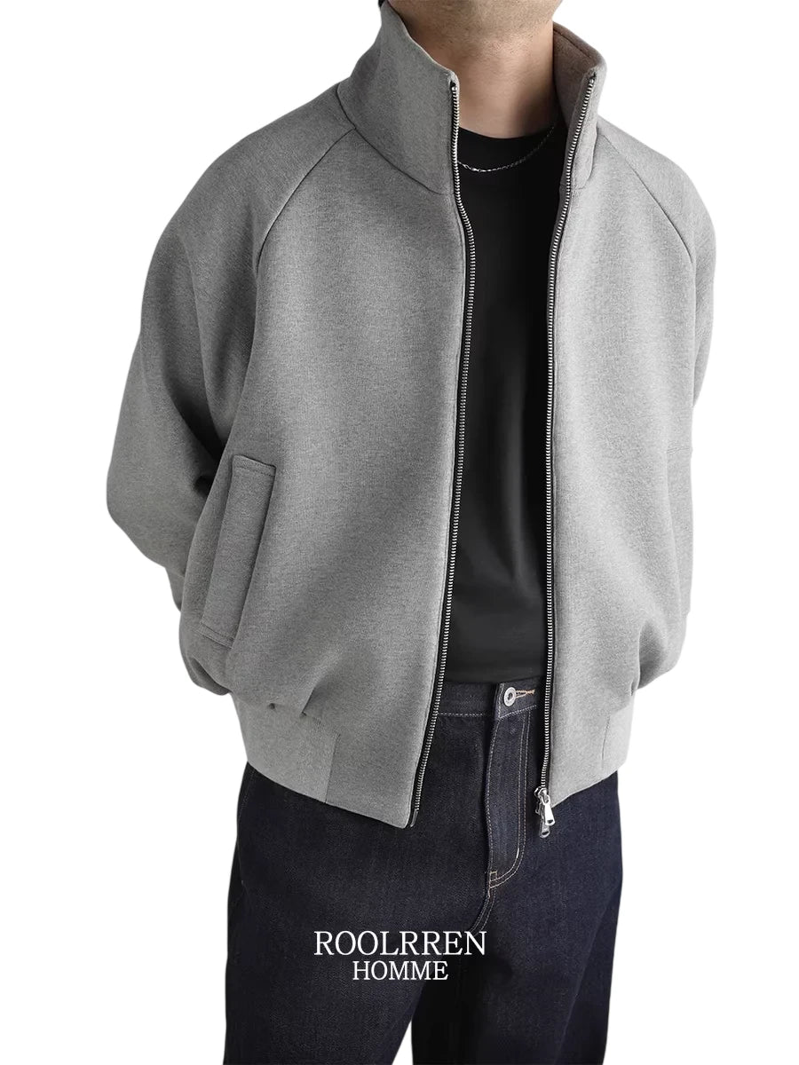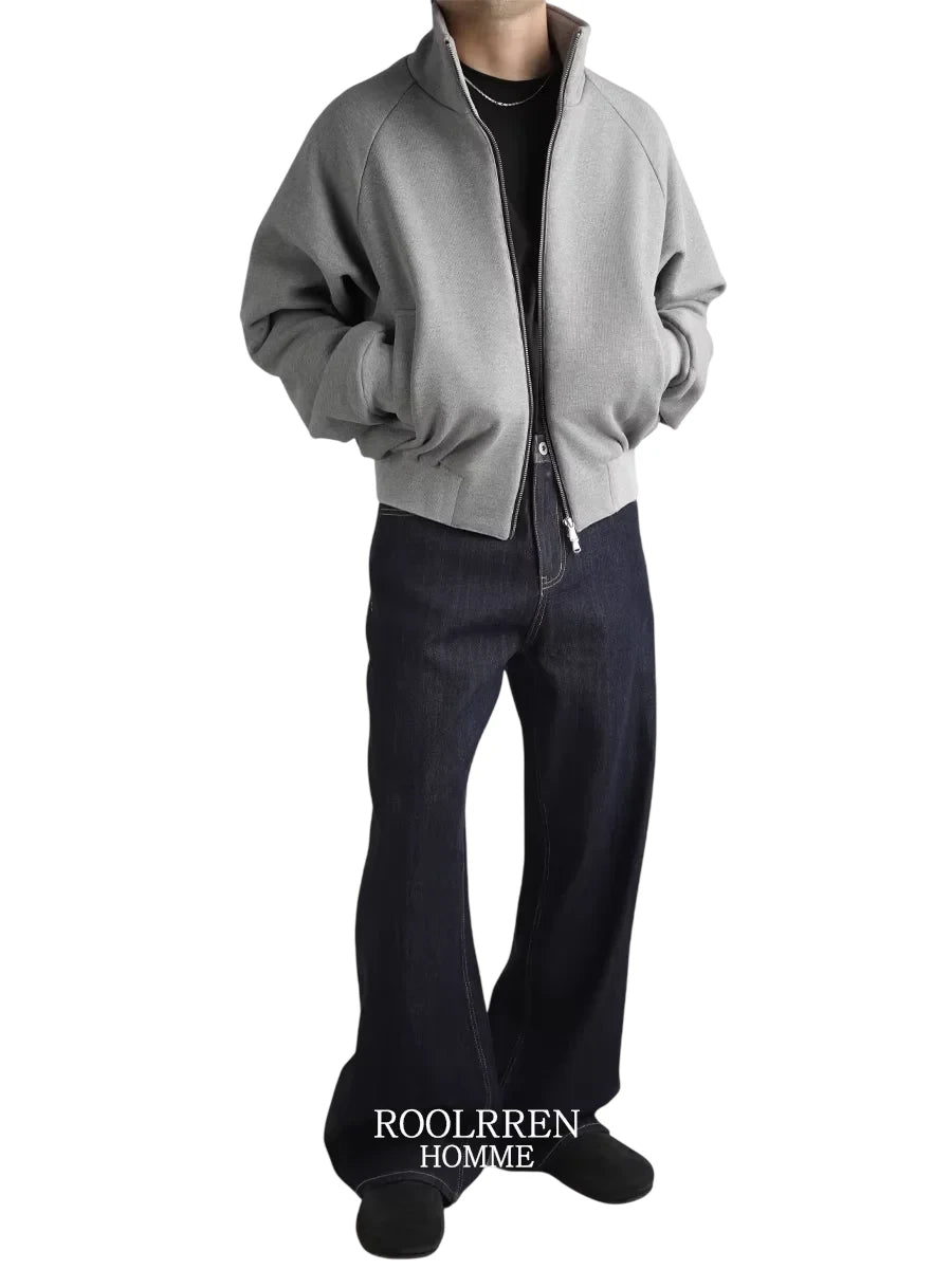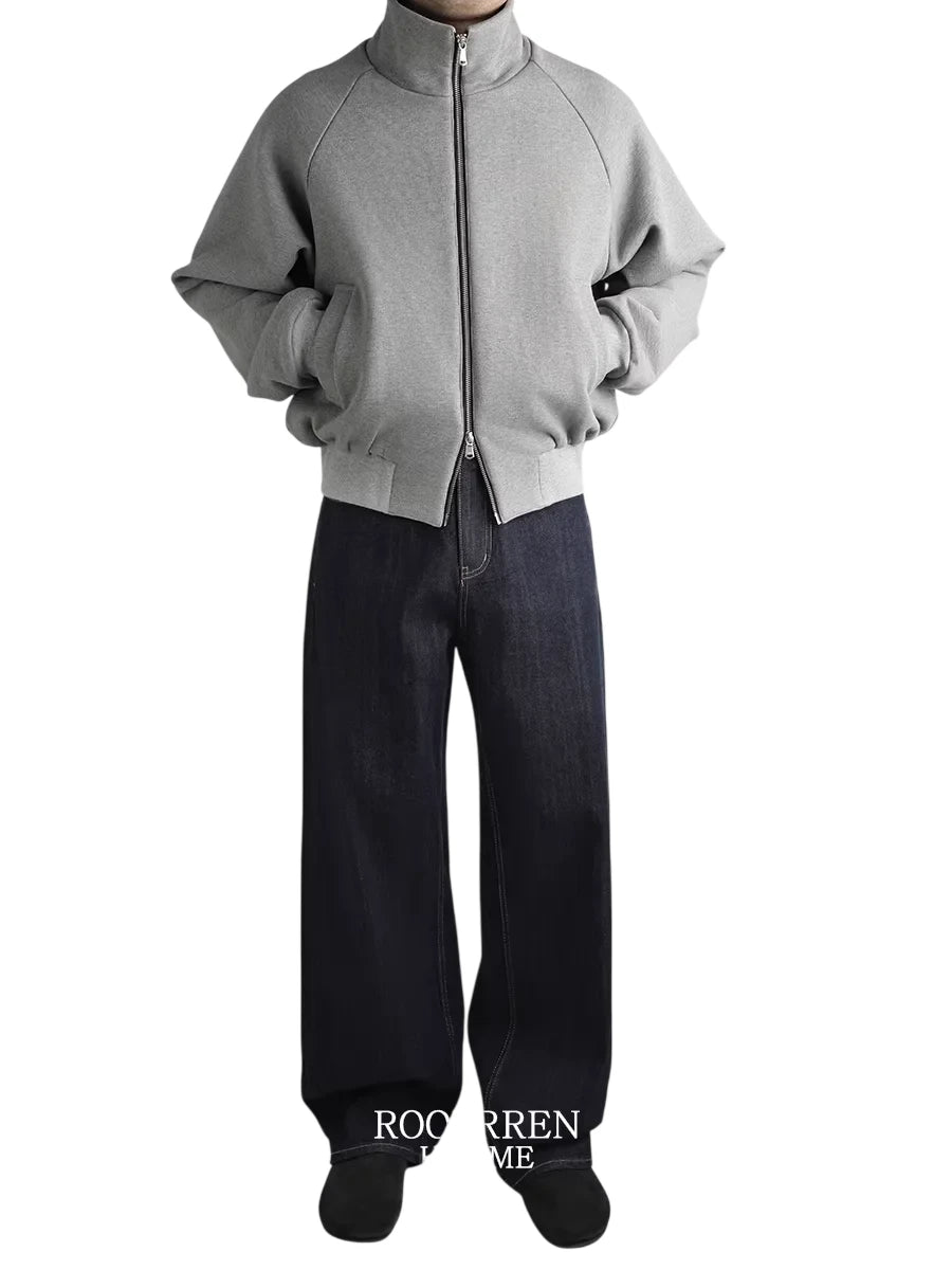 Roolrren homme Men's Oversized Cotton Raglan Jacket with Stand Collar and Double Zipper