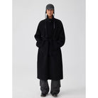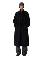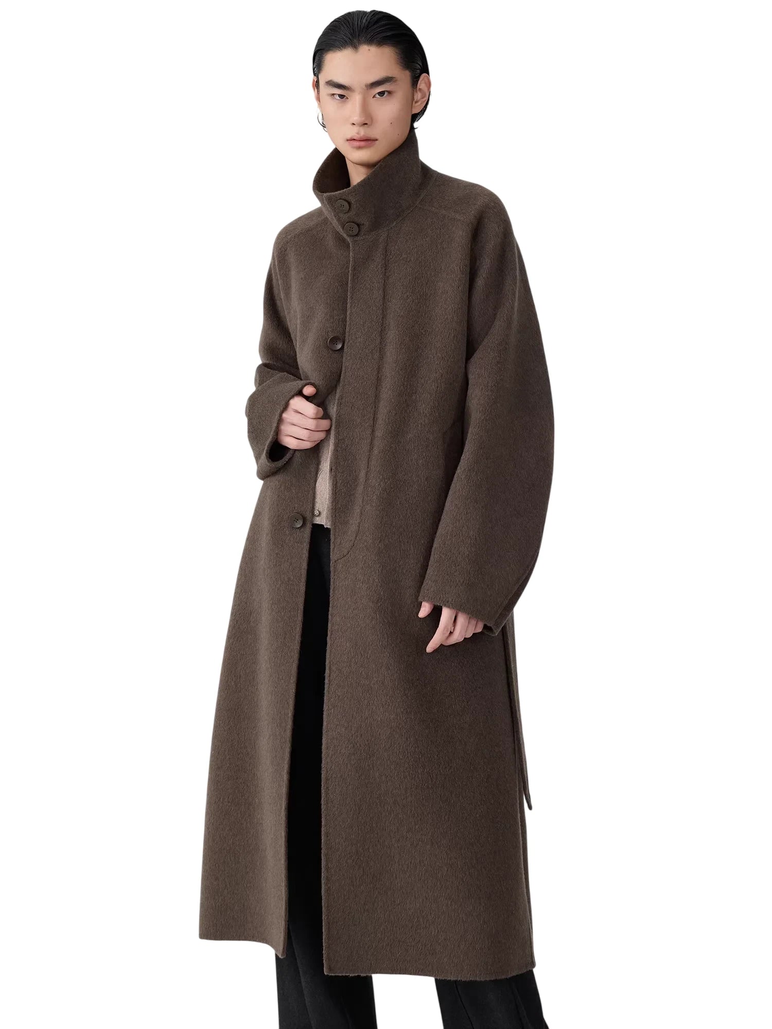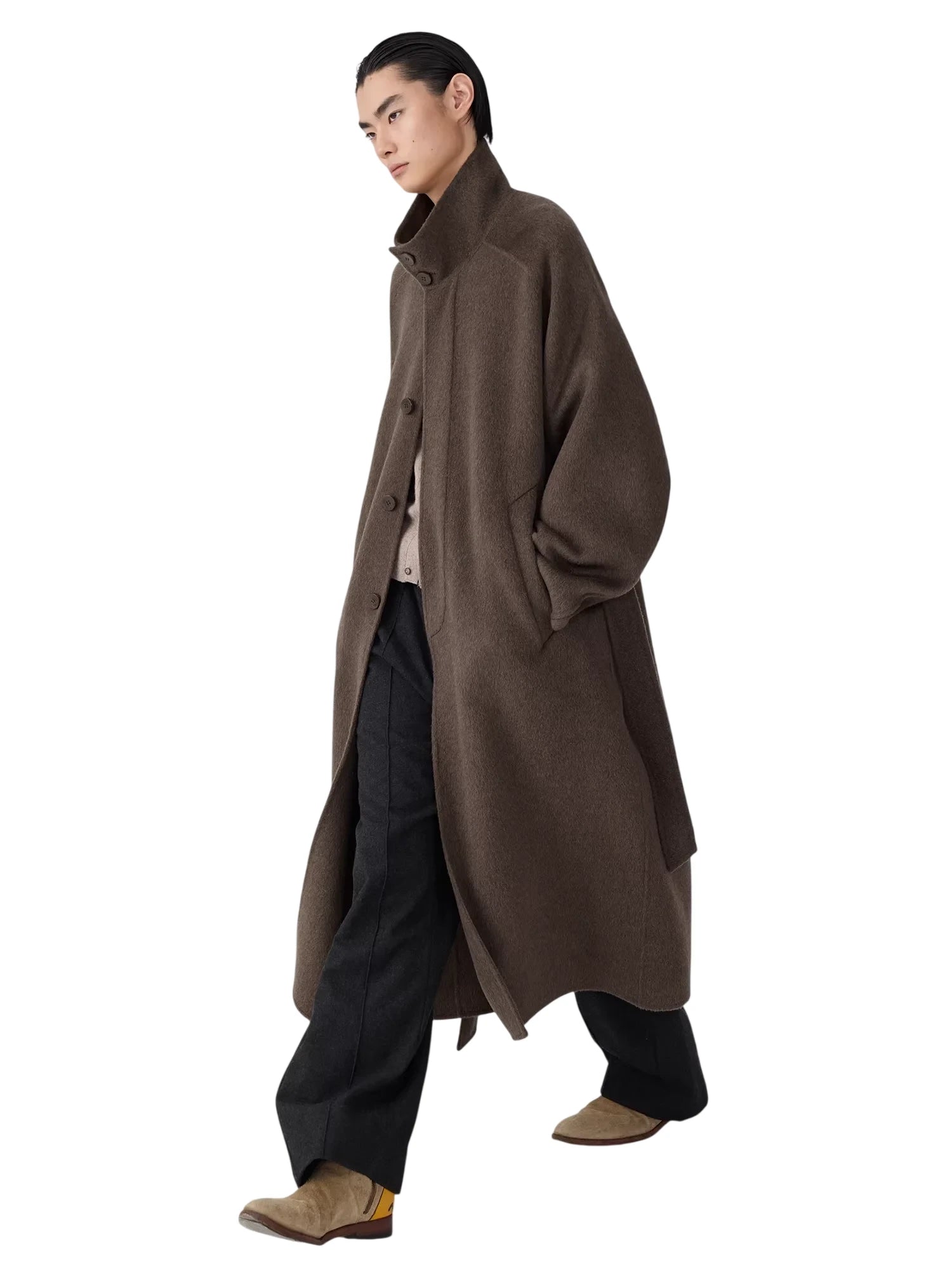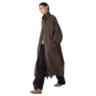 This long, oversized wool overcoat for men features a high-neck collar and button-down front for a sophisticated, structured look. Designed with a relaxed fit, it has dropped shoulders, wide sleeves, and functional side pockets. Ideal for cooler seasons, this coat is styled with contemporary elements for a refined yet casual aesthetic.