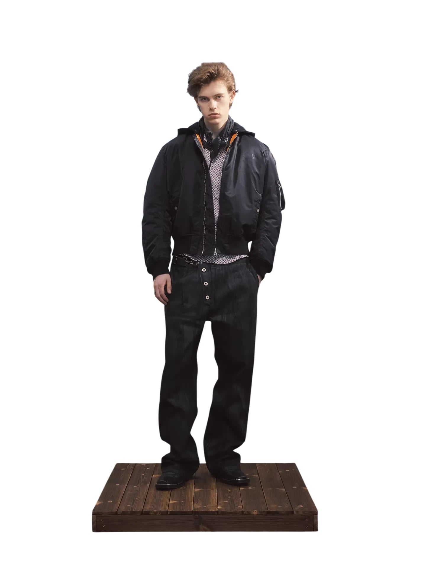 Stay warm and stylish with this men's black hooded bomber jacket, designed for autumn and winter wear. Crafted with a sleek satin-like finish, it features a full front zip closure, ribbed cuffs and hem for a snug fit, and two buttoned front pockets for convenience. A utility zip pocket with compartments on the sleeve adds functional detail, while the striking orange inner lining offers a bold contrast. Streetwear-inspired elements and subtle chest branding complete the look.