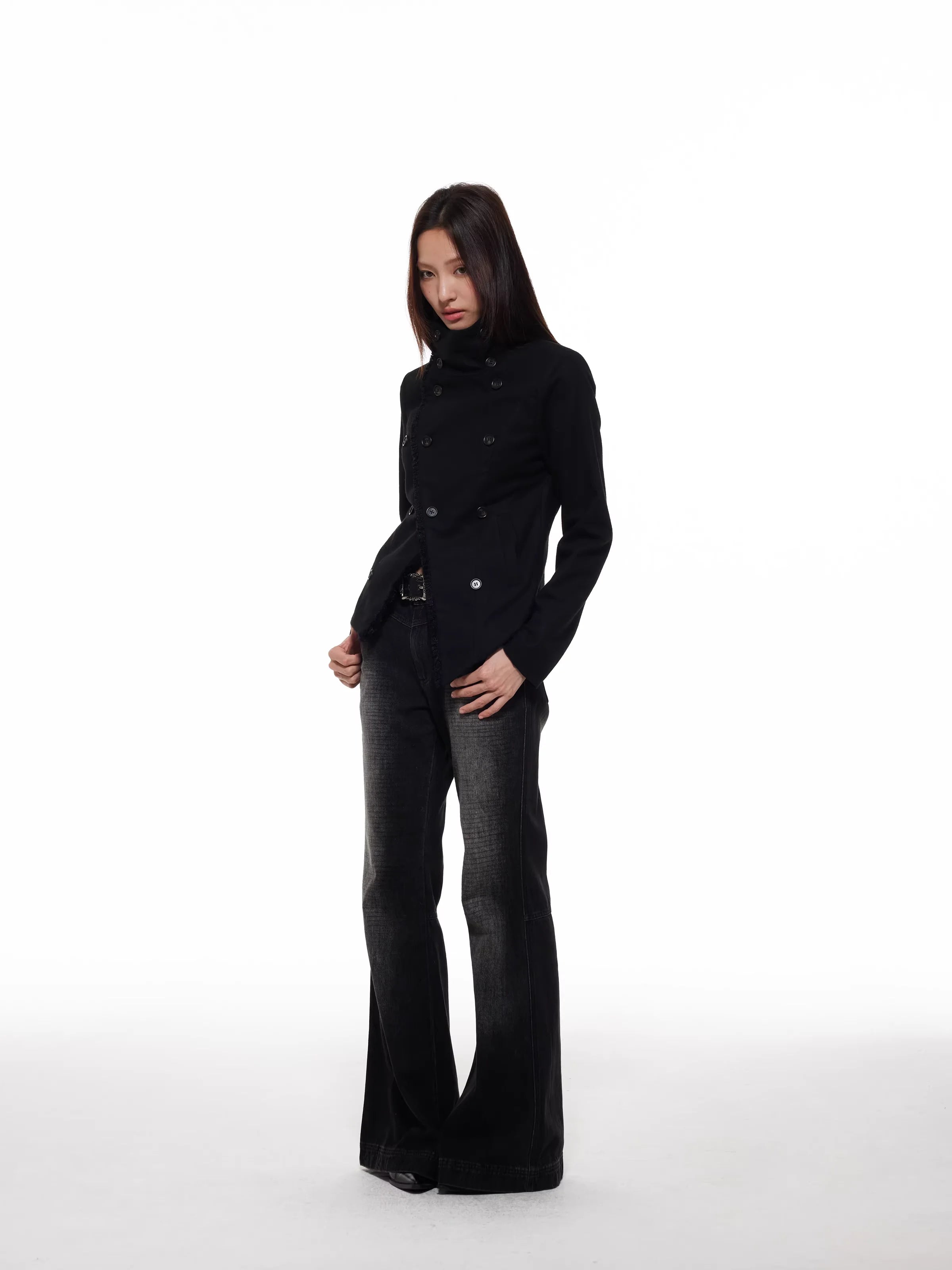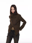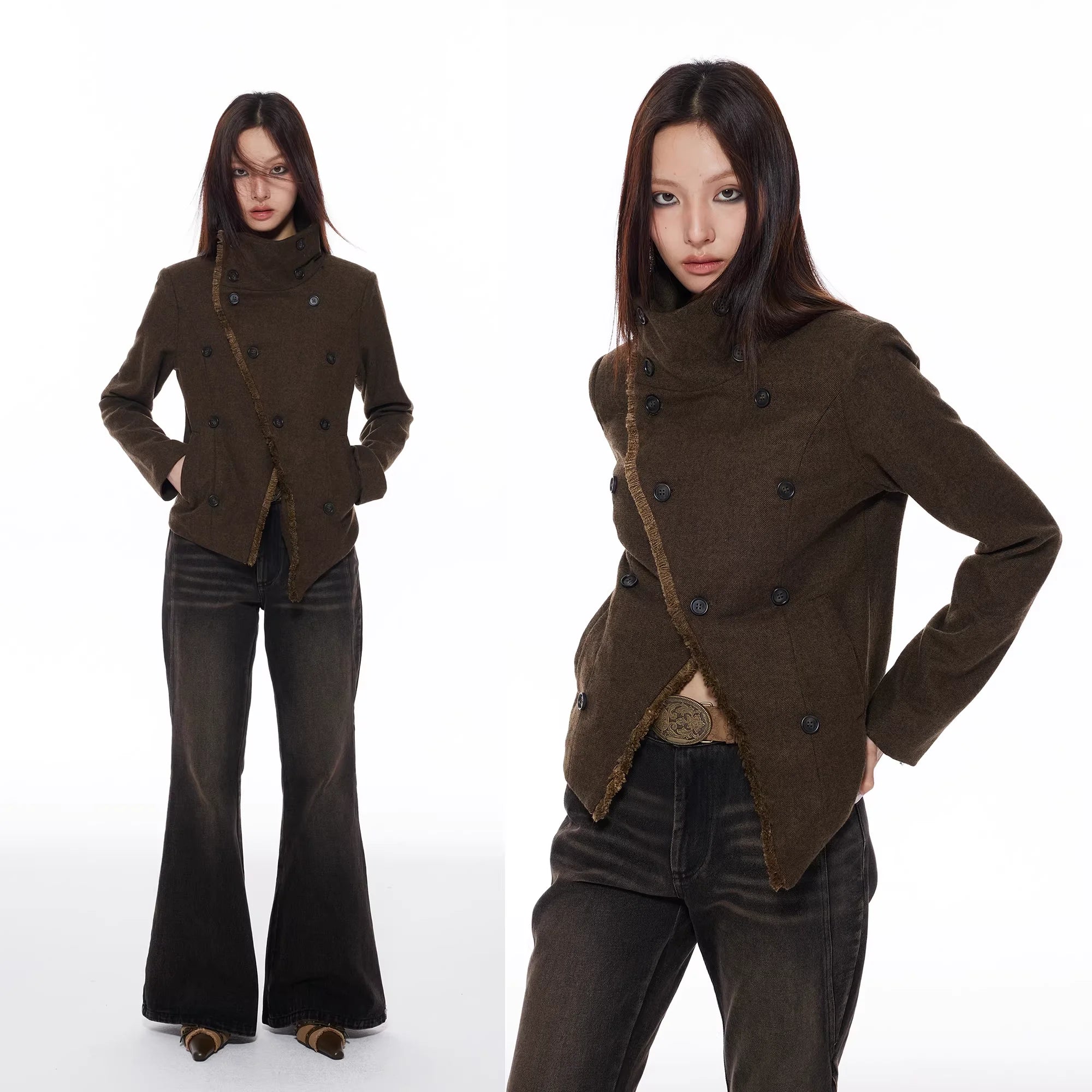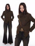 Elevate your autumn and winter wardrobe with this women's slim fit double-breasted wool coat. Designed with a structured silhouette, the jacket features an asymmetrical front closure and a high-neck collar that adds a tailored touch. The dark olive-brown wool is complemented by bold black buttons and a contrasting fuzzy brown lining or trim, offering both warmth and visual interest.