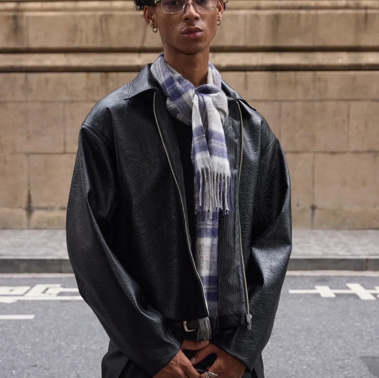 This men's short faux leather jacket features a refined matte texture and a wide-cut silhouette for a contemporary look. It is designed with a silky striped inner lining that adds a touch of classic sophistication. The zip-up closure and subtle sheen enhance its polished appearance, making it suitable for both casual and elevated urban ensembles.