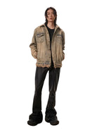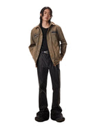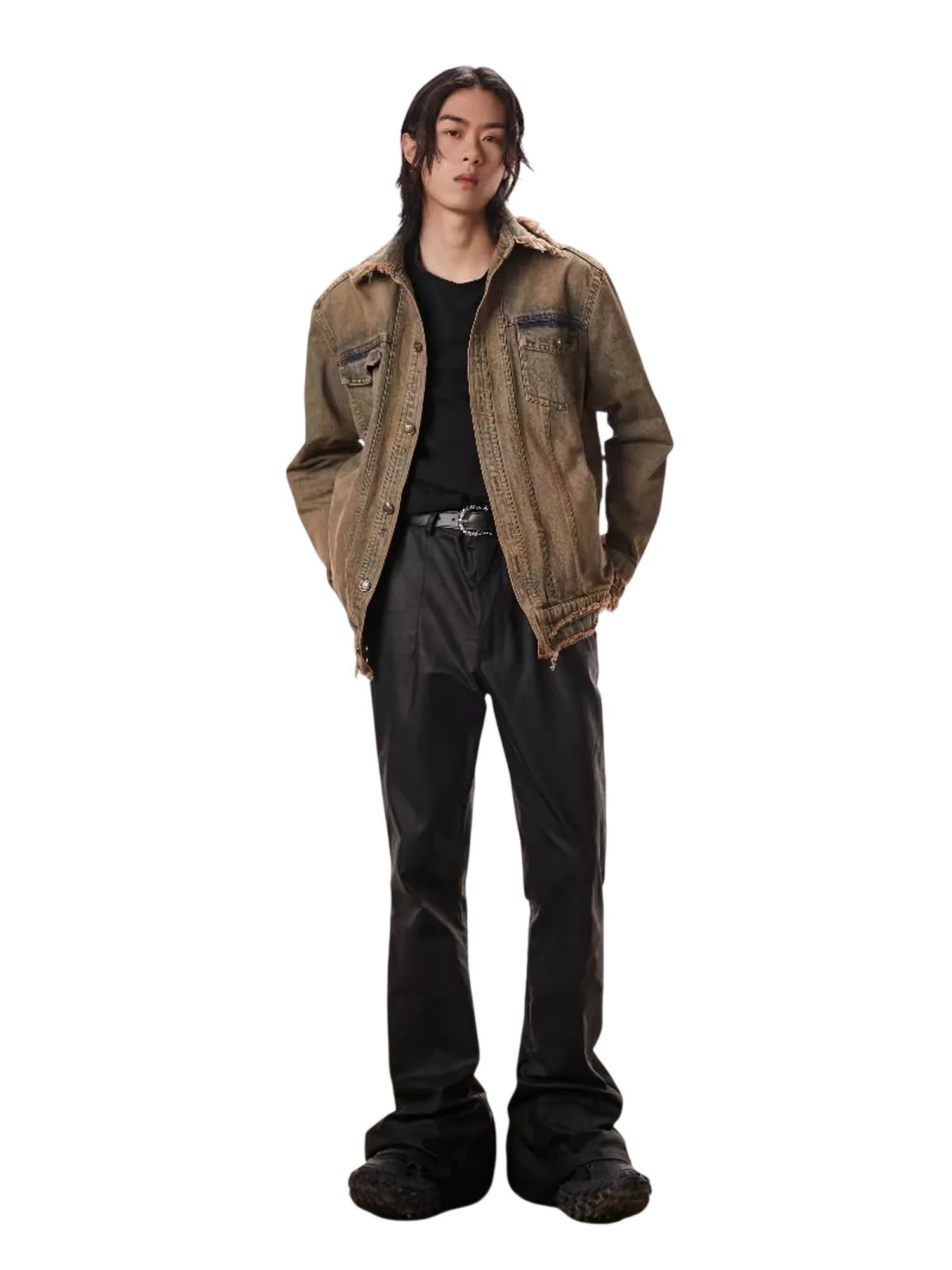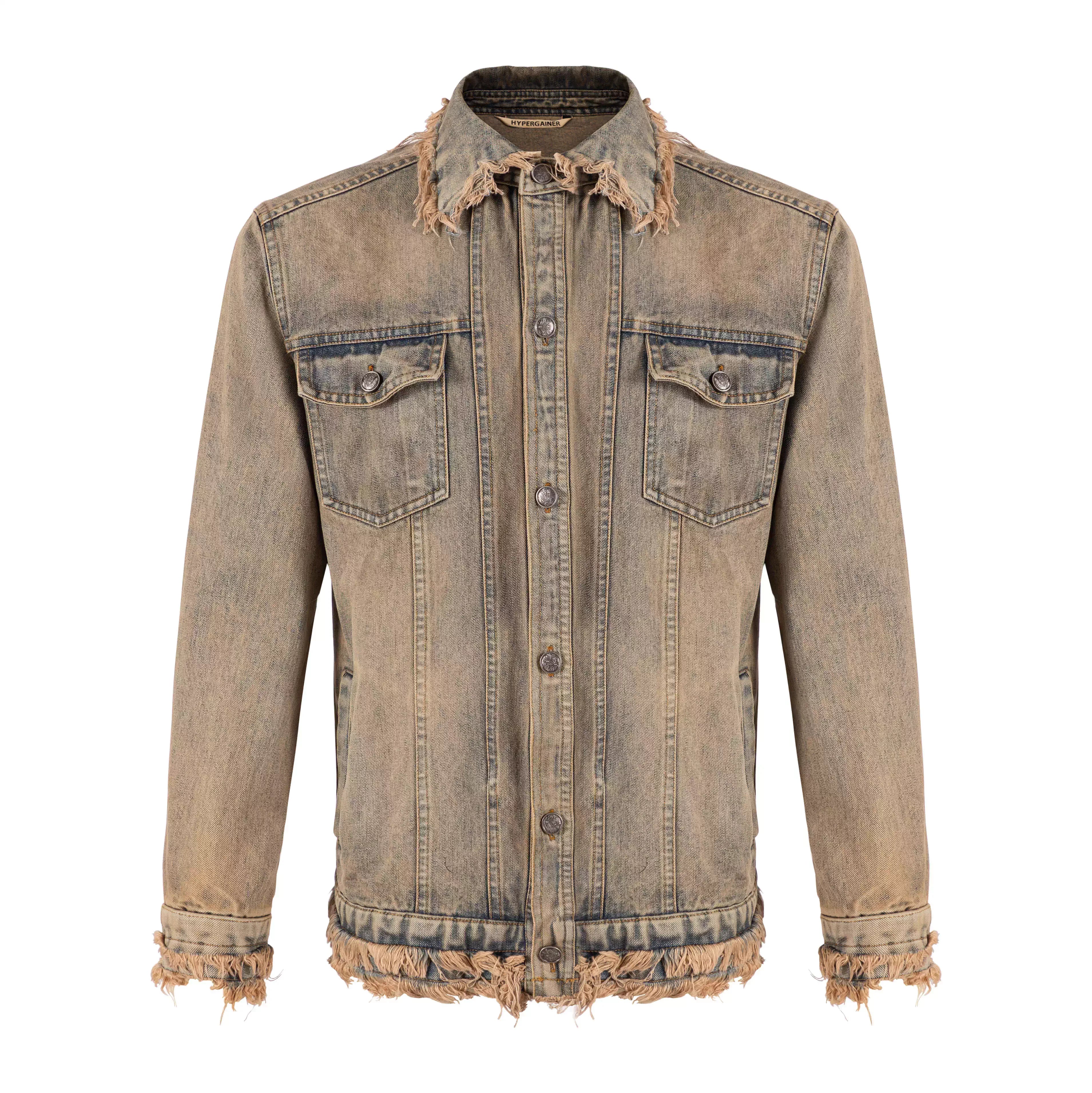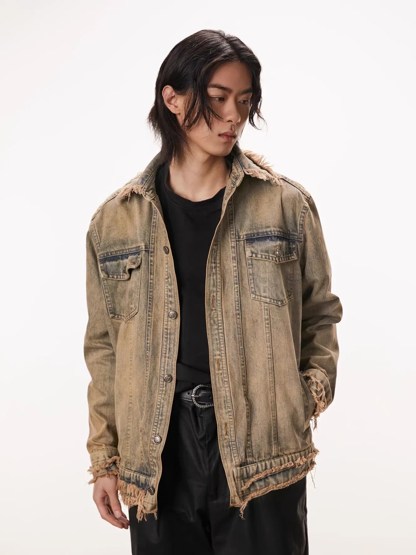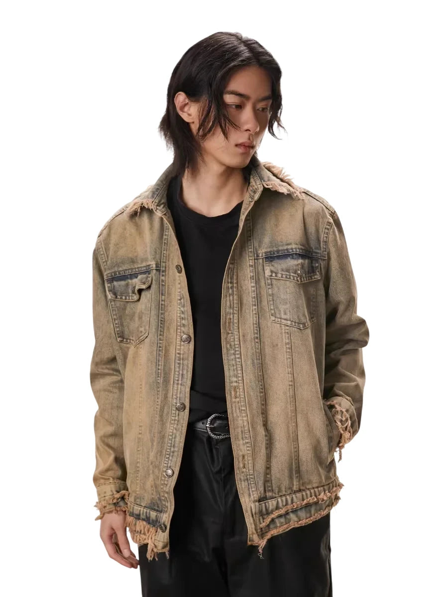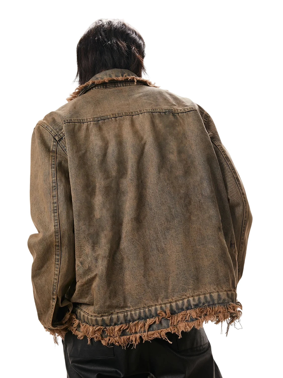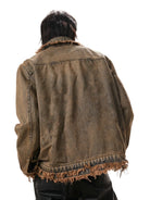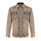 This men's denim jacket features a vintage-inspired design with a distressed, worn-brown wash that adds character and edge. Crafted for a high-rise fit, the jacket includes frayed details at the hem, cuffs, and collar for an authentic rugged look. It is designed with classic details such as two button-flap chest pockets and a front button-up closure, enhanced by visible stitched seams for added texture and depth. Perfect for layering over monochrome ensembles, this jacket is a standout staple for bold, casual style.